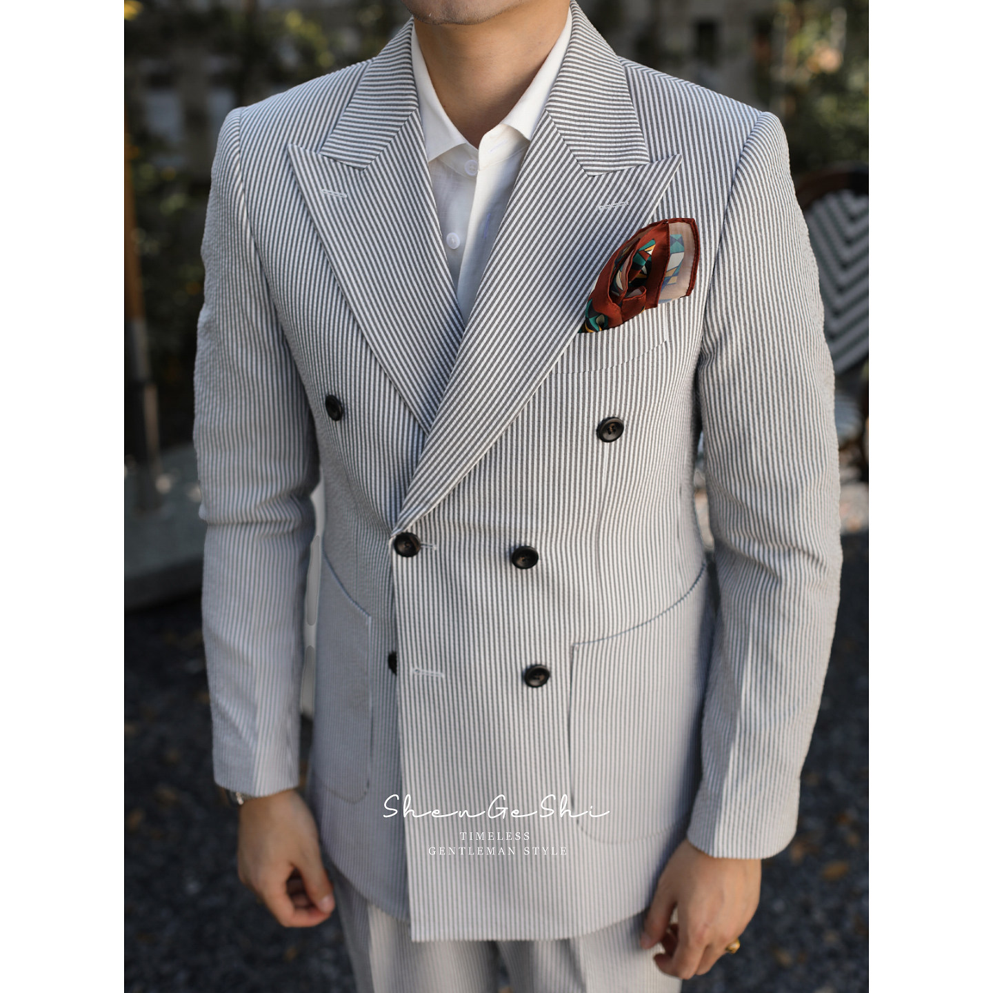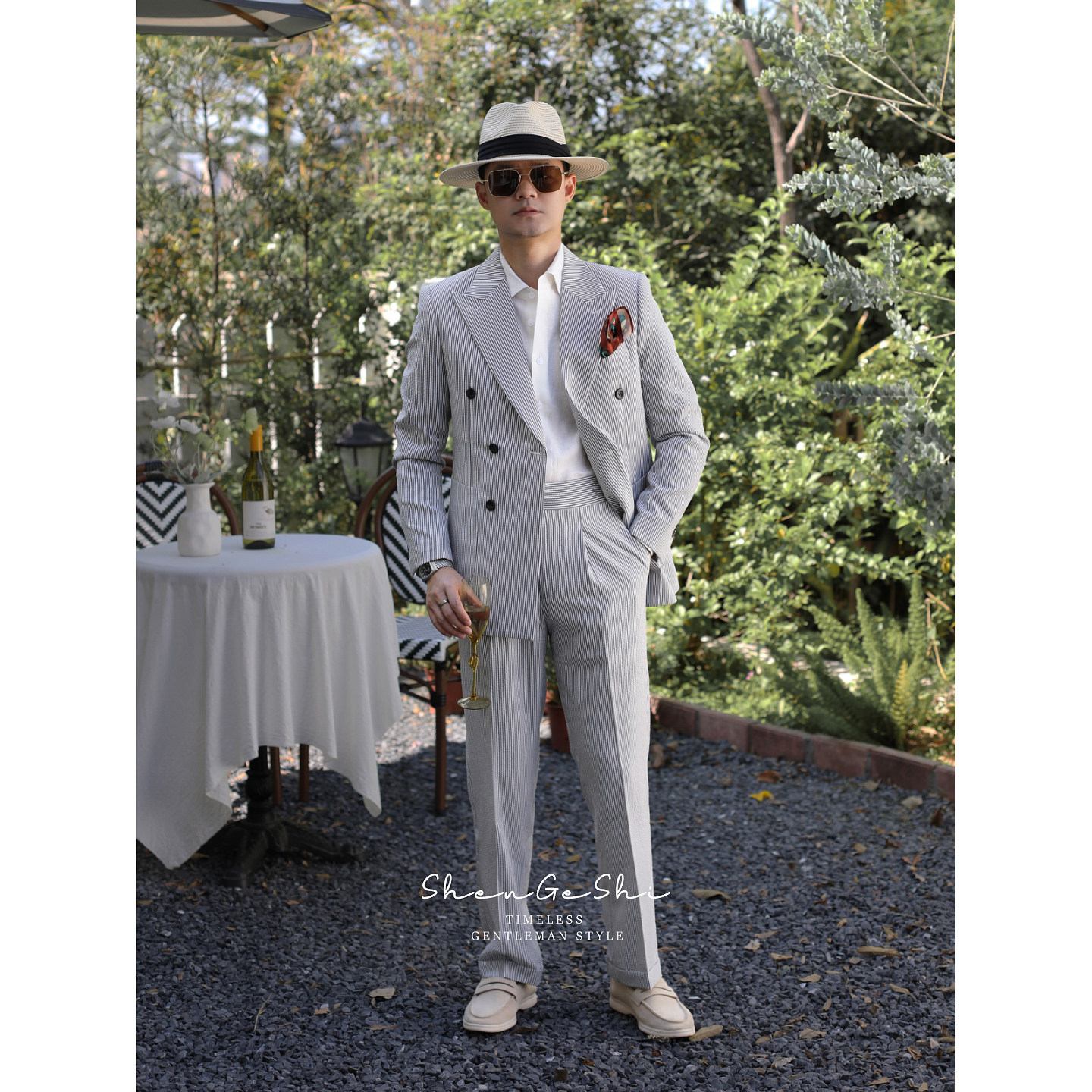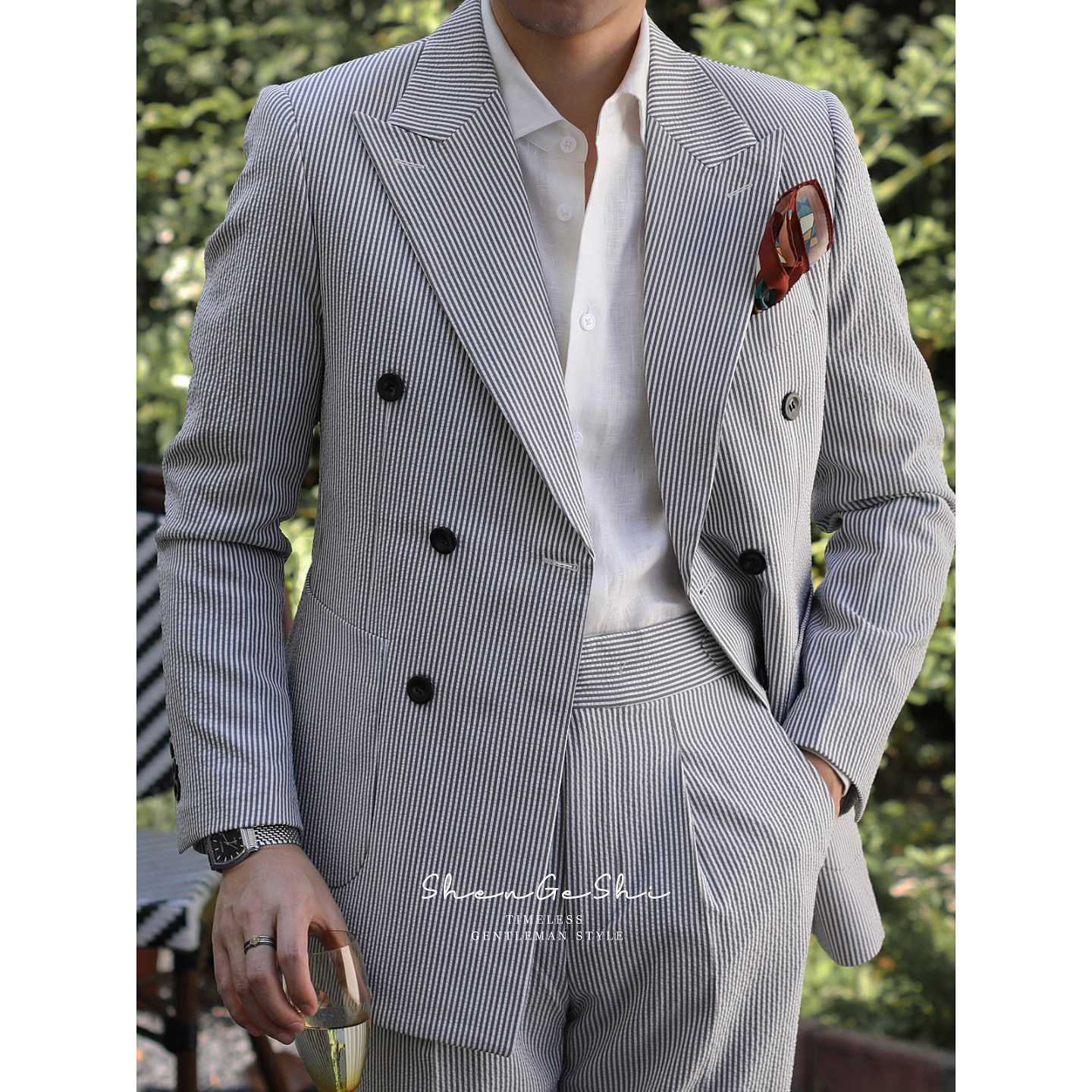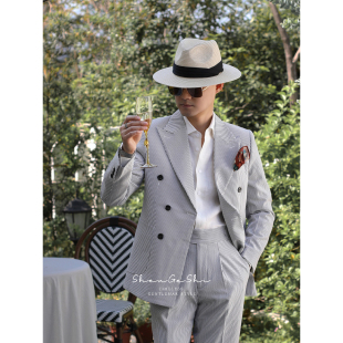 西服两件套装 结婚绅士细条纹抗皱修身 绅士双排扣西装 泡泡纱意式