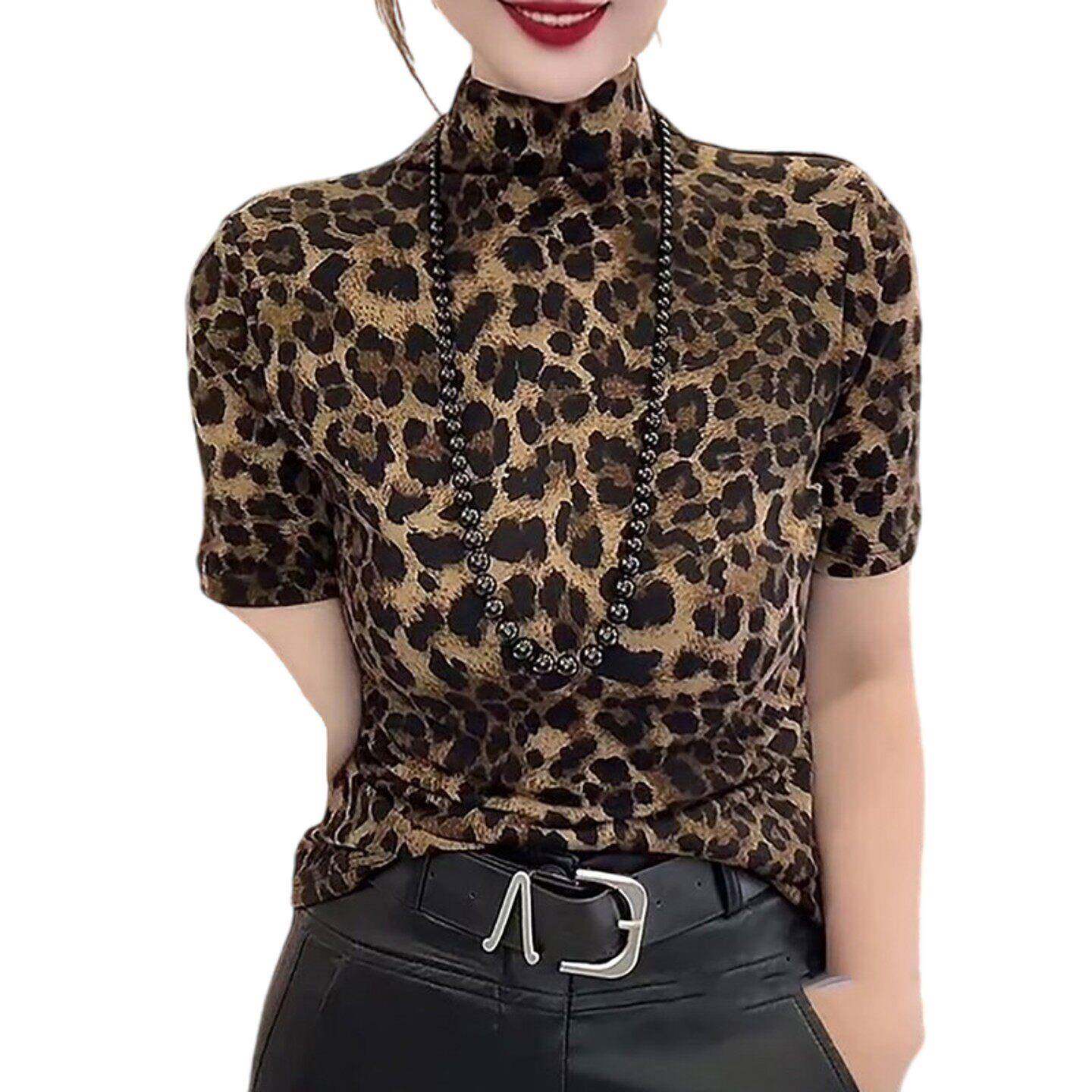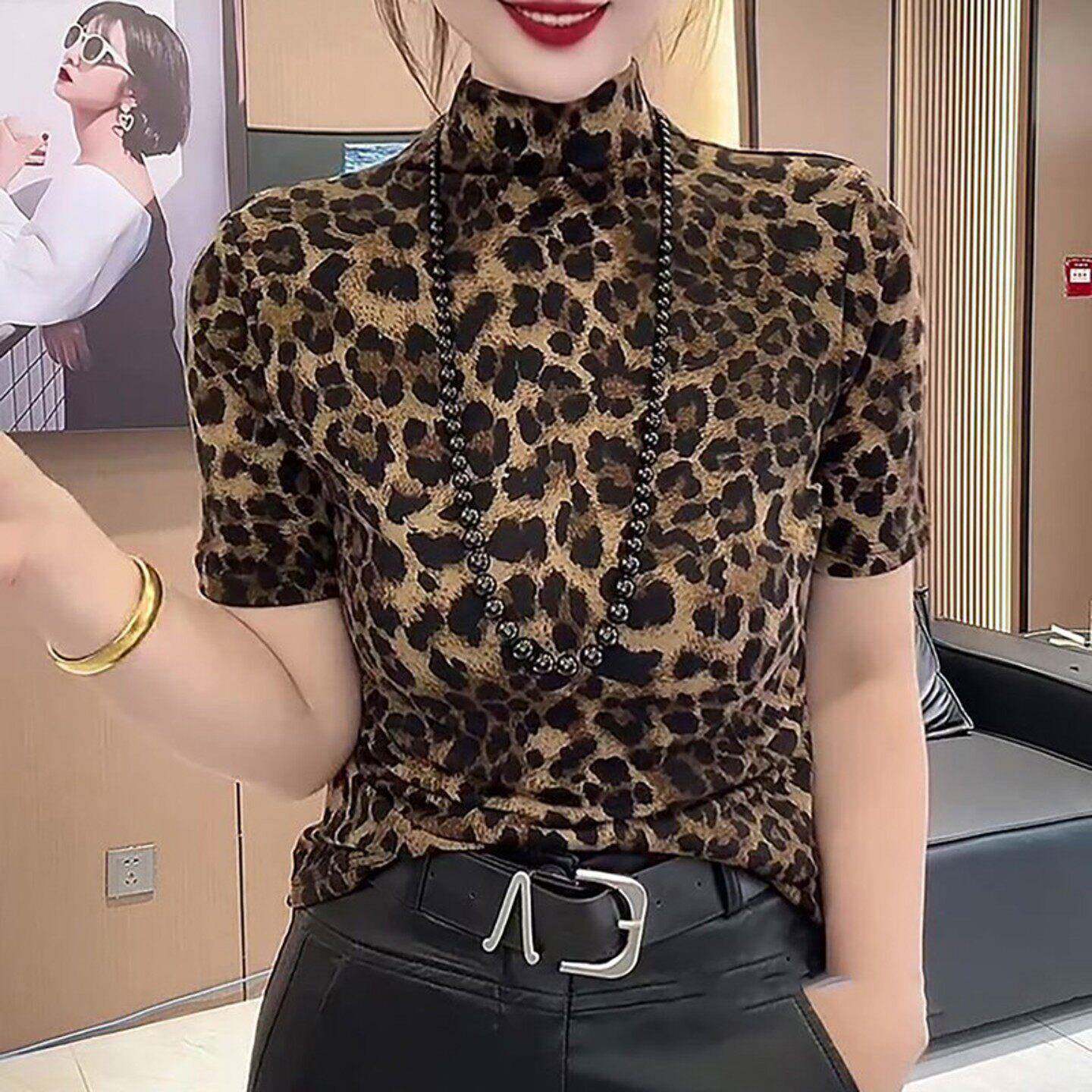 显瘦打底衫 T恤女2026新款 时髦0325z1 欧洲站豹纹高领短袖 时尚