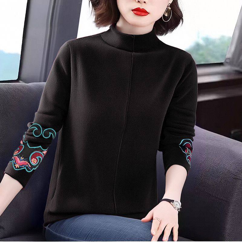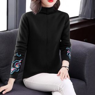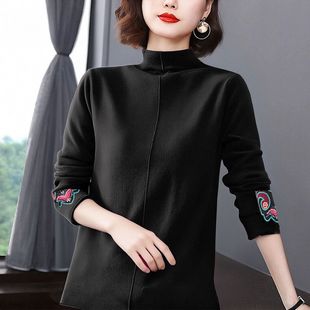 中式 修身 上衣半高领德绒打底衫 女装 国风民族风t恤长袖 大码 秋冬季