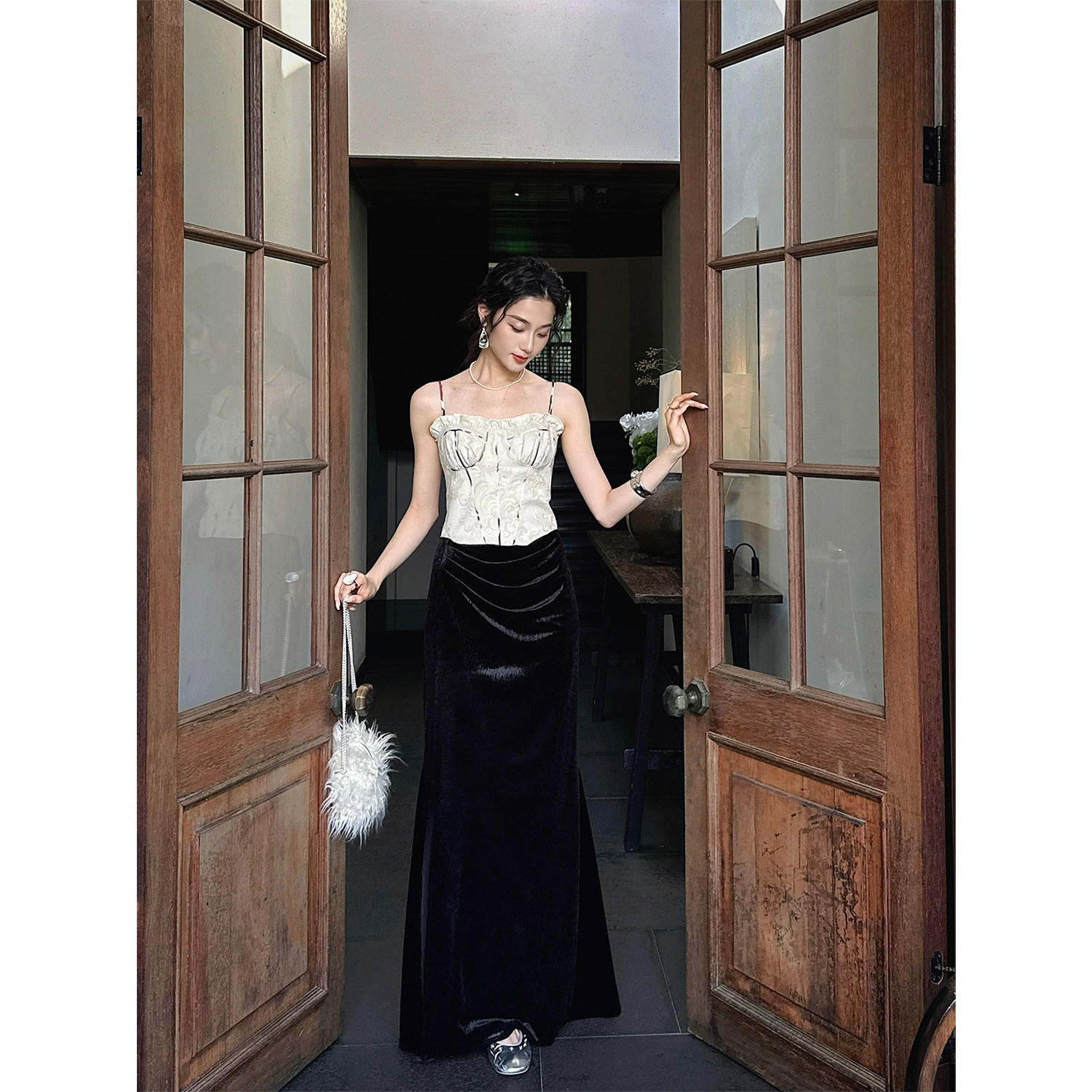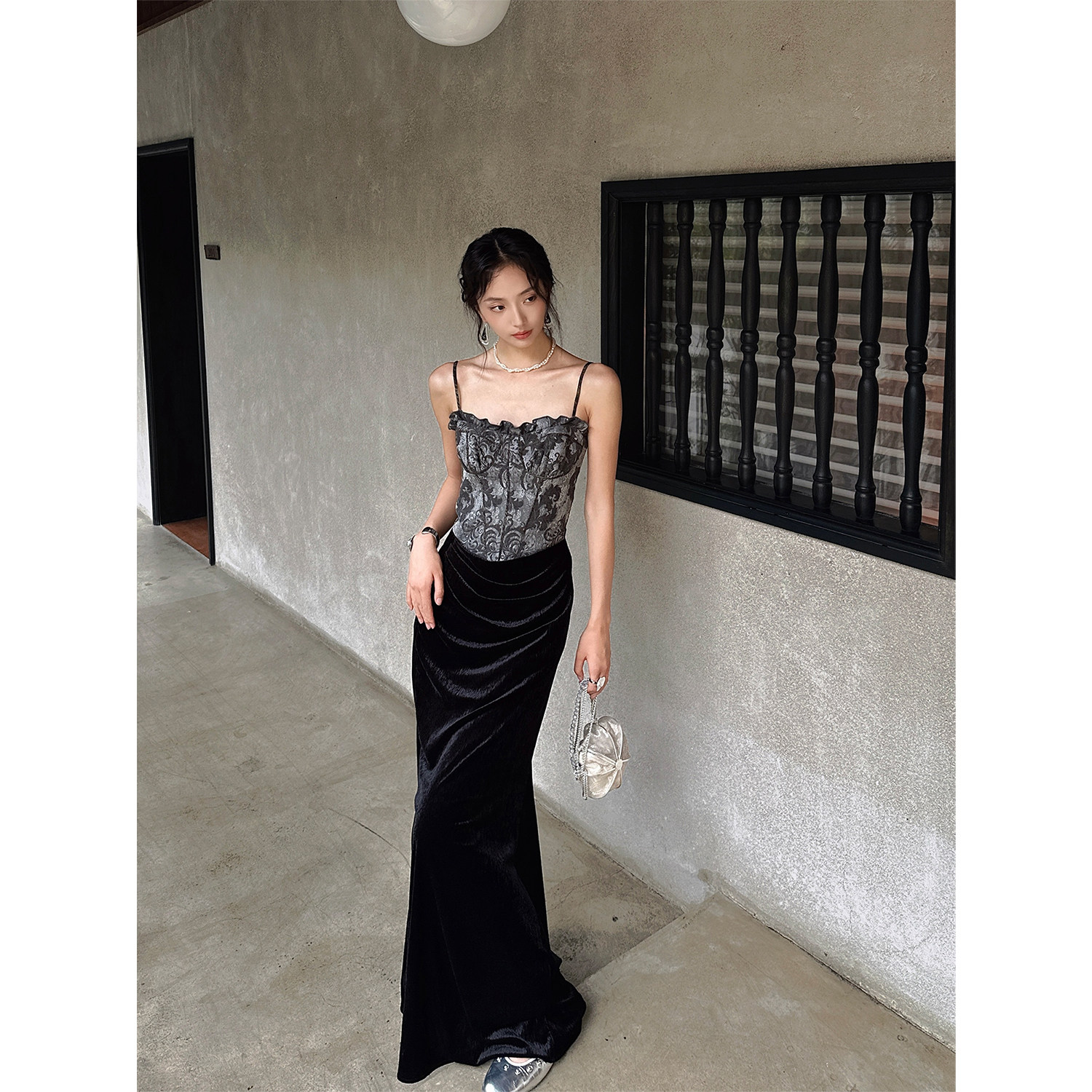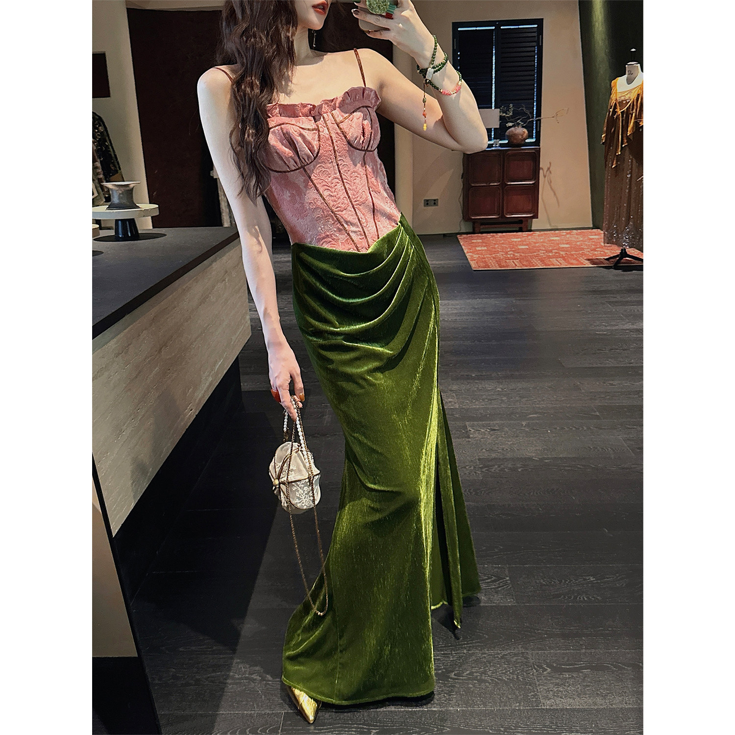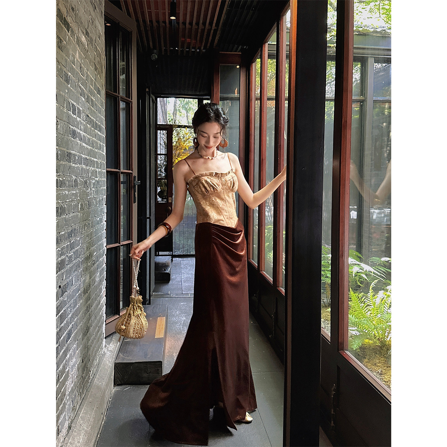 扎染吊带连衣裙子假两件拼接丝绒长裙 叙兰时 呼呼专享