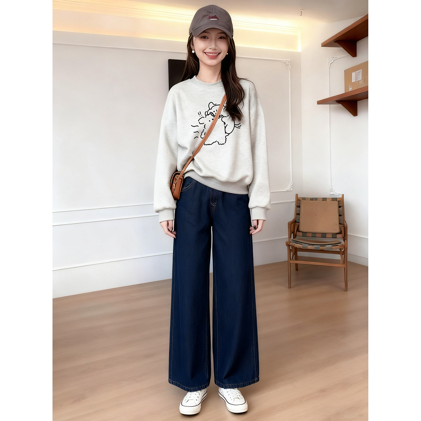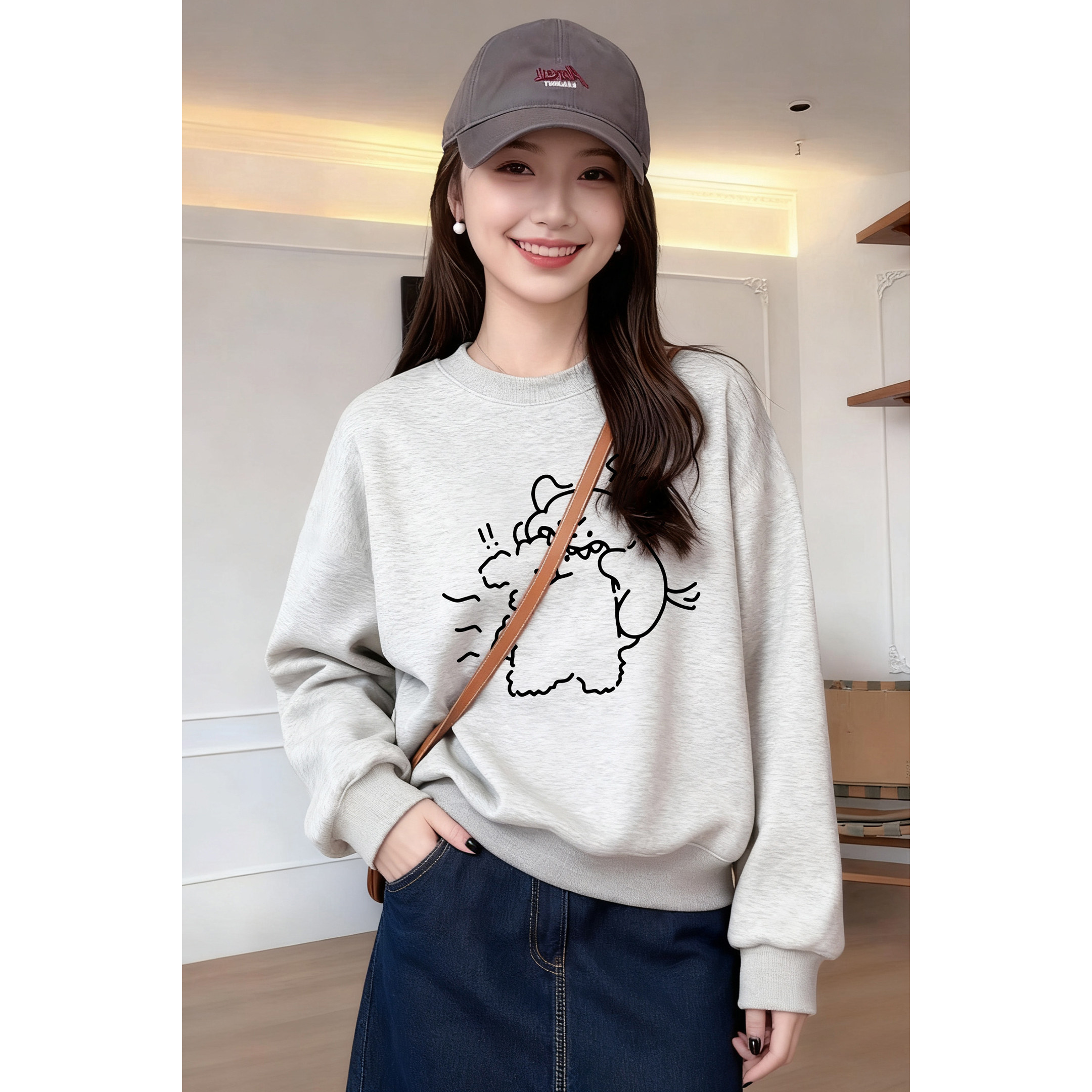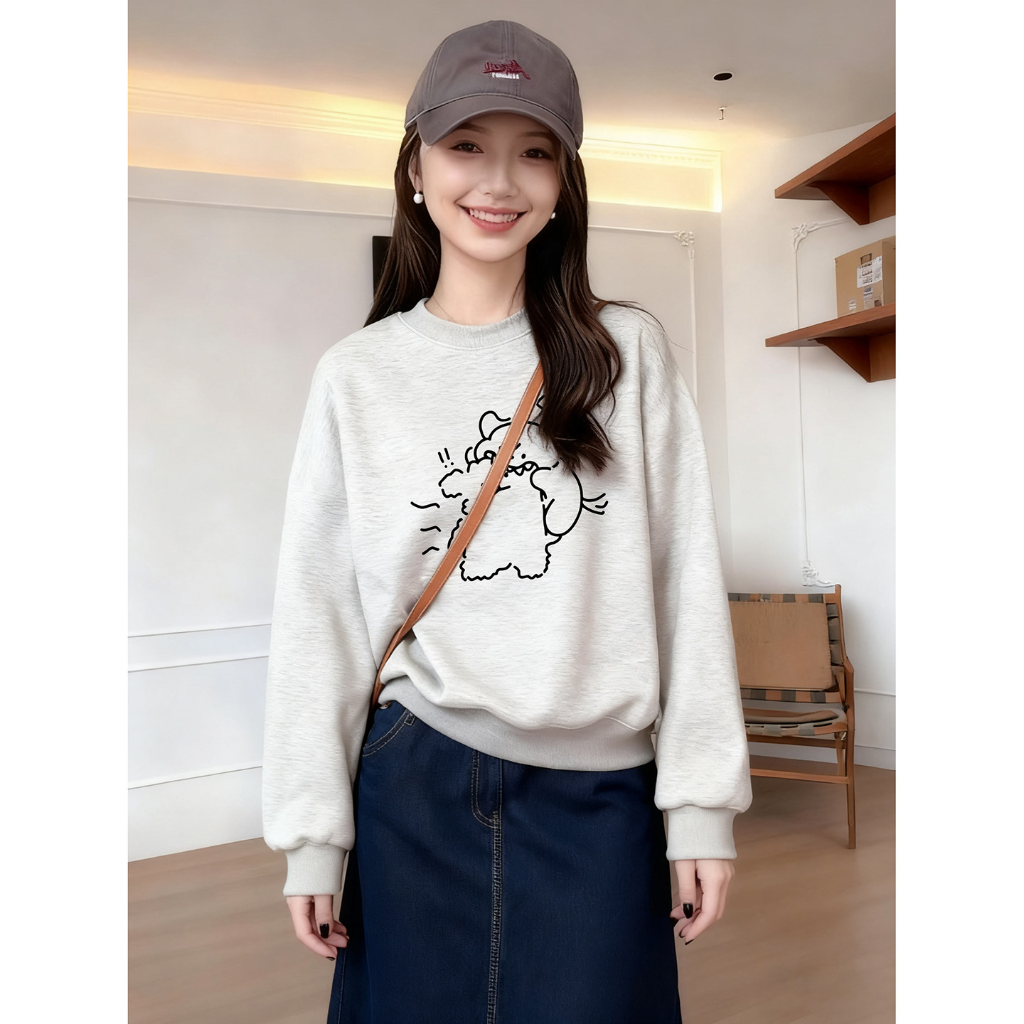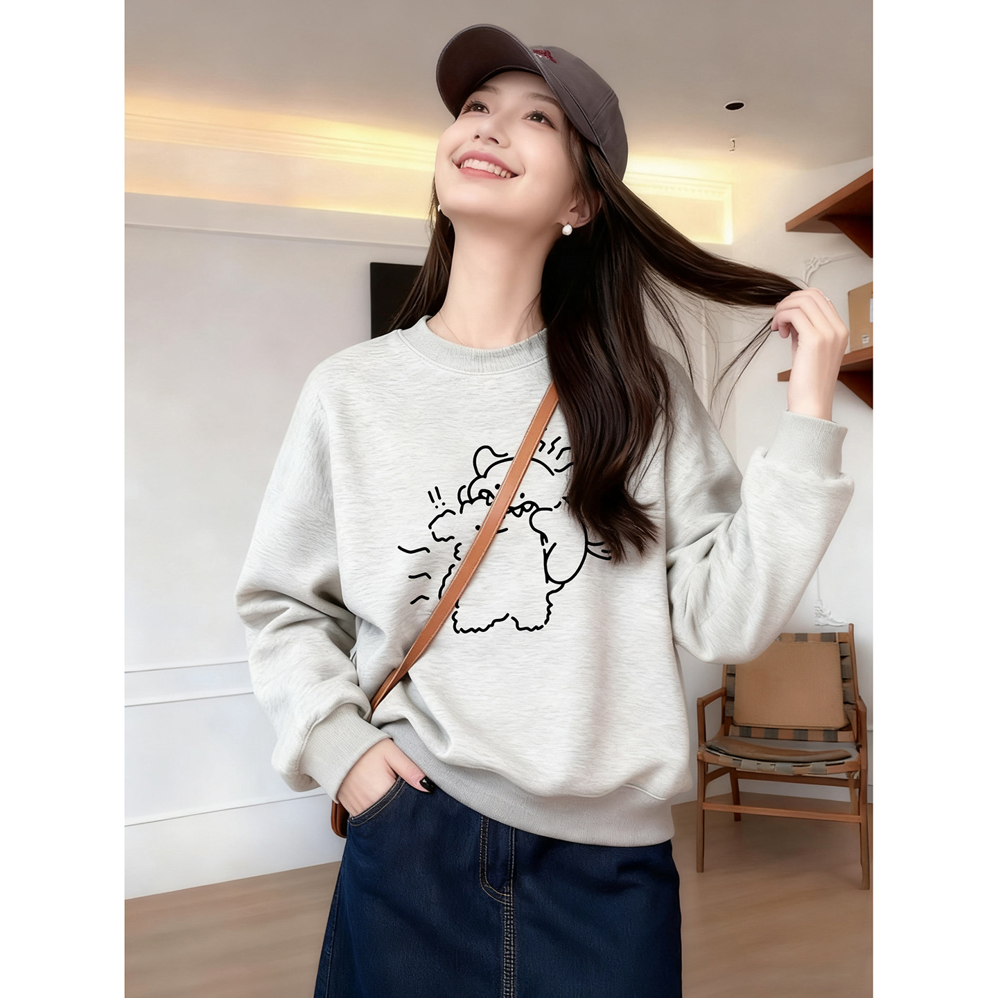 白灰色圆领无帽正肩卫衣女2025新爆款 宽松加绒加厚卡通印花上衣冬