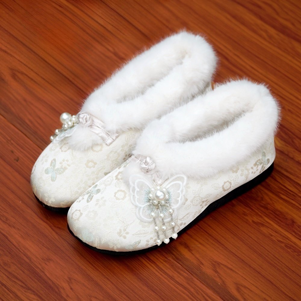 内增高明制古代古装 子女绣花鞋 布鞋 汉元 冬季 素加绒棉鞋 古风汉服鞋