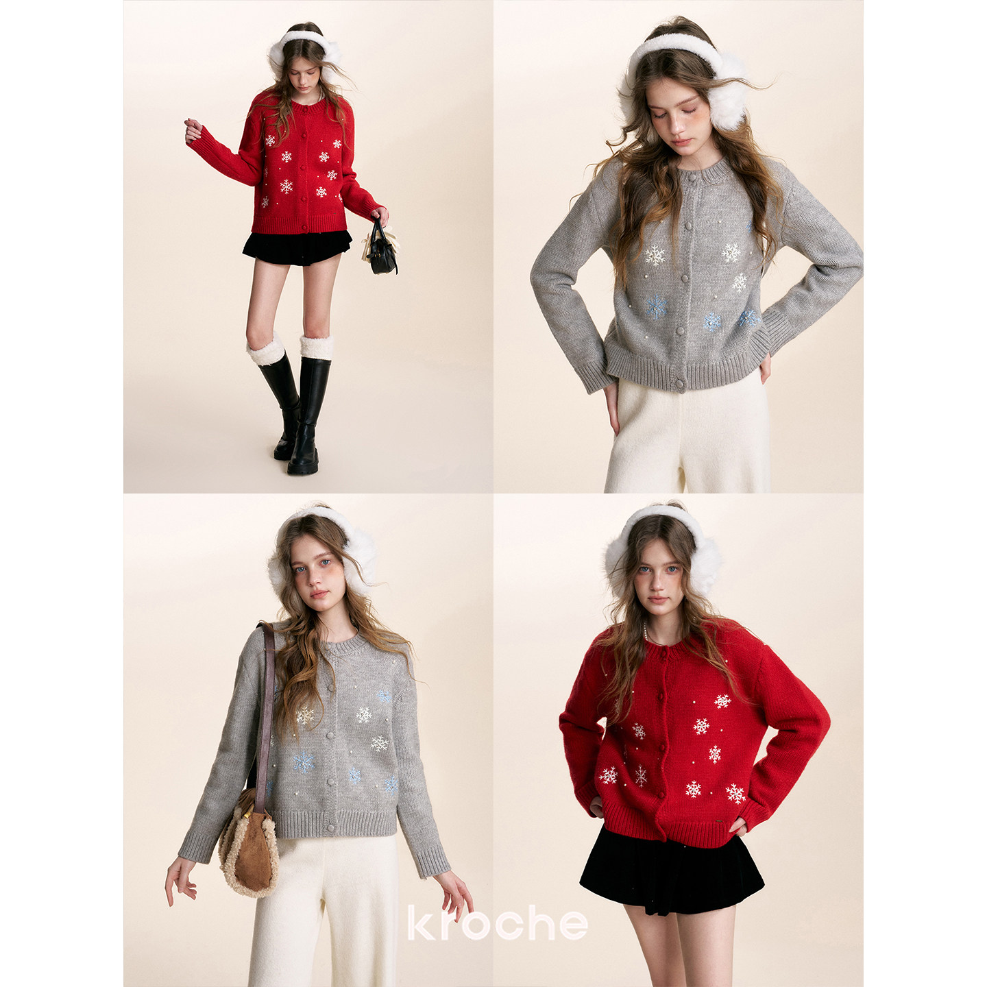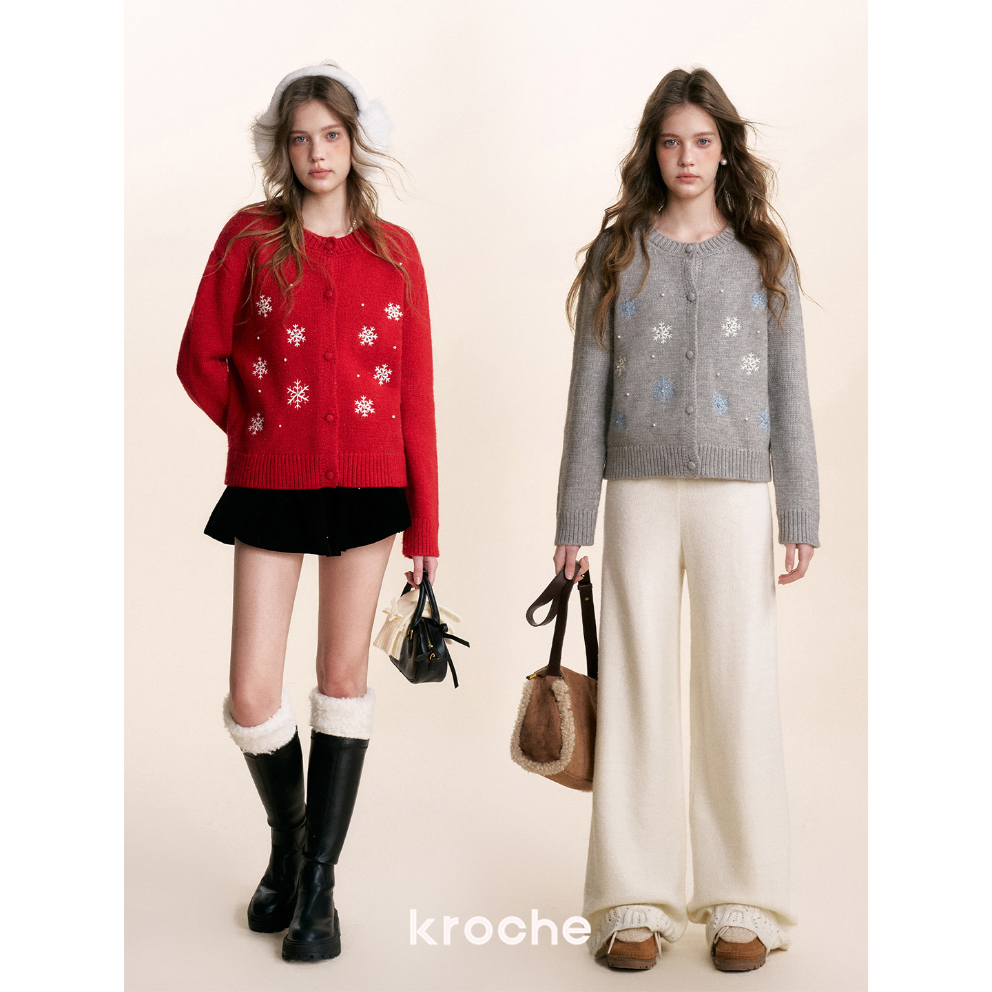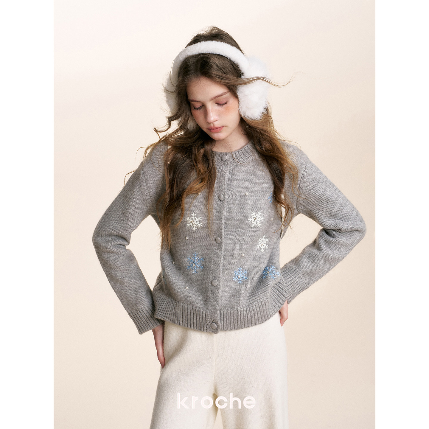 雪花点缀圆领宽松毛衣开衫 Kroche 立体撞色手钩绣 雪精灵 25aw