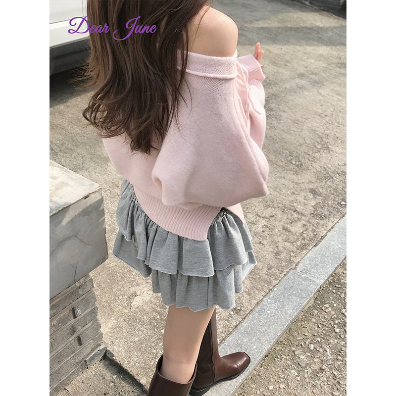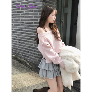 DearJune 甜美风一字肩绑带开叉设计感上衣显白收腰 韩国博主同款