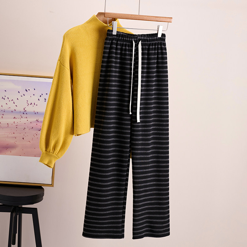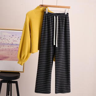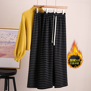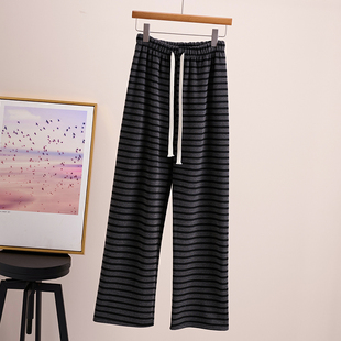 抽绳145休闲直筒糯米裤 小个子150加绒条纹阔腿裤 女秋冬加厚针织裤