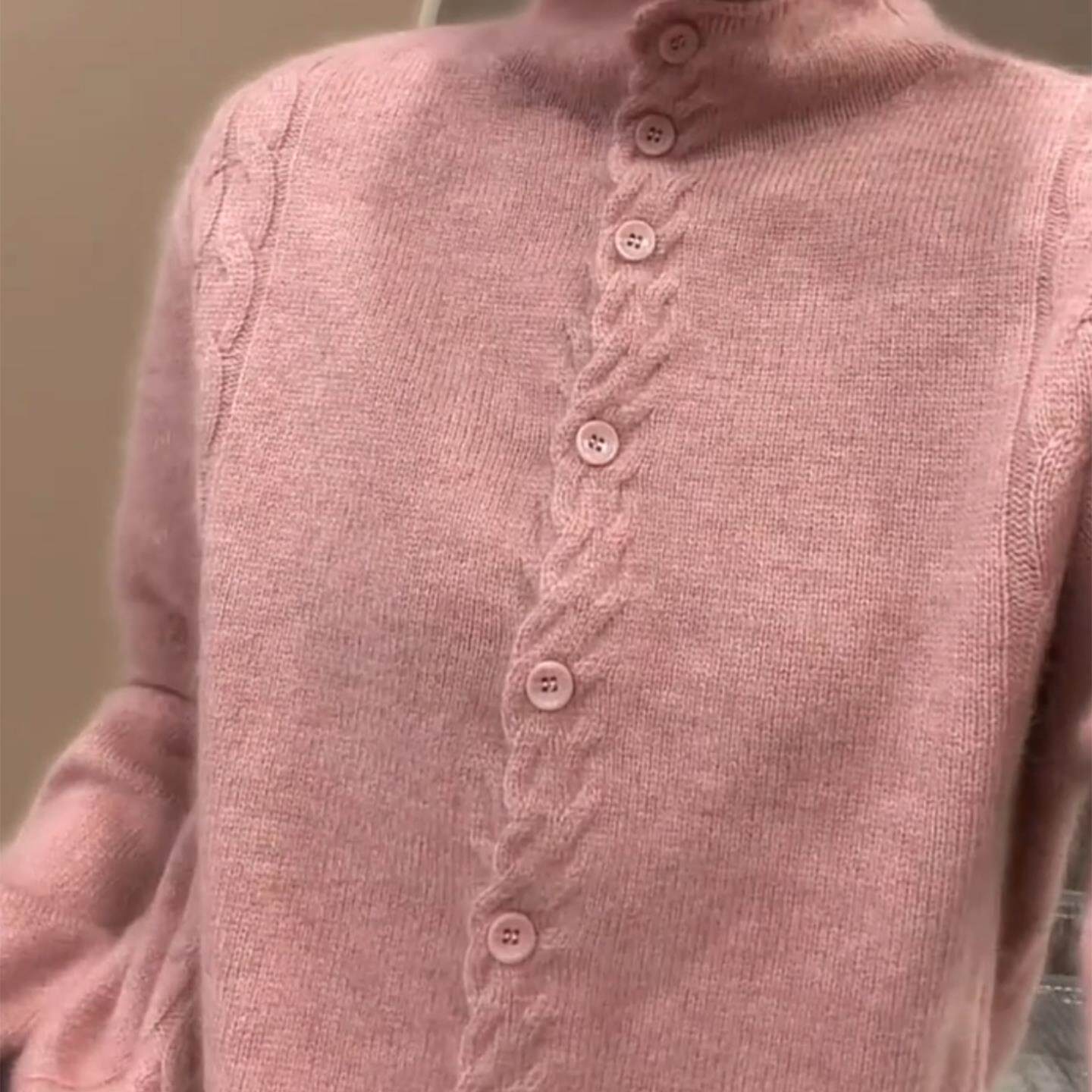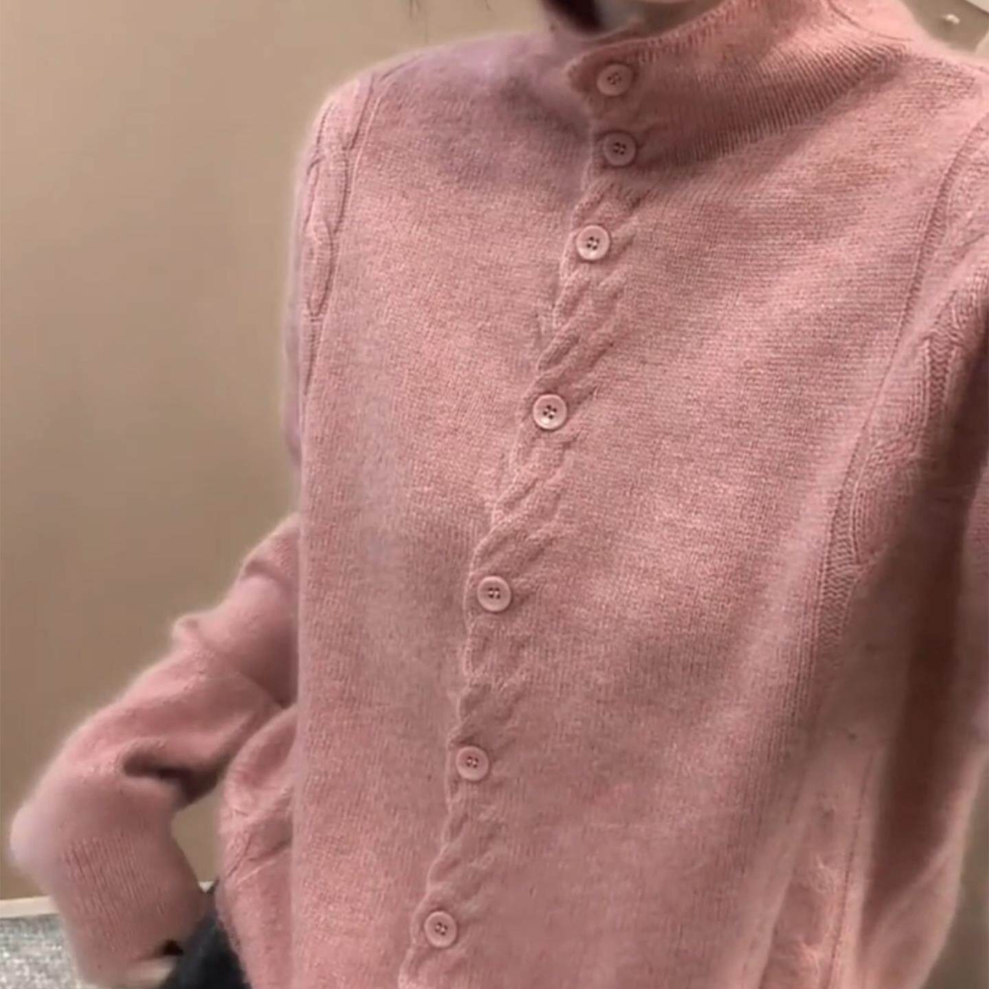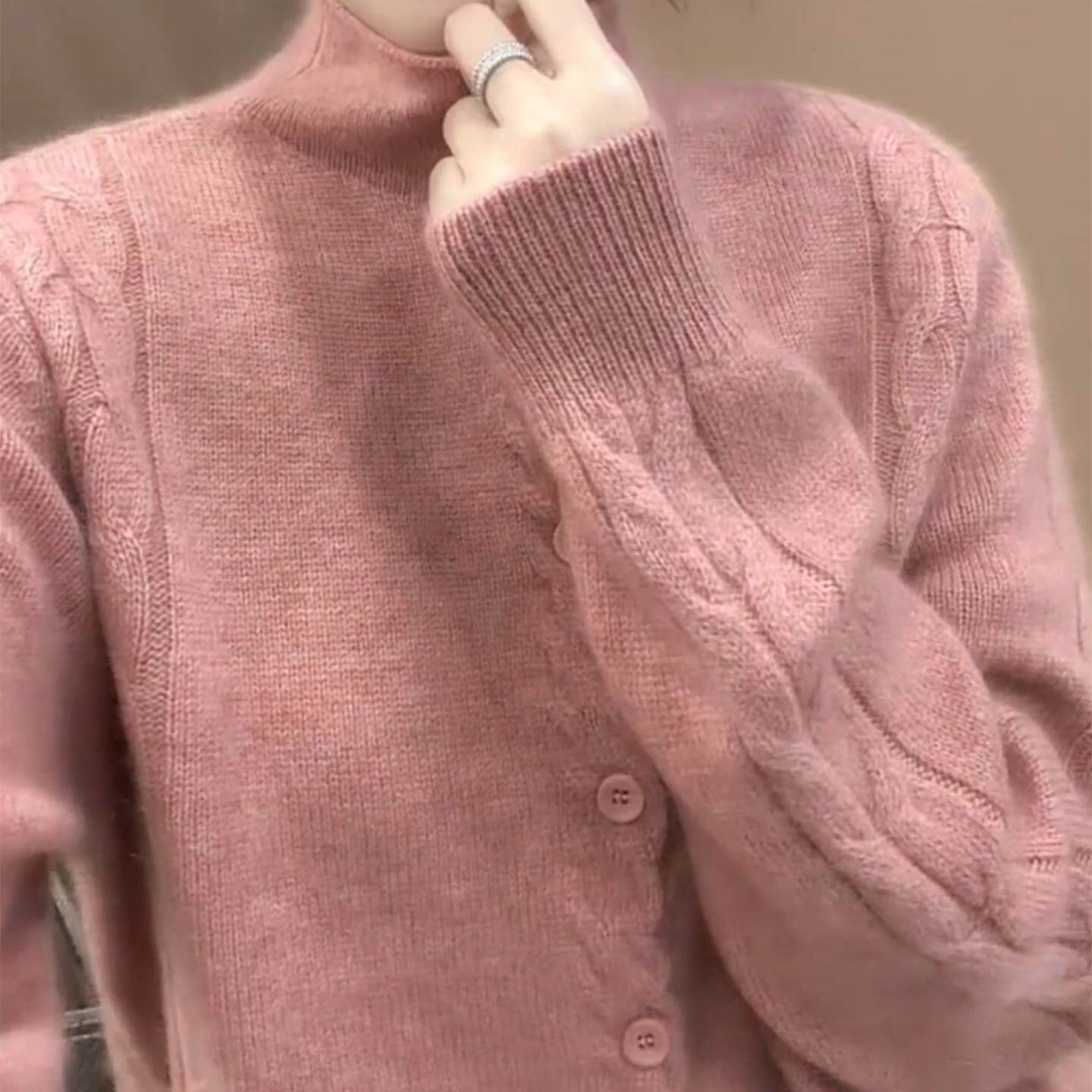 女装 温柔粉色半高领排扣麻花长袖 软糯大码 2025年秋冬季 潮 针织开衫