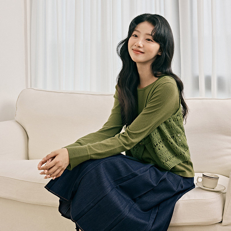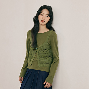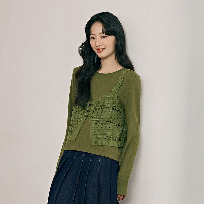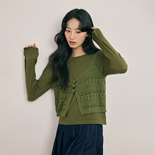 新款 2025秋季 圆领打底吊带开衫 PIT复古绿色两件套毛针织衫