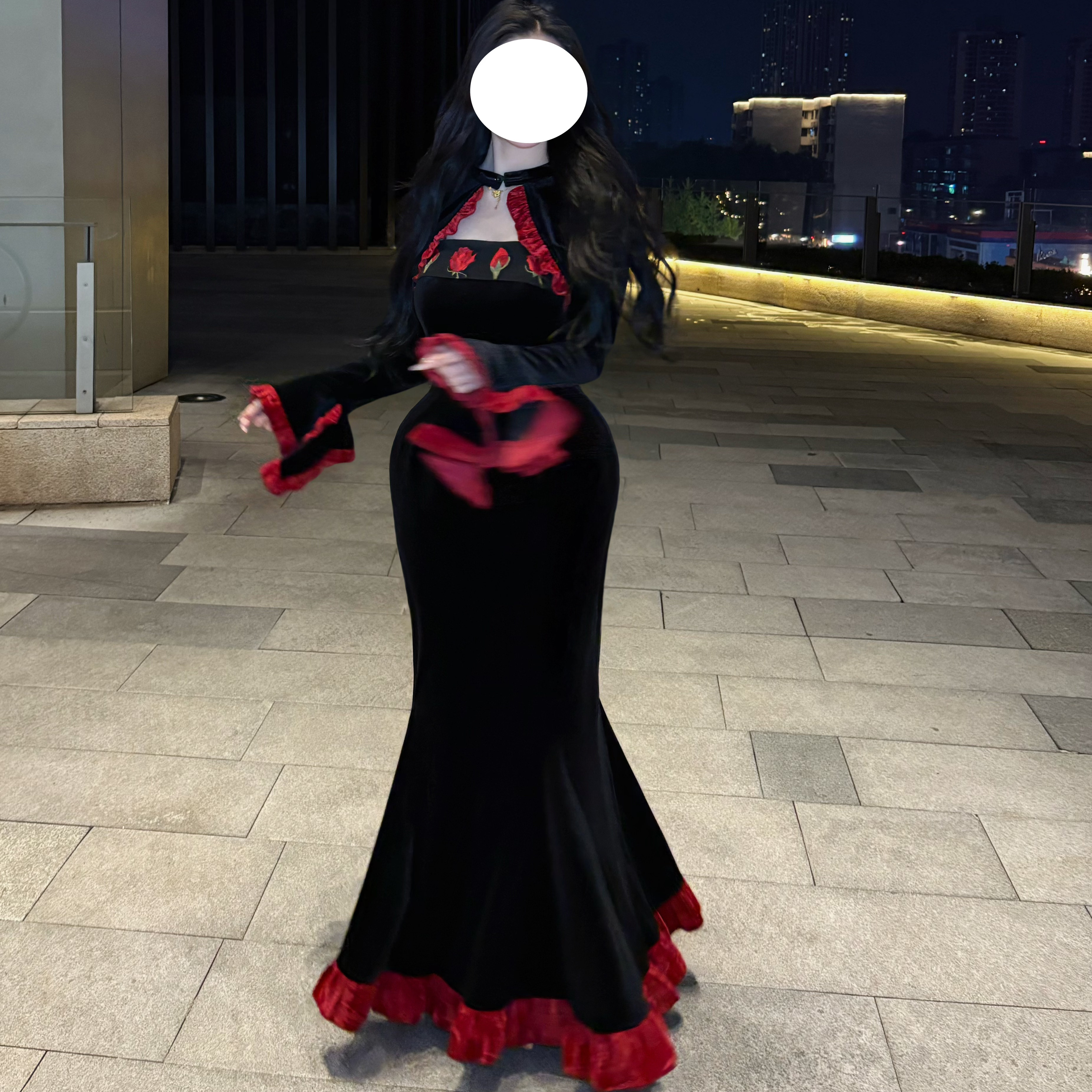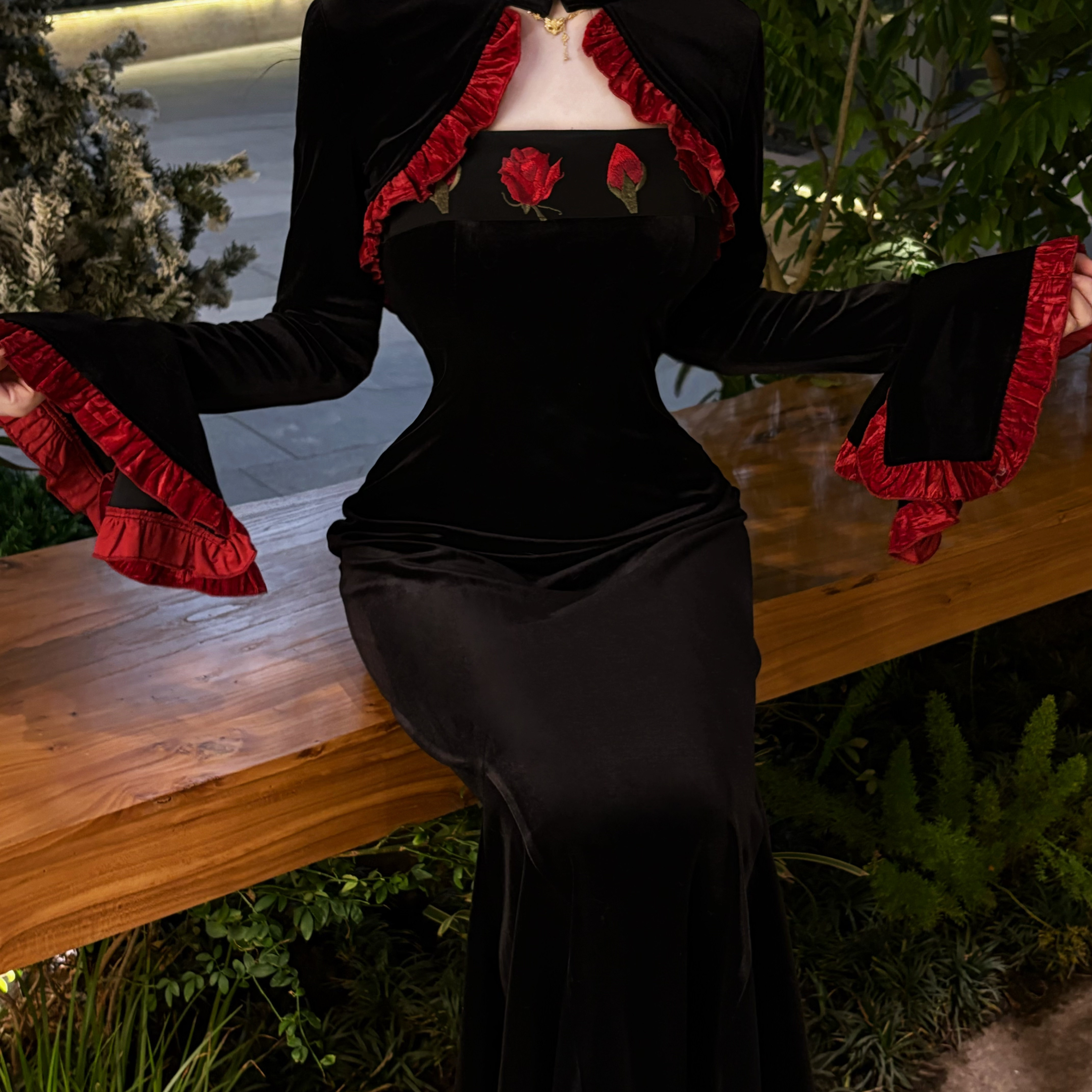 LHMknk1画报夫人原创自制丝绒刺绣拼接步步生莲 红玫瑰女人套装