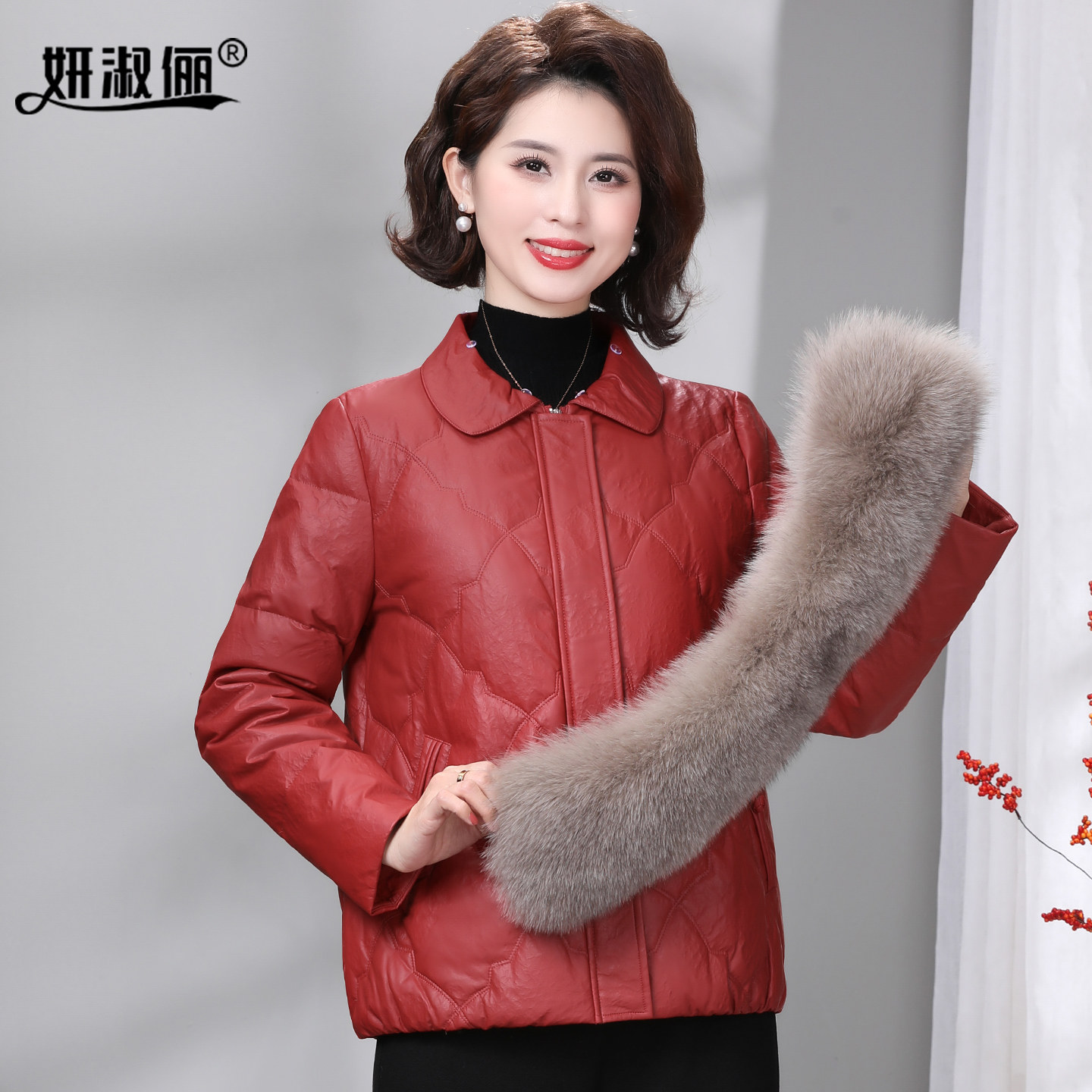 妈妈冬装 中老年女新年衣服大气高贵皮衣厚外套 狐狸毛领羽绒服短款
