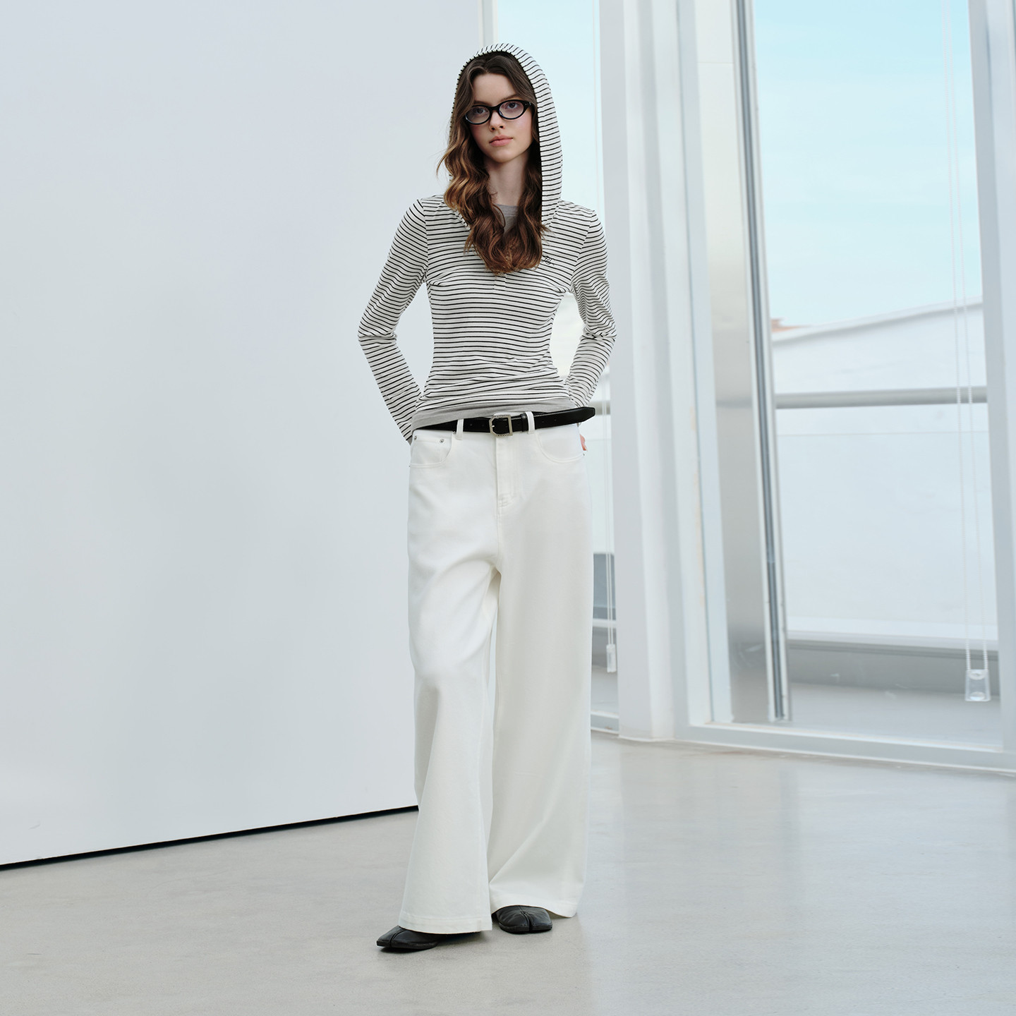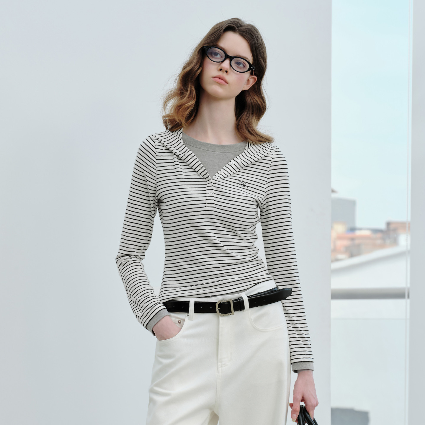 上衣休闲黑色修身 假两件撞色条纹连帽女士长袖 t恤 Brand女装 PSO