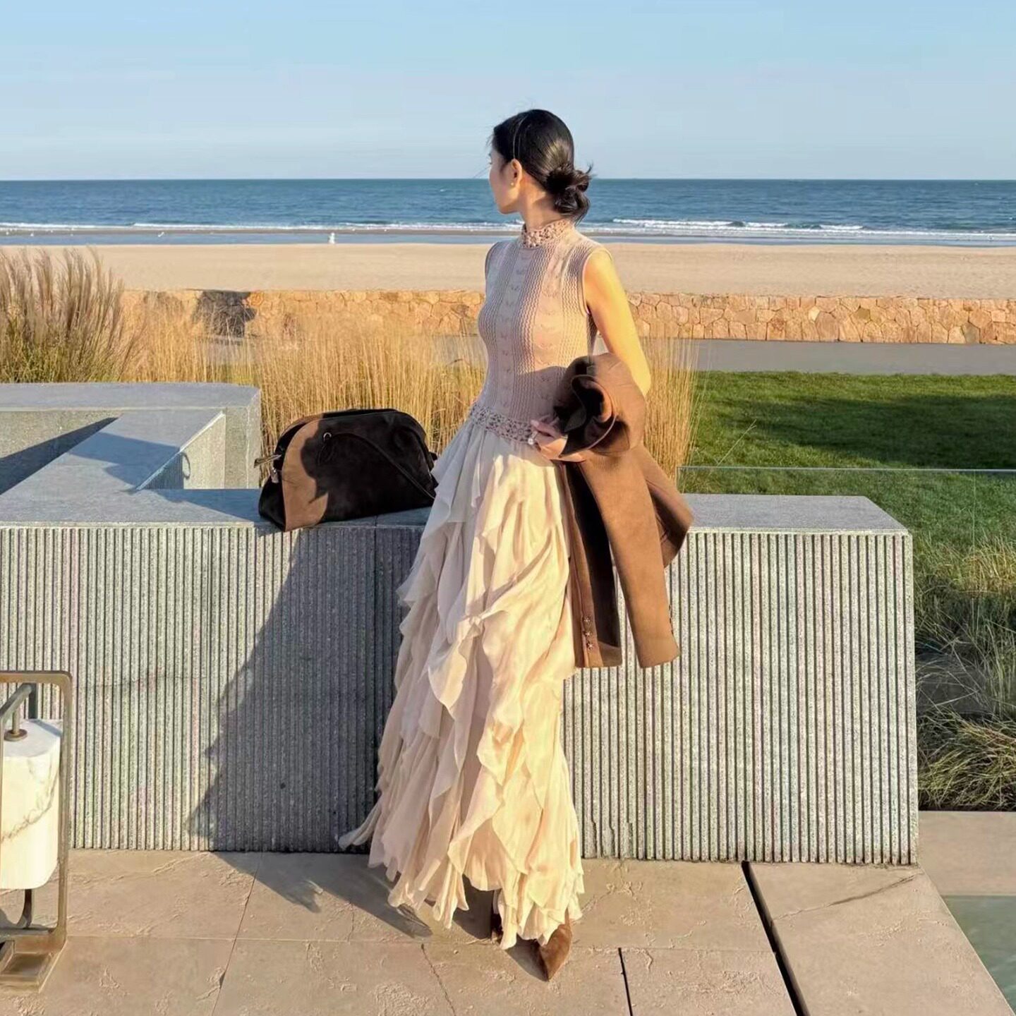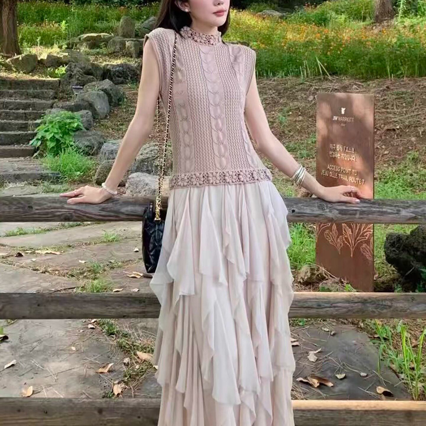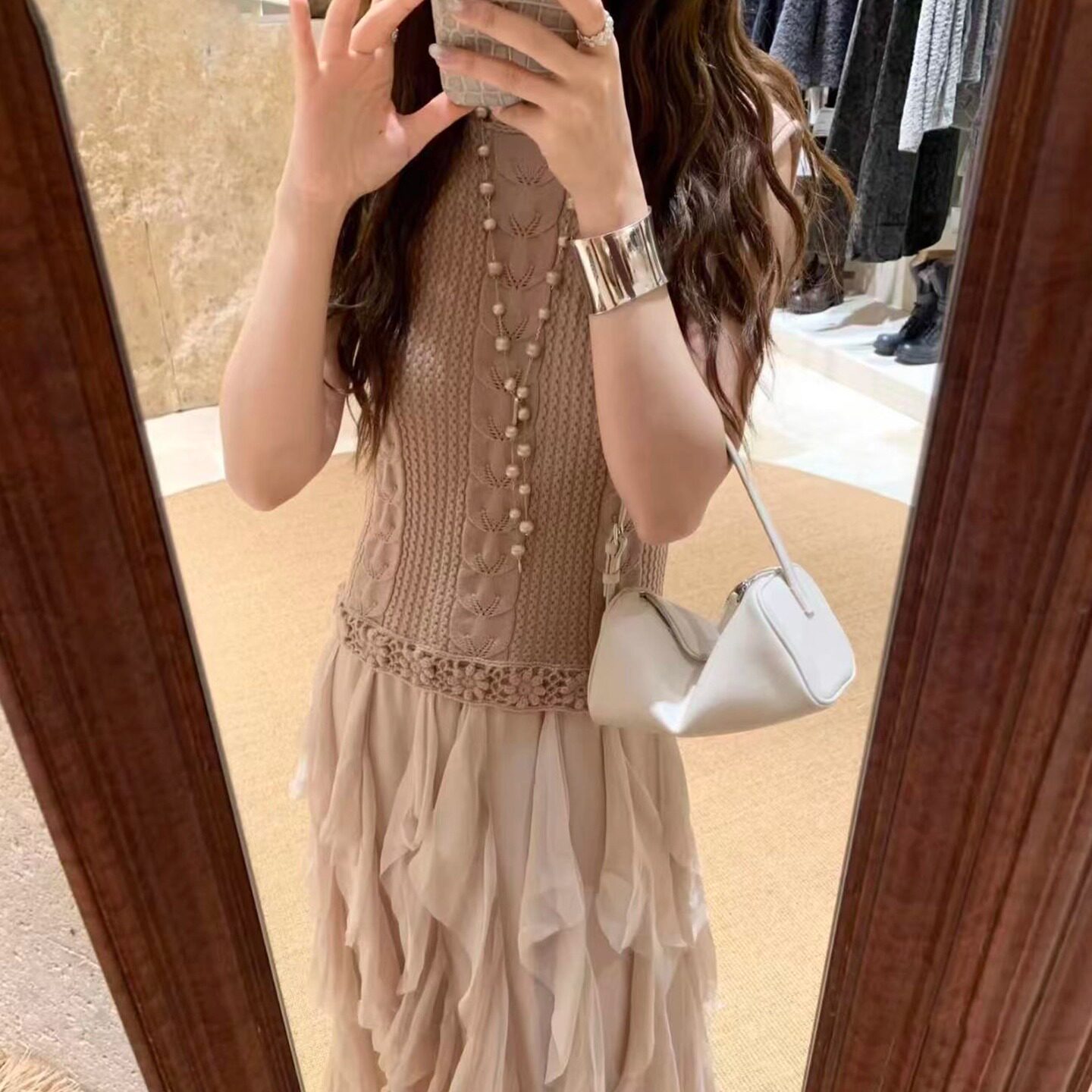noneto绝美设计感针织钩花拼接荷叶边连衣裙收腰显瘦仙气长裙