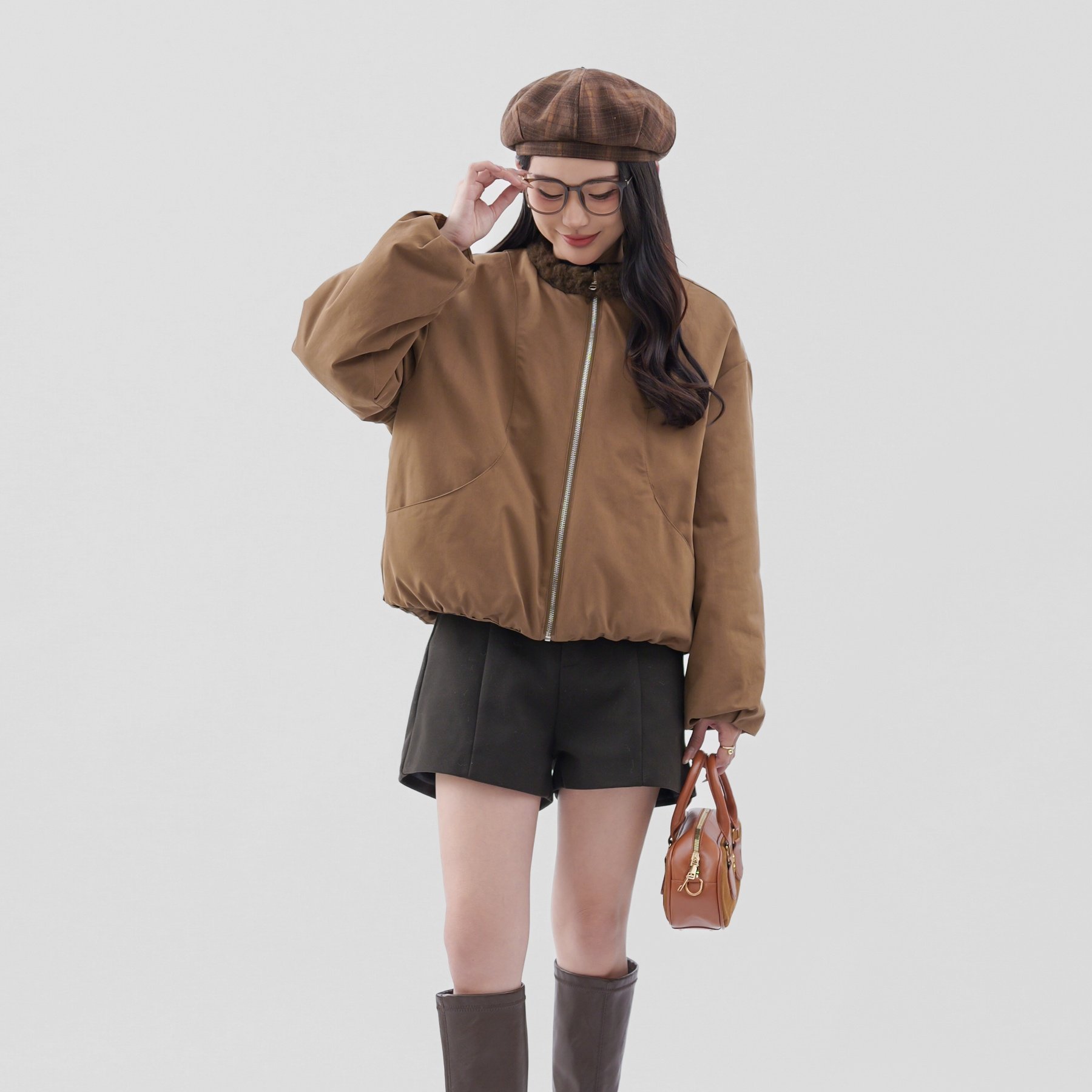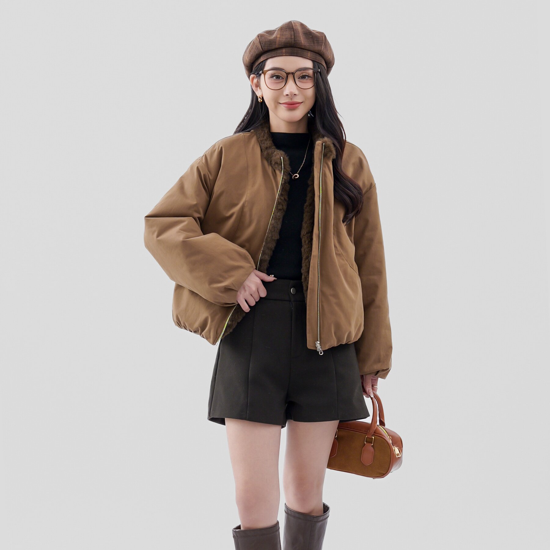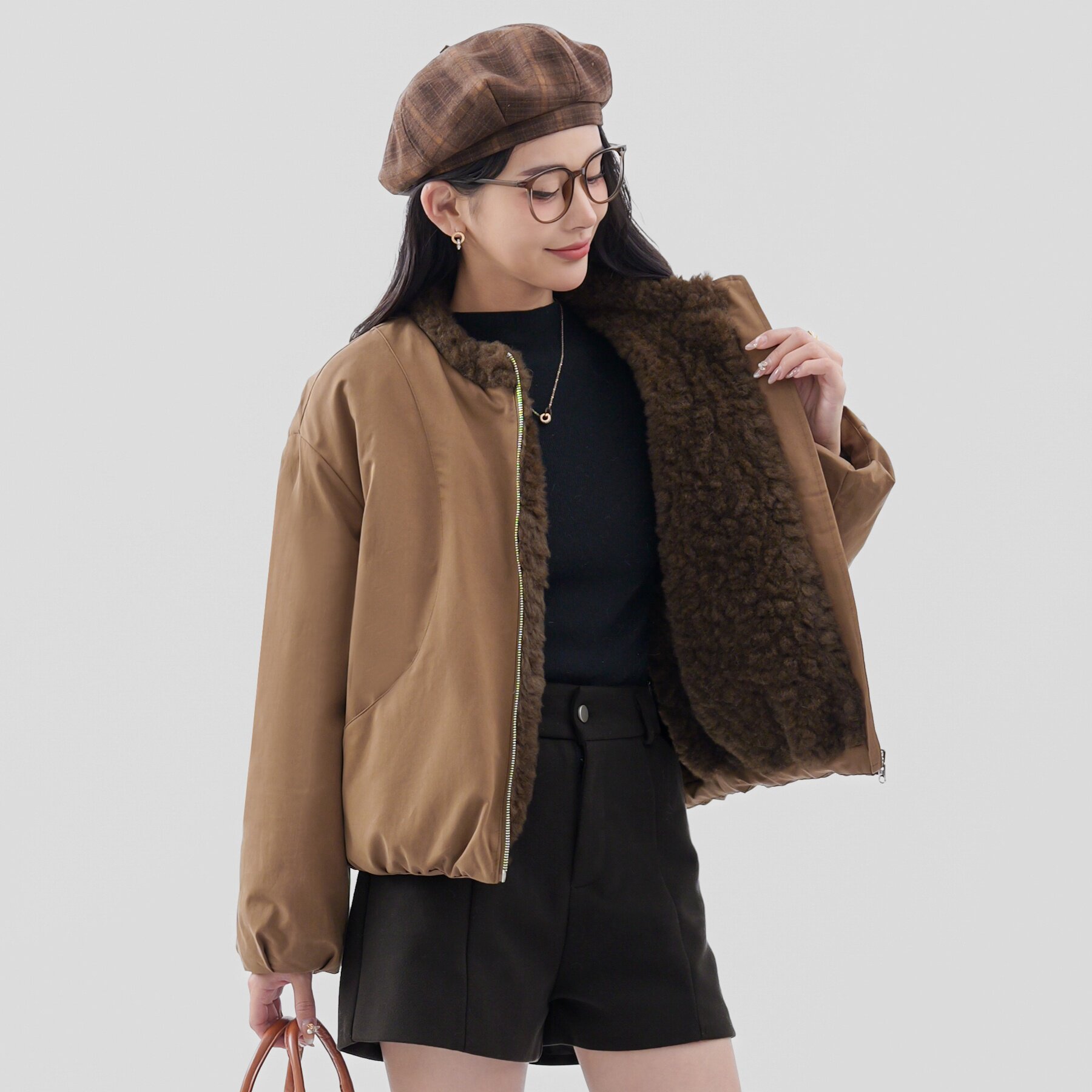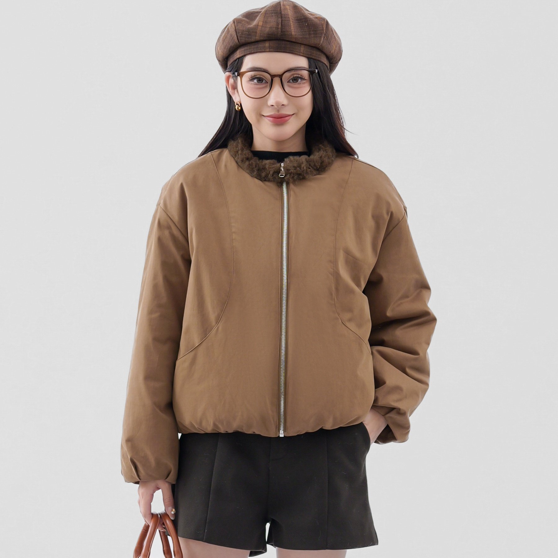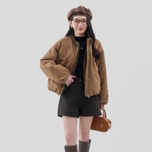 巨好看 仿羊羔毛夹克外套女冬上衣 两面穿搭立领派克服小个子短款