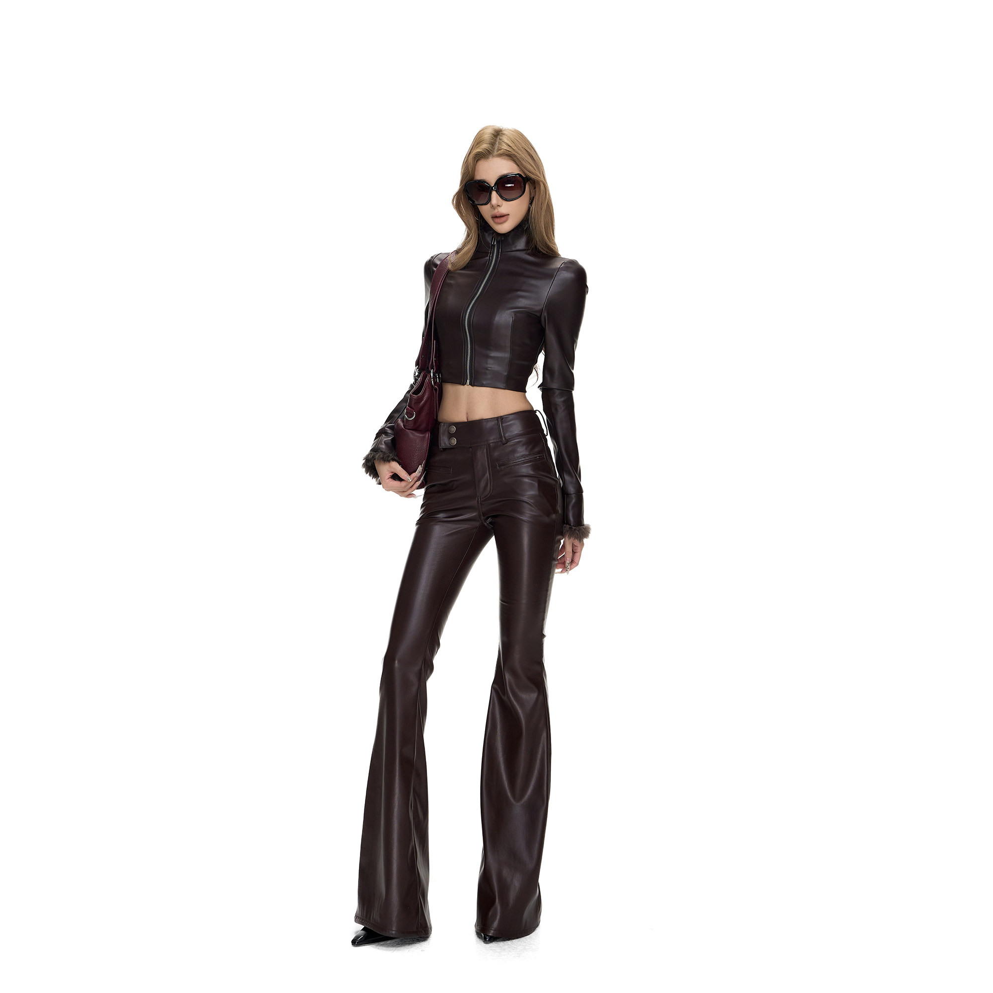Fanptntox·弹力PU皮性感机车拉链皮衣外套毛毛立领修身 正肩上衣