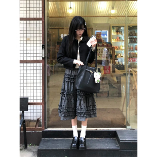 自制重工设计感灰色波点蛋糕裙女文艺复古木耳边小众中长款 半身裙