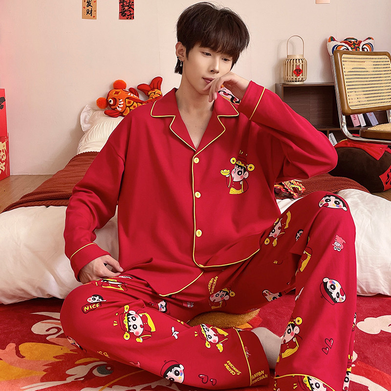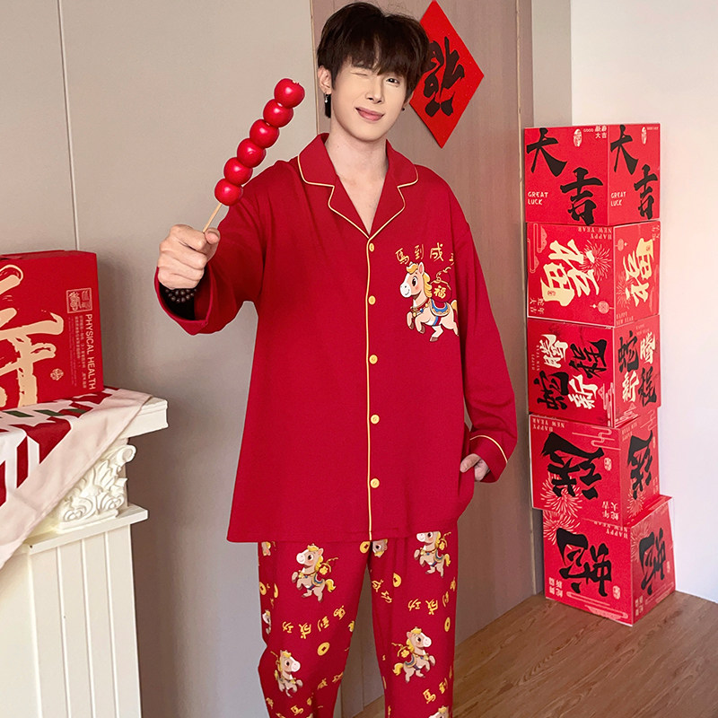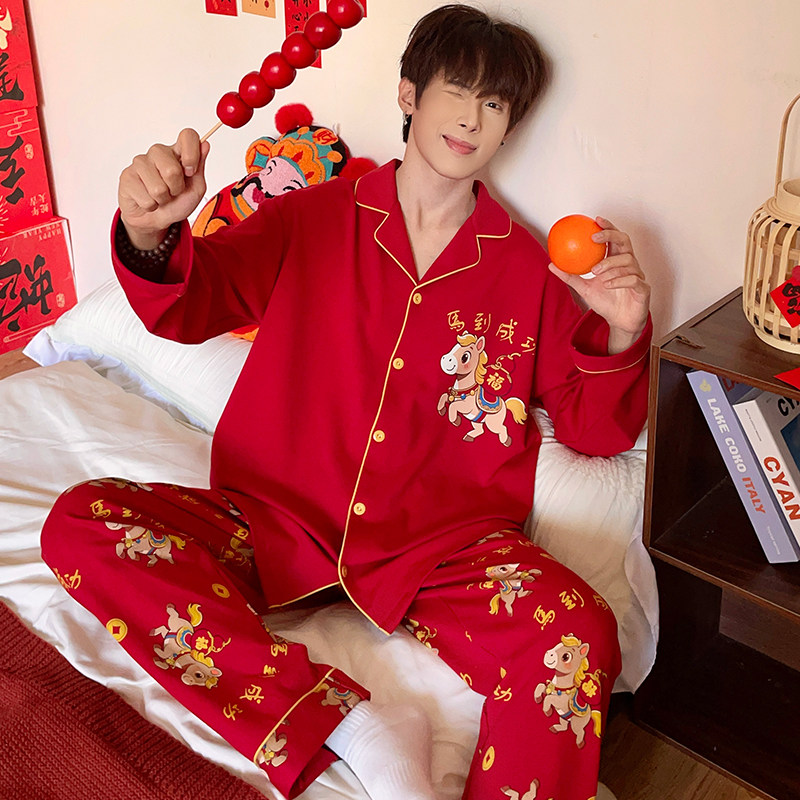 可外穿男士 青少年开衫 家居服 本命年马年衣服休闲套装 红色睡衣男款