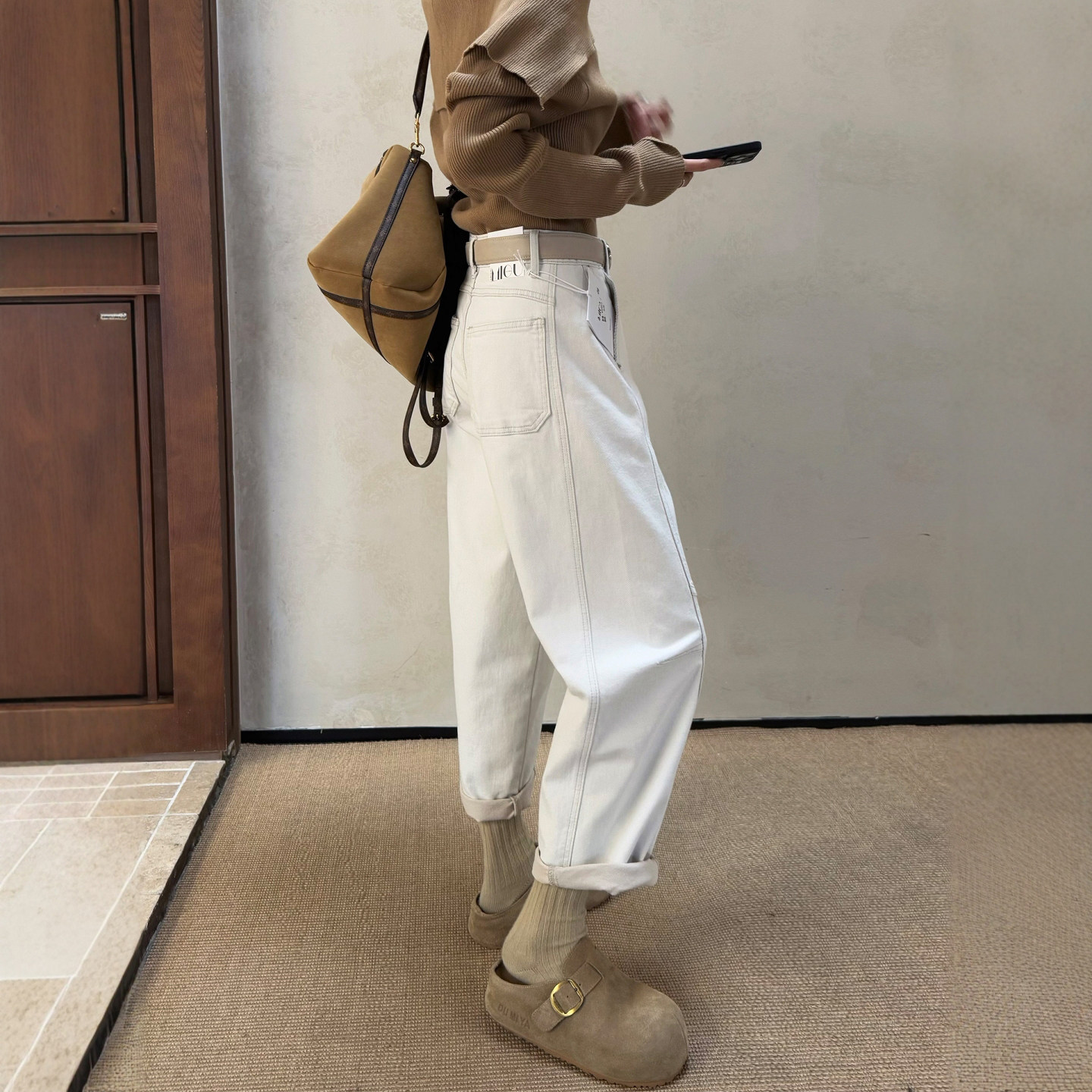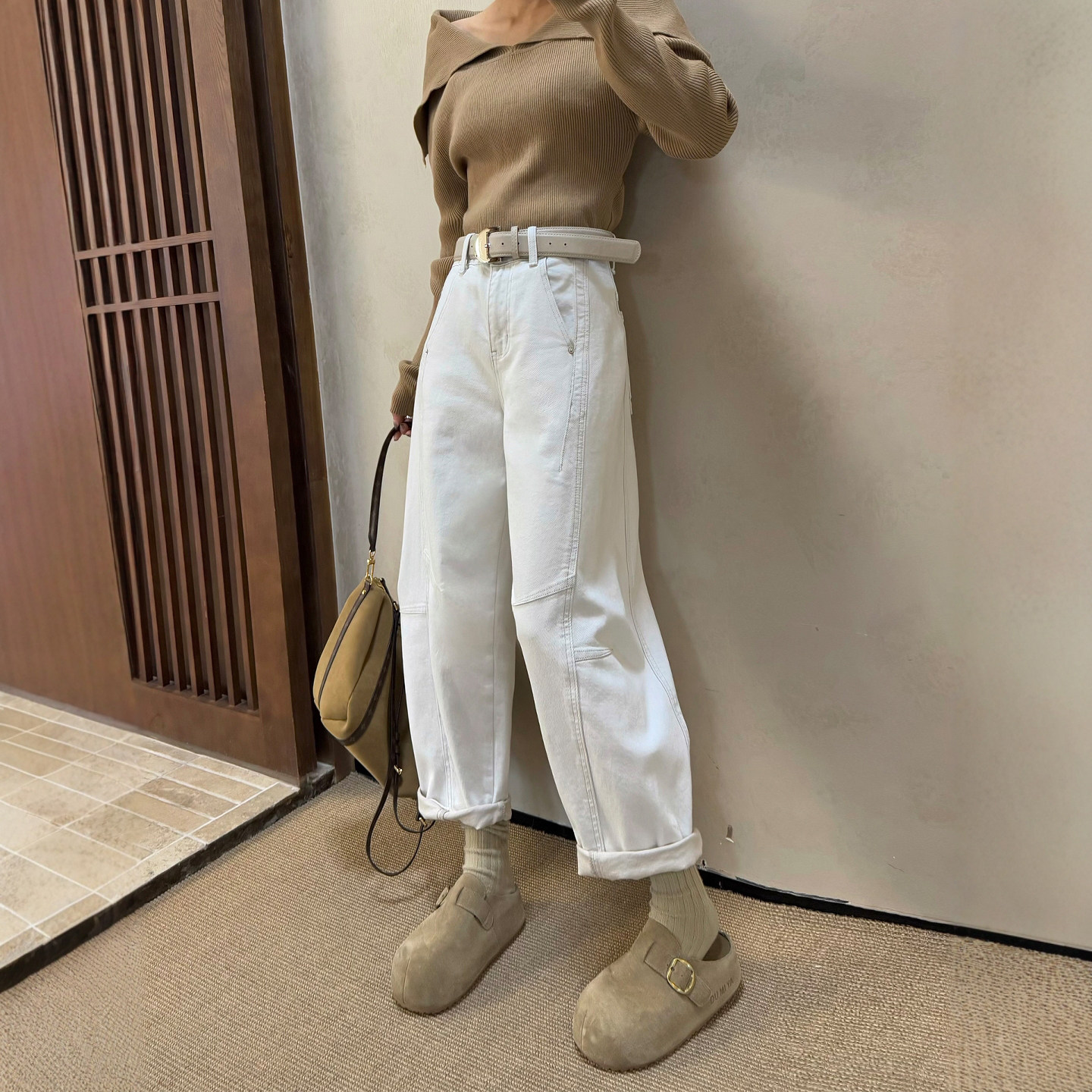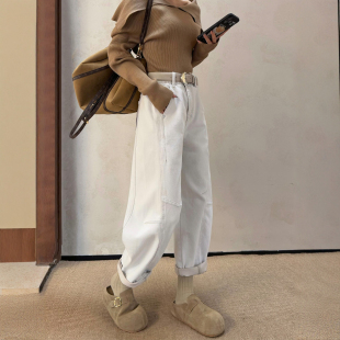 女宽松高腰显瘦九分休闲哈伦弯刀裤 米灰色阔腿牛仔裤 新款 2026春季