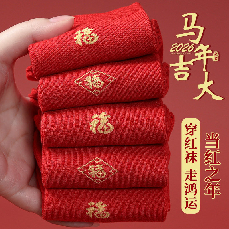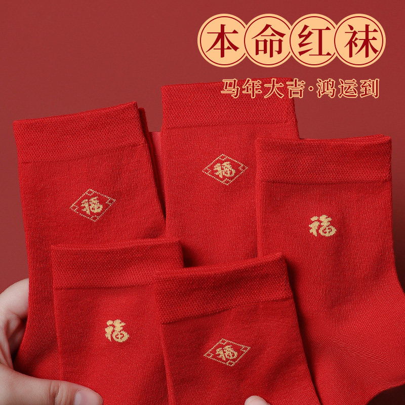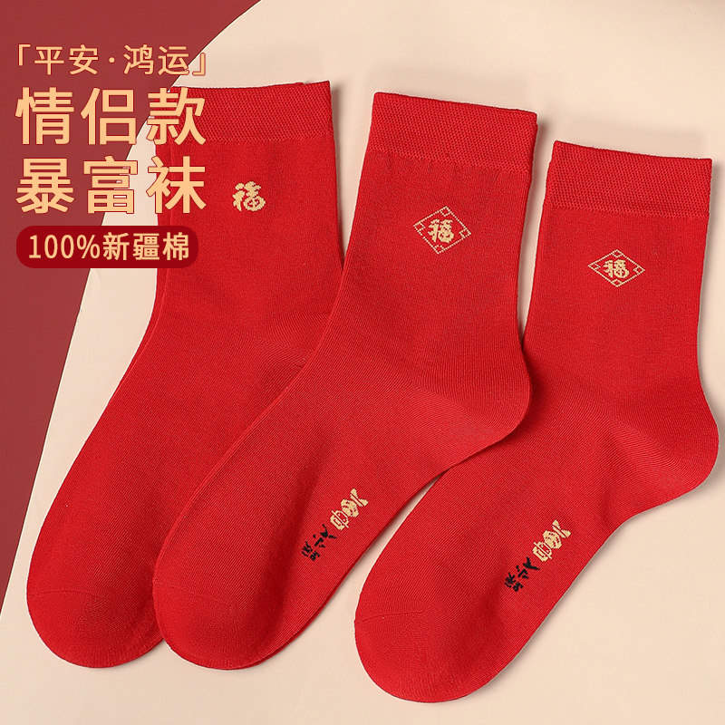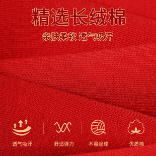 红袜子纯棉厚款 结婚福字大红色新年袜 保暖中筒红袜本命年情侣款