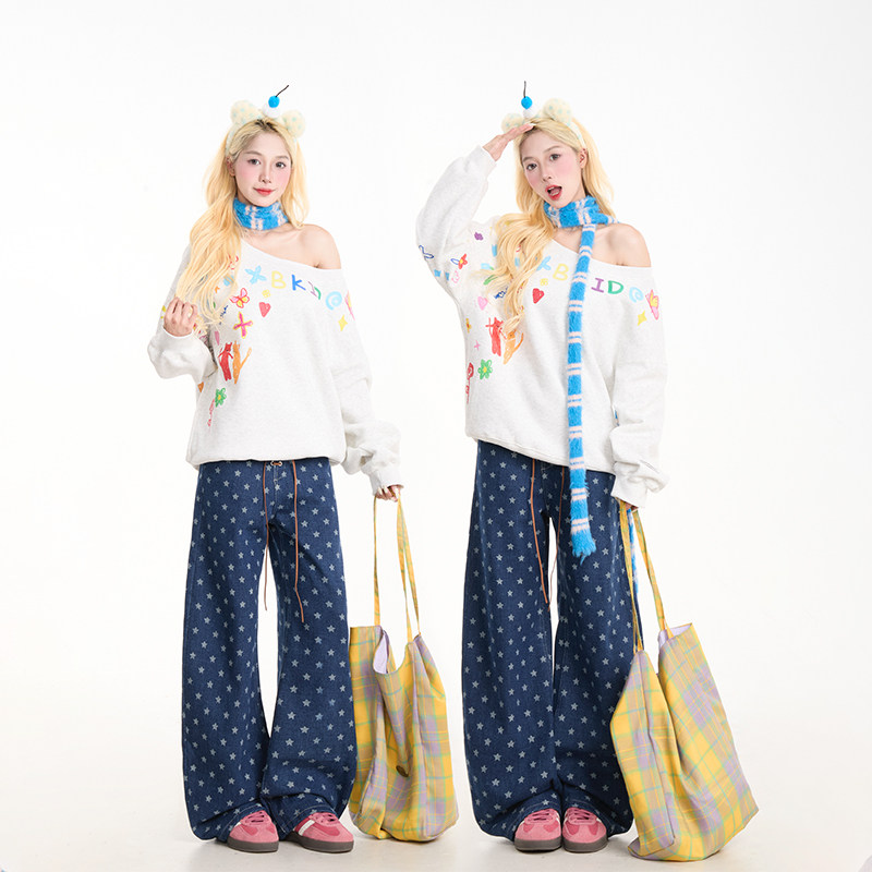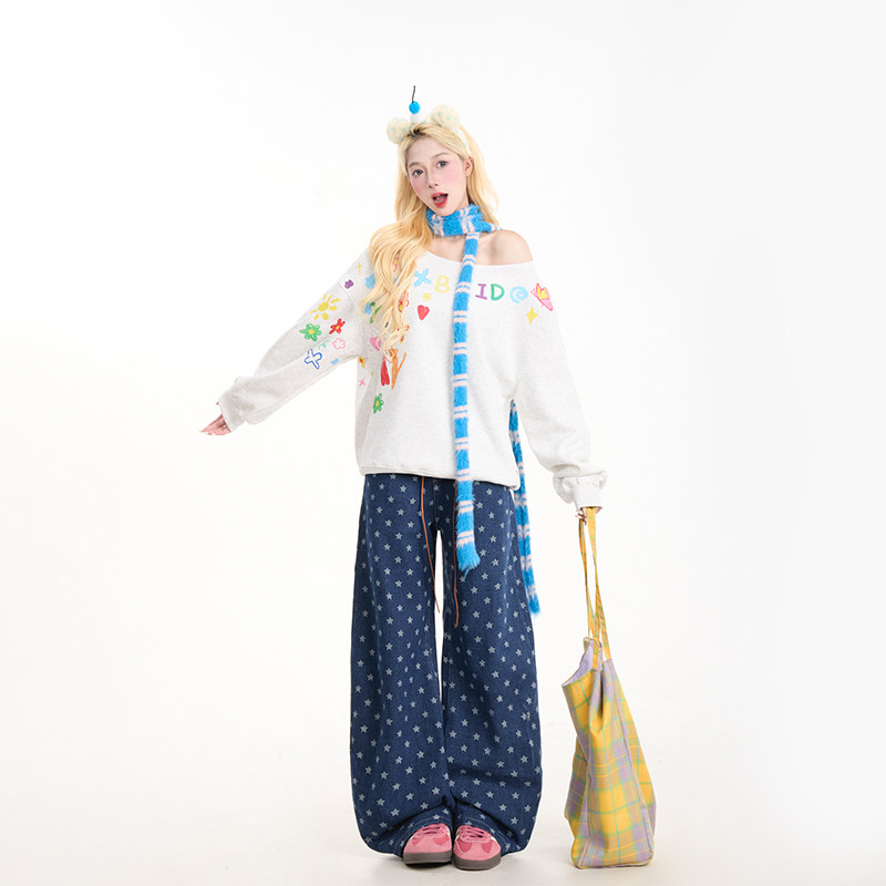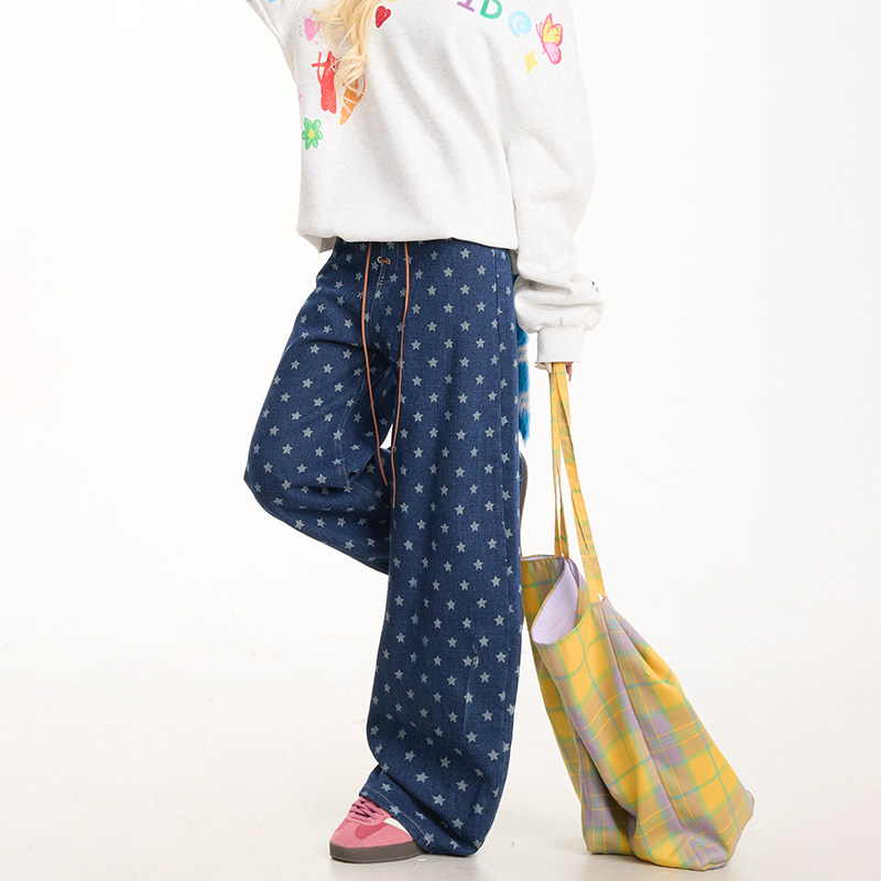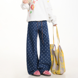 高街宽松阔腿裤 NERESUM星星满印牛仔裤 新款 潮牌弯刀长裤 女美式