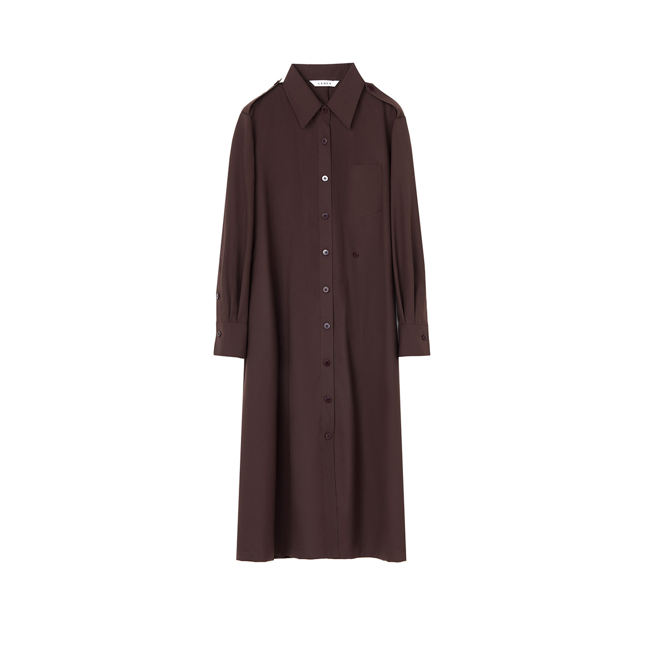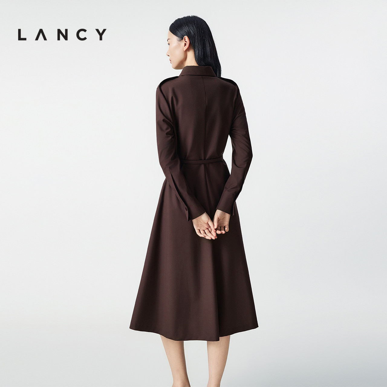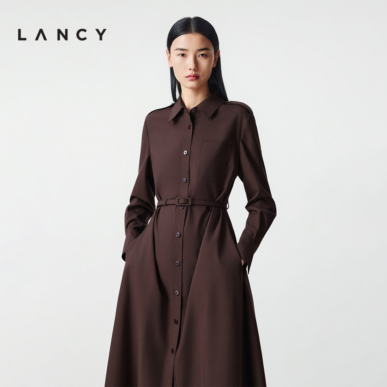 新款 朗姿2025冬季 LANCY 翻领通勤气质高端收腰连衣裙 羊毛蚕丝