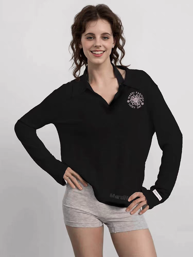 女拼接磨毛打底长袖 显瘦翻领刺绣POLO衫 上衣 假两件修身 FISSXS