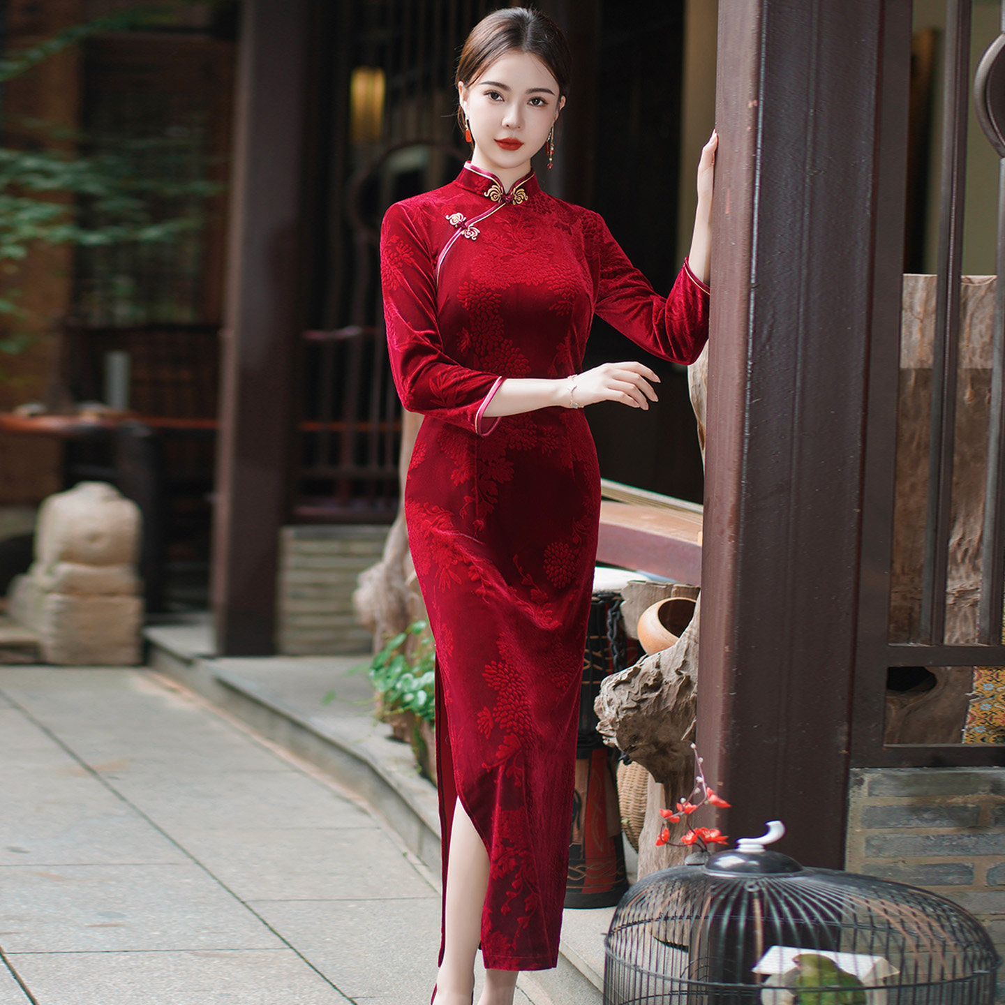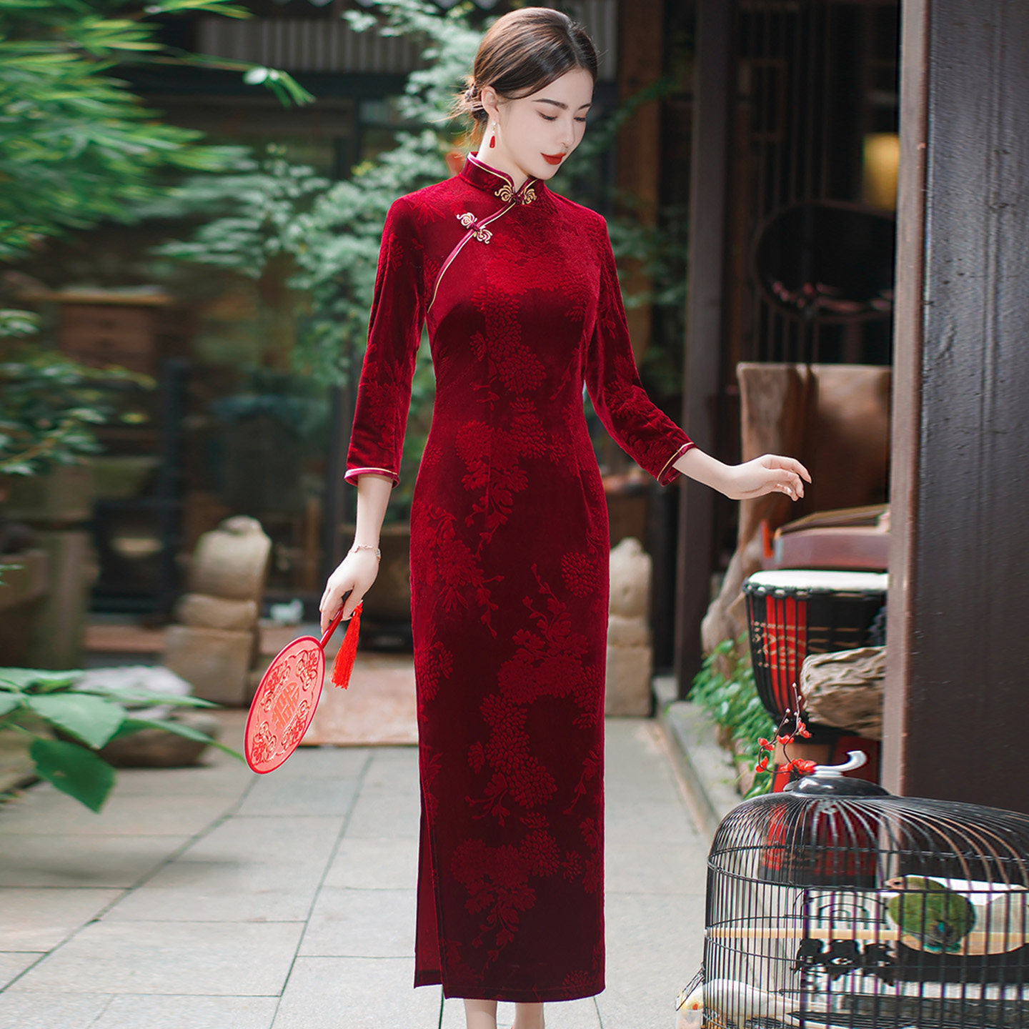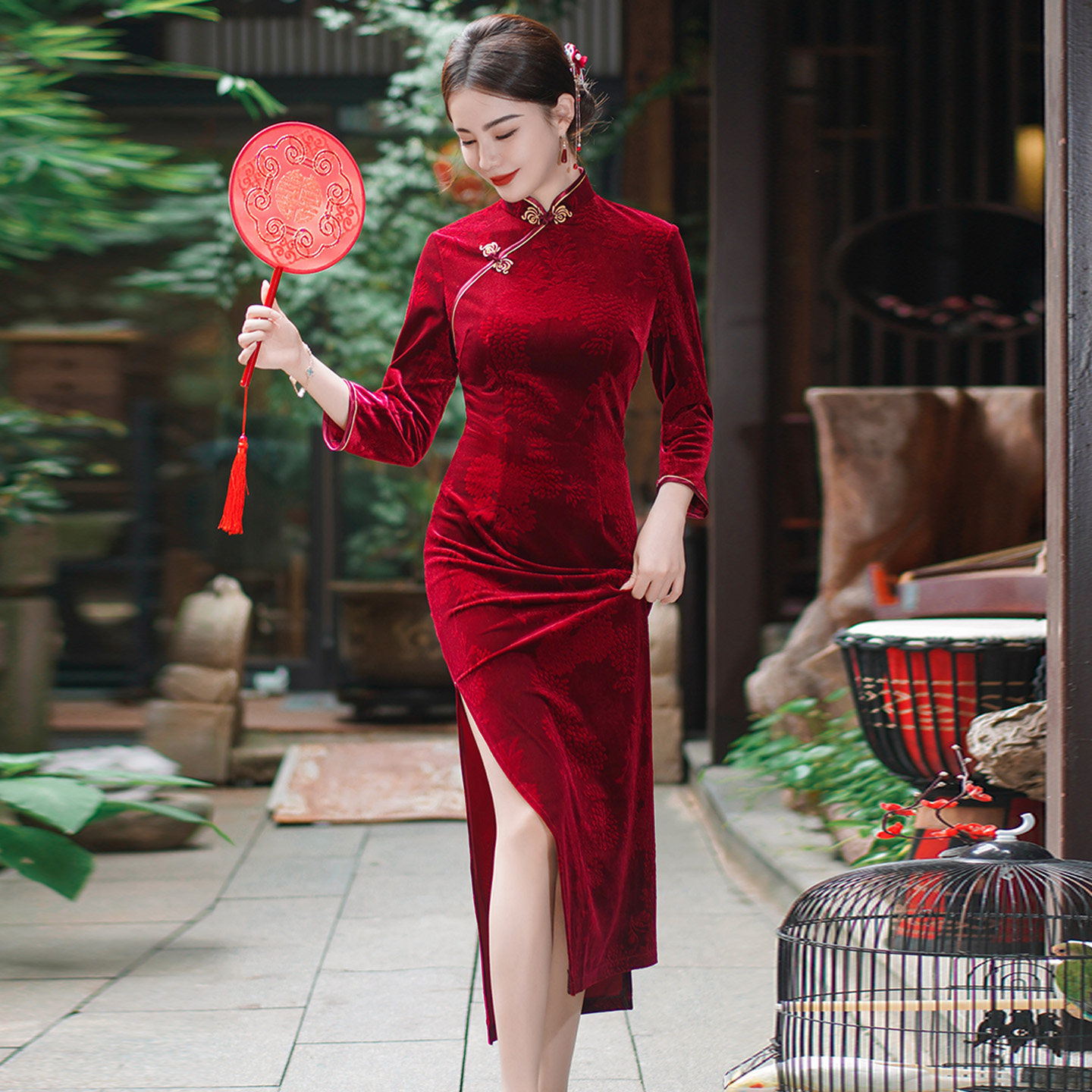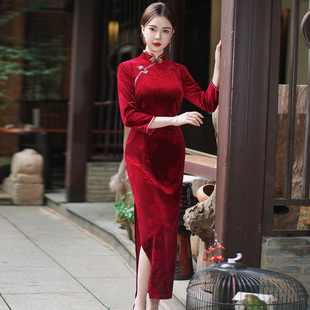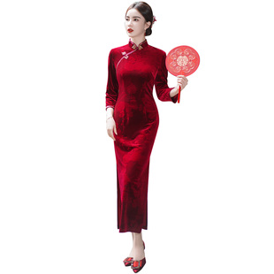 礼服 喜妈妈婚宴装 红色提花金丝绒旗袍复古国风老上海2025新款 秋季