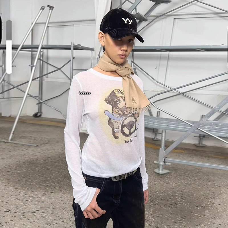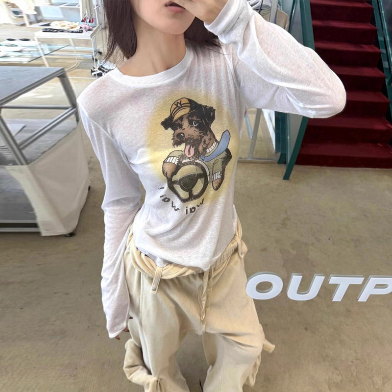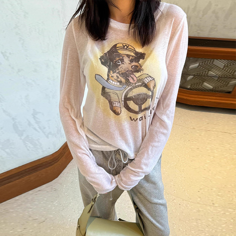 open 显瘦长袖 可爱卡通小狗印花圆领修身 T恤 25新款 专柜品质