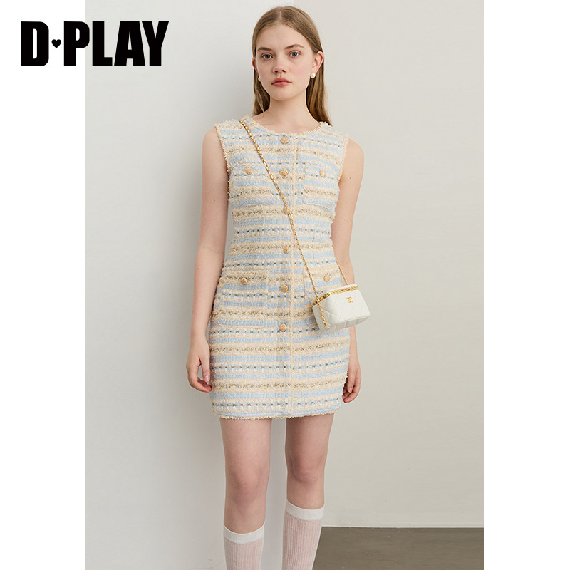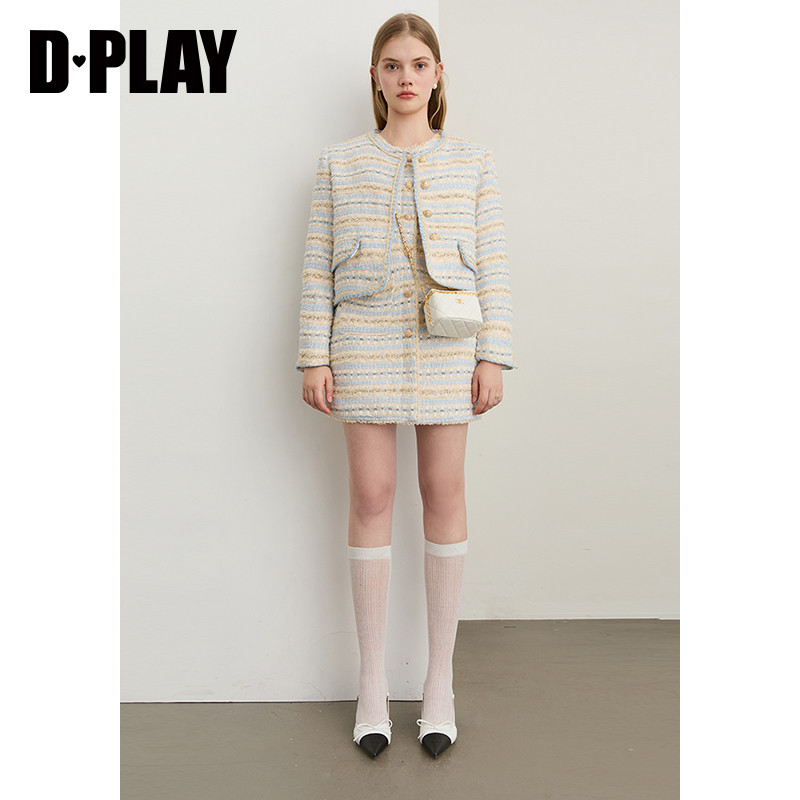 DPLAY2025年秋季 蓝色连衣裙女粗花呢小香风外套裙子两件套 新款
