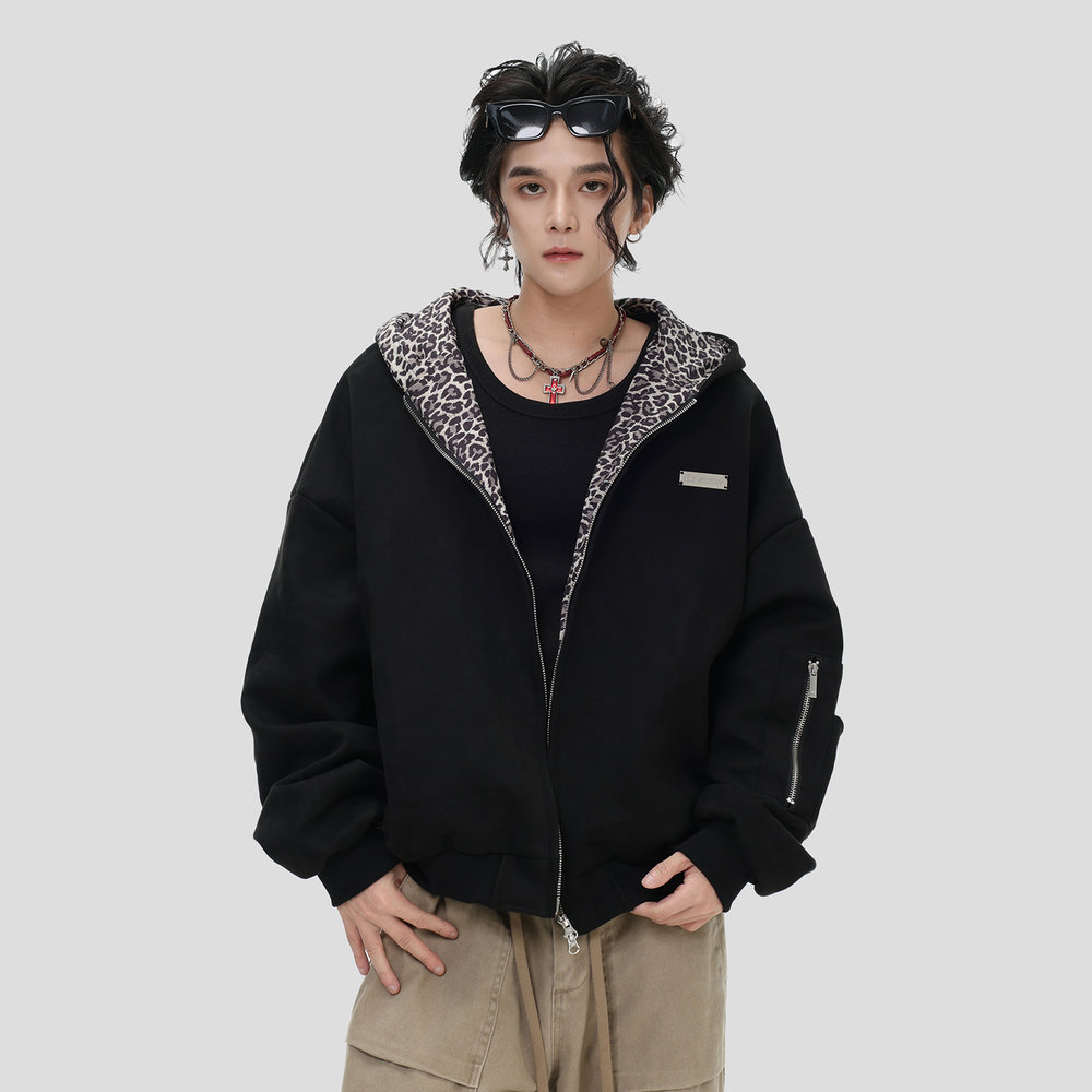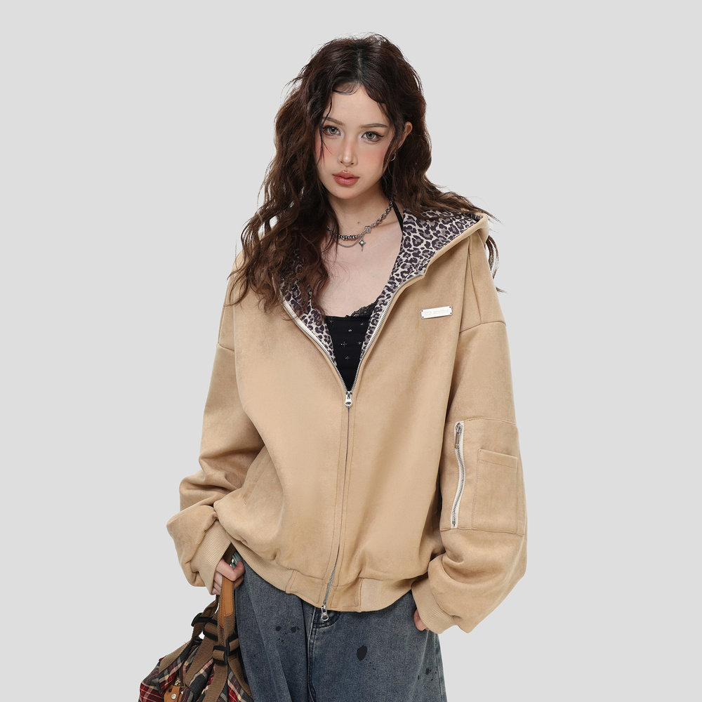 NOPASS 「豹纹麂皮夹克」宽松连帽上衣外套男女 国潮情侣原创美式