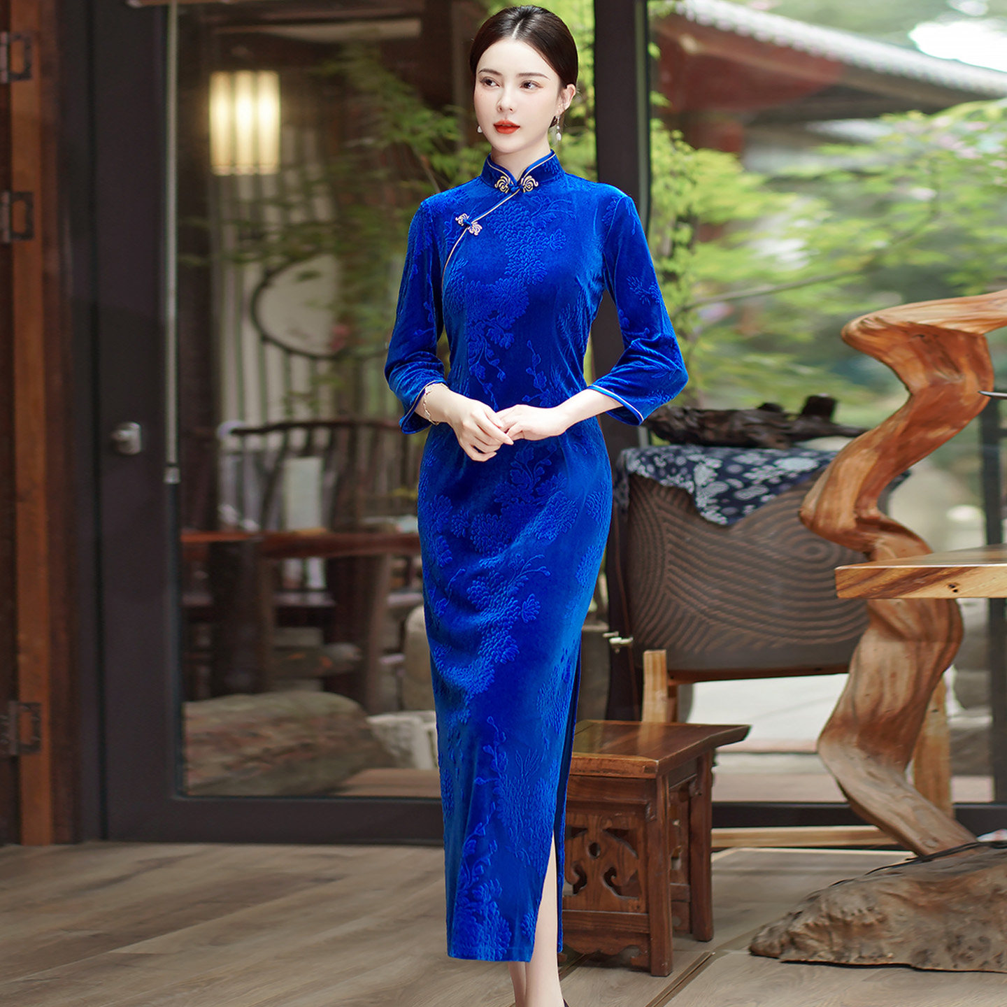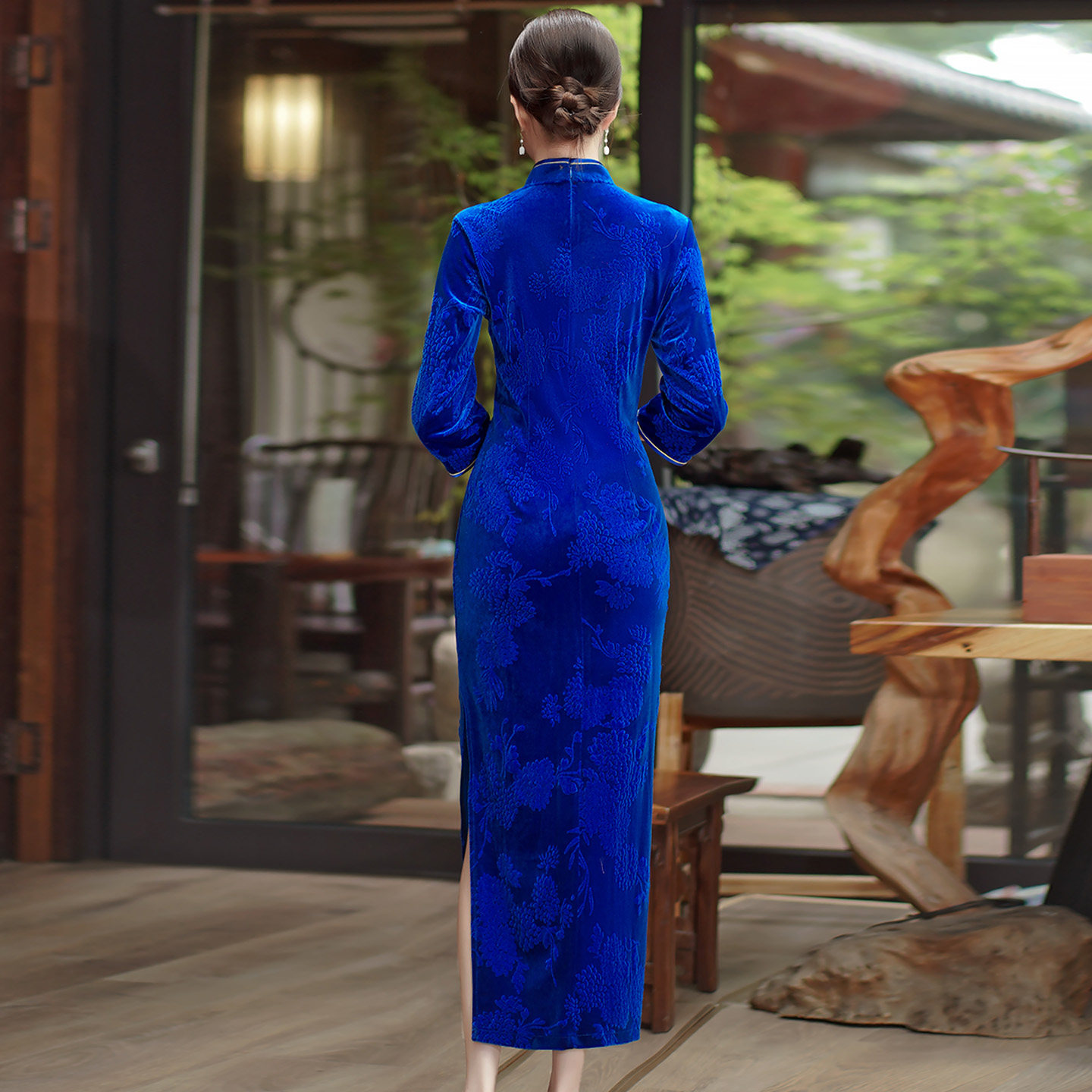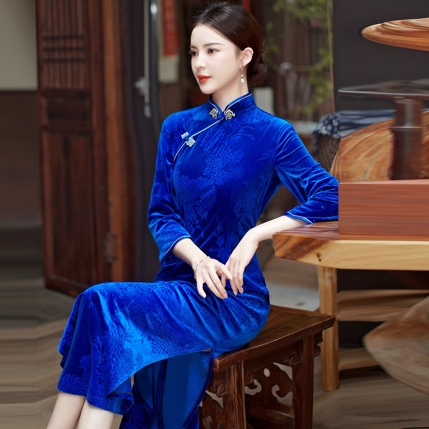 画报夫人原创自制秋冬麂皮绒珠链蕾丝秋季 婴蓝太太 旗袍
