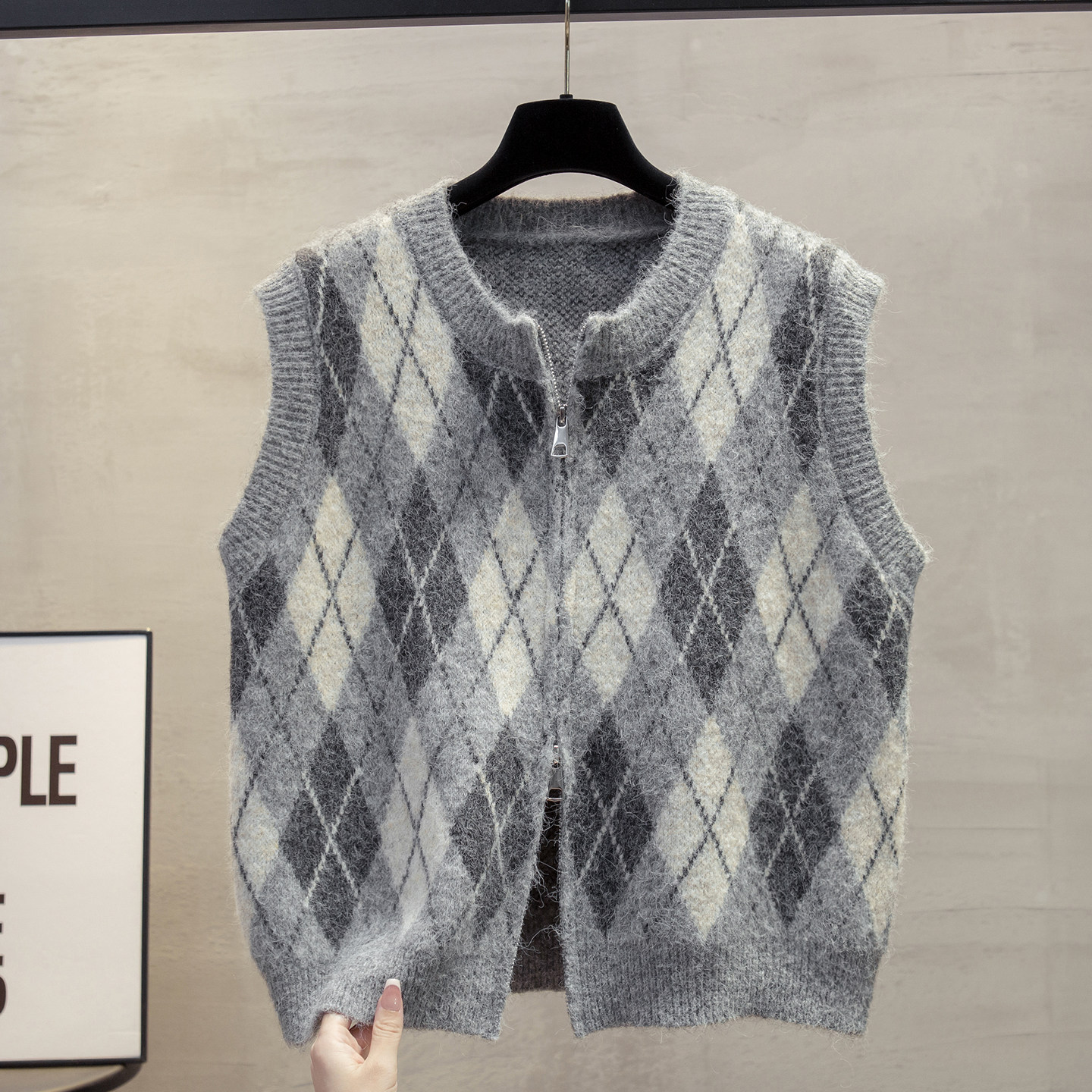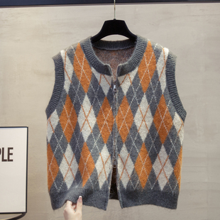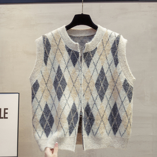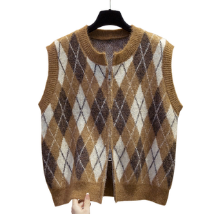 开衫 宽松马夹叠穿毛衣坎肩 菱格纹圆领针织马甲背心女2025秋冬新款