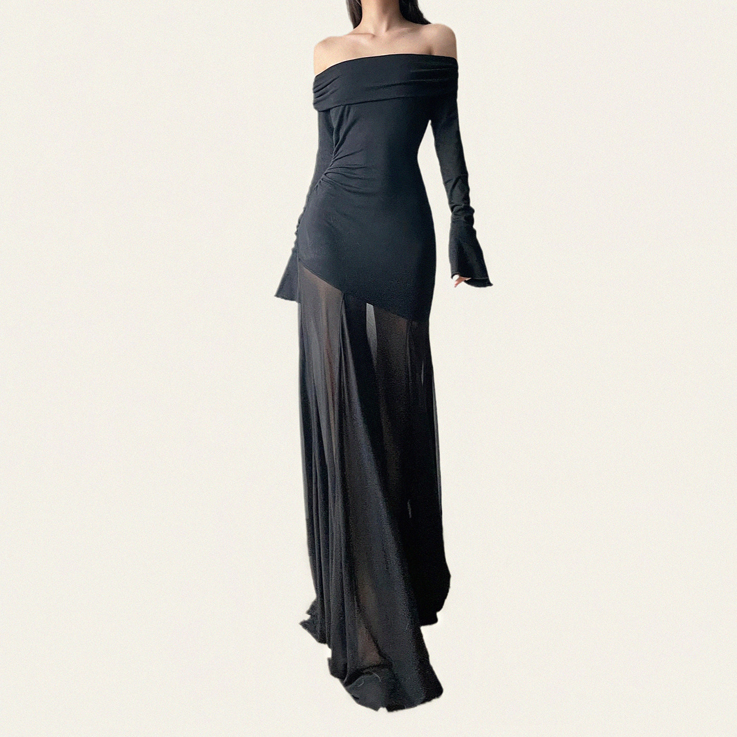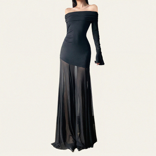 包臀网纱长袖 气质纯欲风性感低胸方领修身 连衣裙女带胸垫 新款 秋季