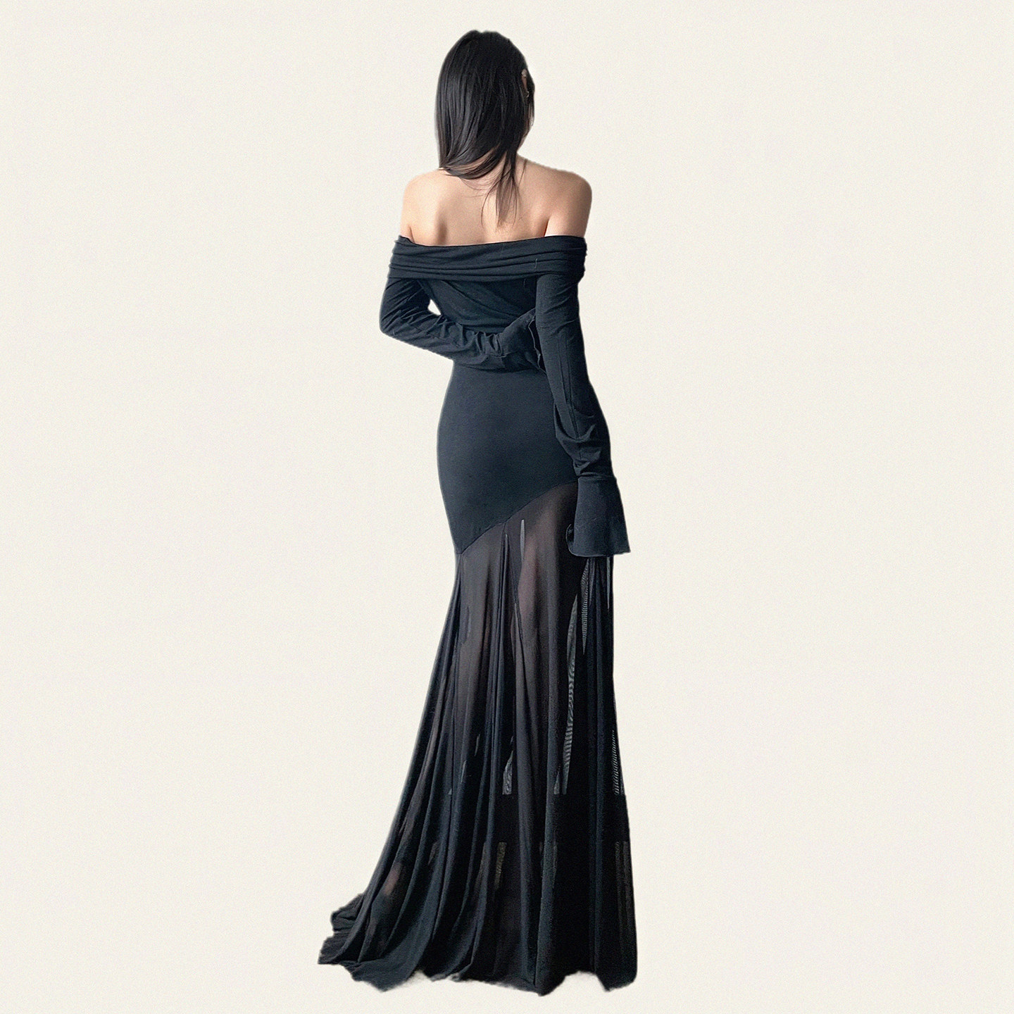 2025秋冬法式 赫本风收腰长裙丝柔钉珠假两件连衣裙8618