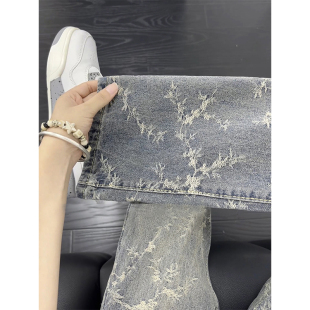 显瘦直筒长裤 提花刺绣微喇牛仔裤 子修身 高街裤 男生设计感穿搭美式