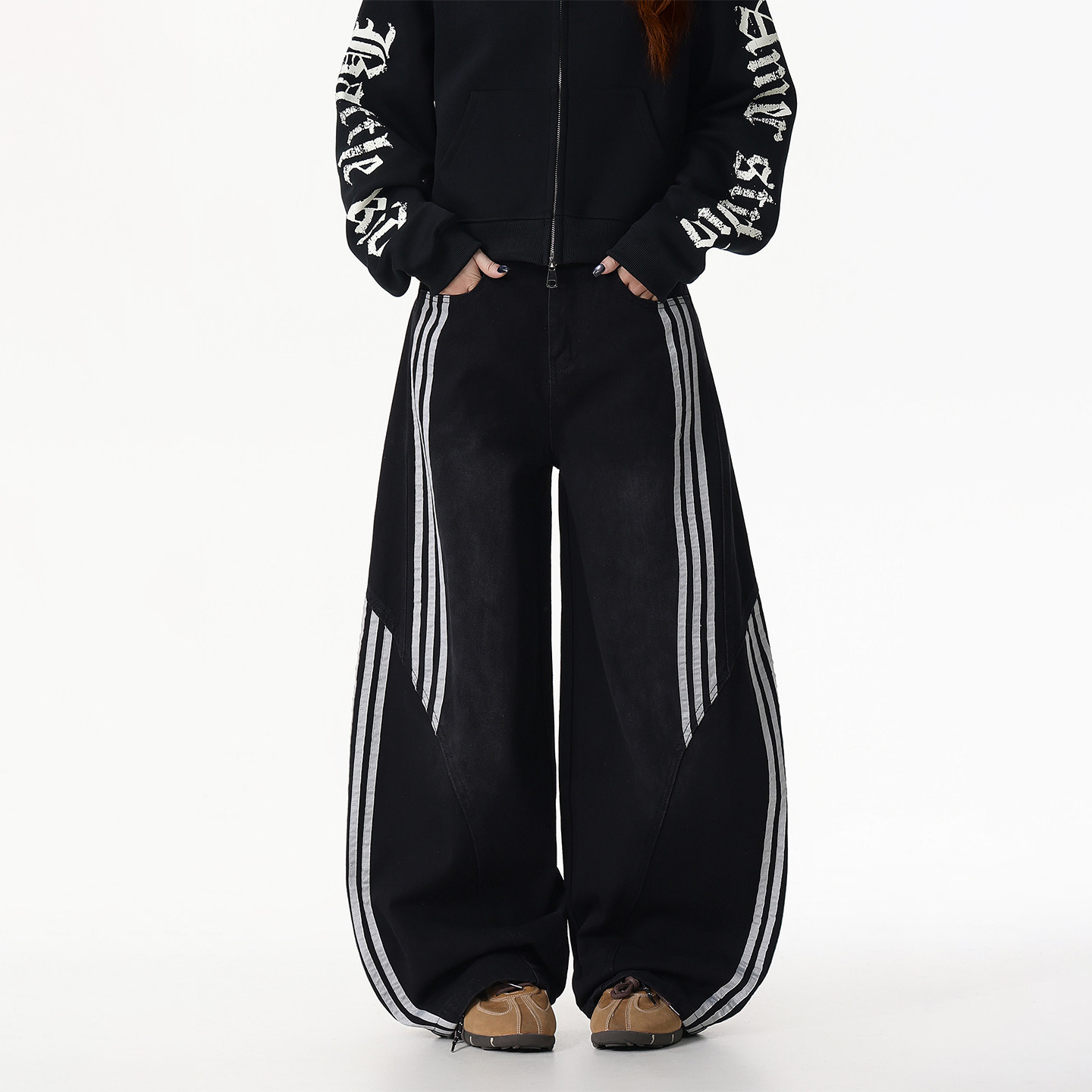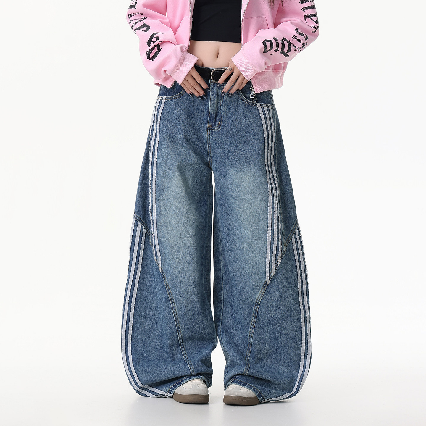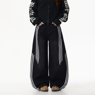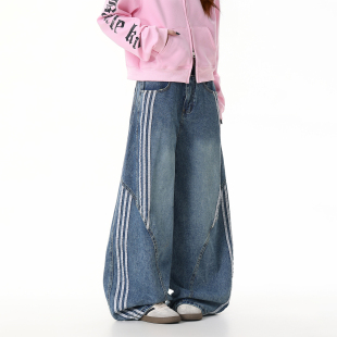 女条纹拼接阔腿裤 DARKAGE原创美式 复古水洗解构三条杠弯刀牛仔裤