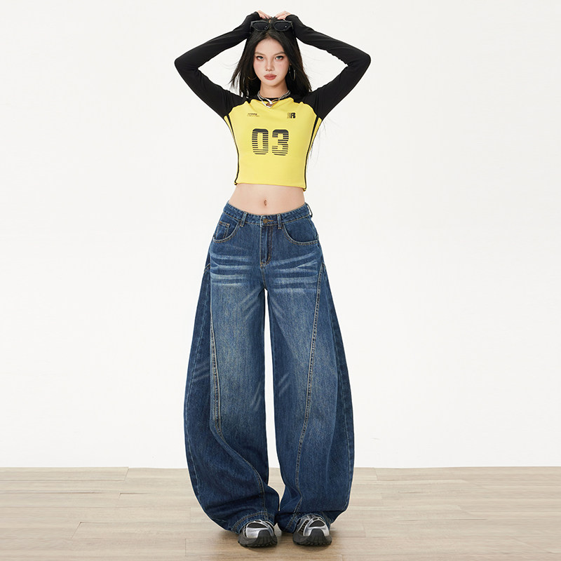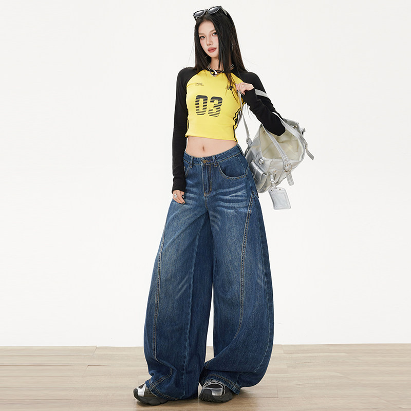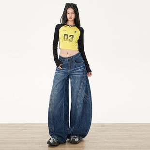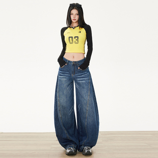 阔腿拖地裤 宽松美式 子 女秋冬新款 艾格Etam设计感猫抓痕弯刀牛仔裤