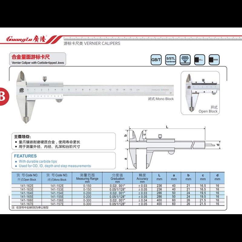 300mm 200 广陆镶合金游标卡尺硬质合金量爪测量面高精度0 150