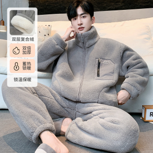 可外穿男防寒保暖双层复合绒家居服秋冬雪花绒睡衣套装 宽松法兰绒