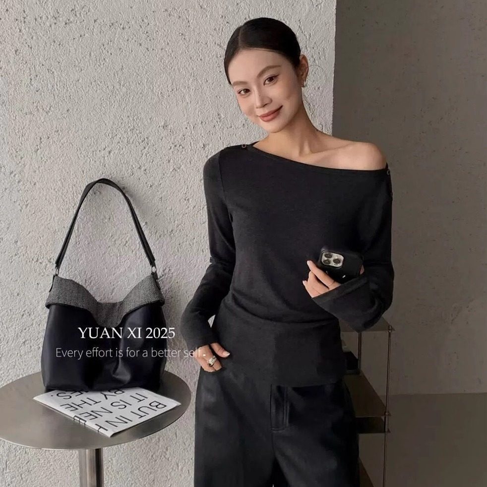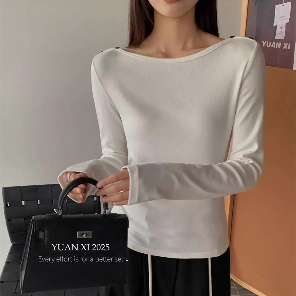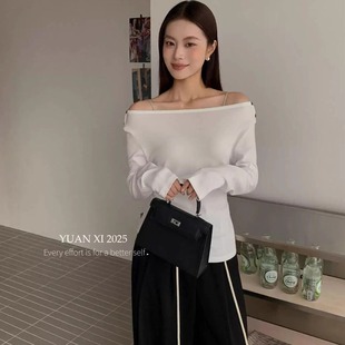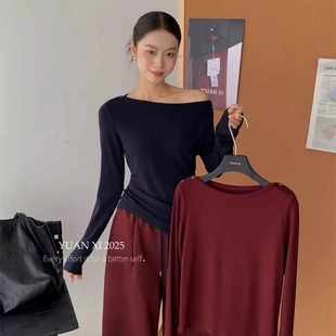 7145修身 元 打底衫 设计感平肩一字领长袖 显瘦斜肩上衣 熙yuanxi秋款