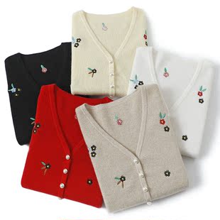 纯羊绒毛衣针织开衫 女短款 小外套 重工刺绣V领羊绒开衫 温婉大方