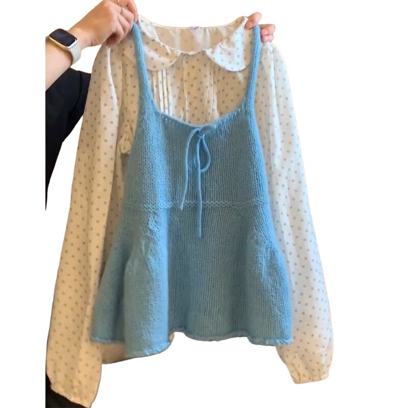 入秋穿搭一整套甜美减龄风气质内搭娃娃领波点衬衫 针织吊带背心