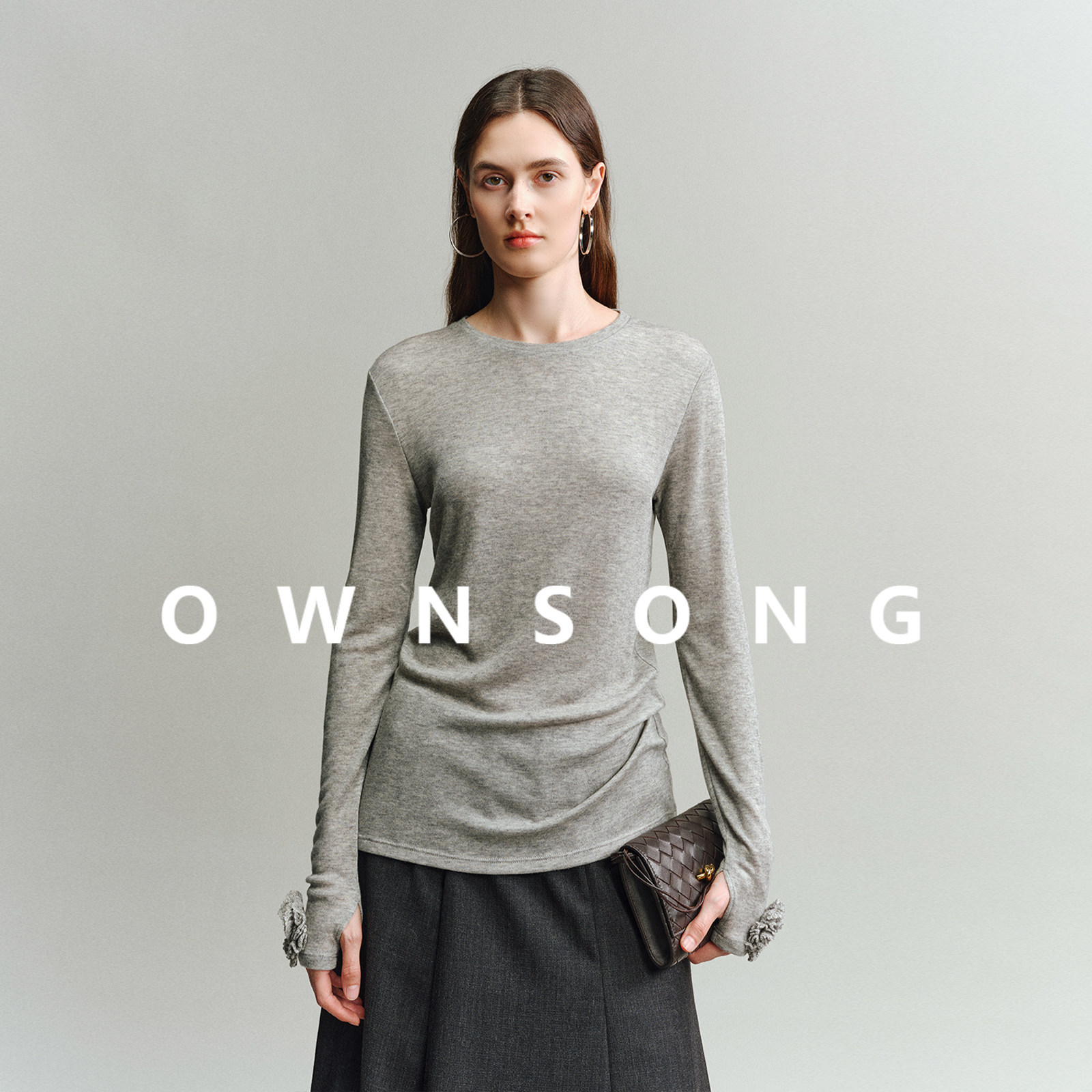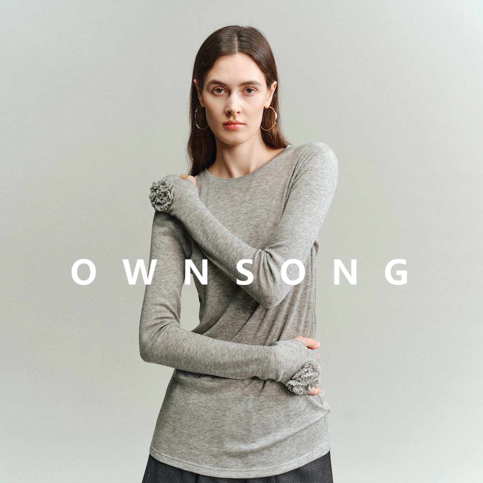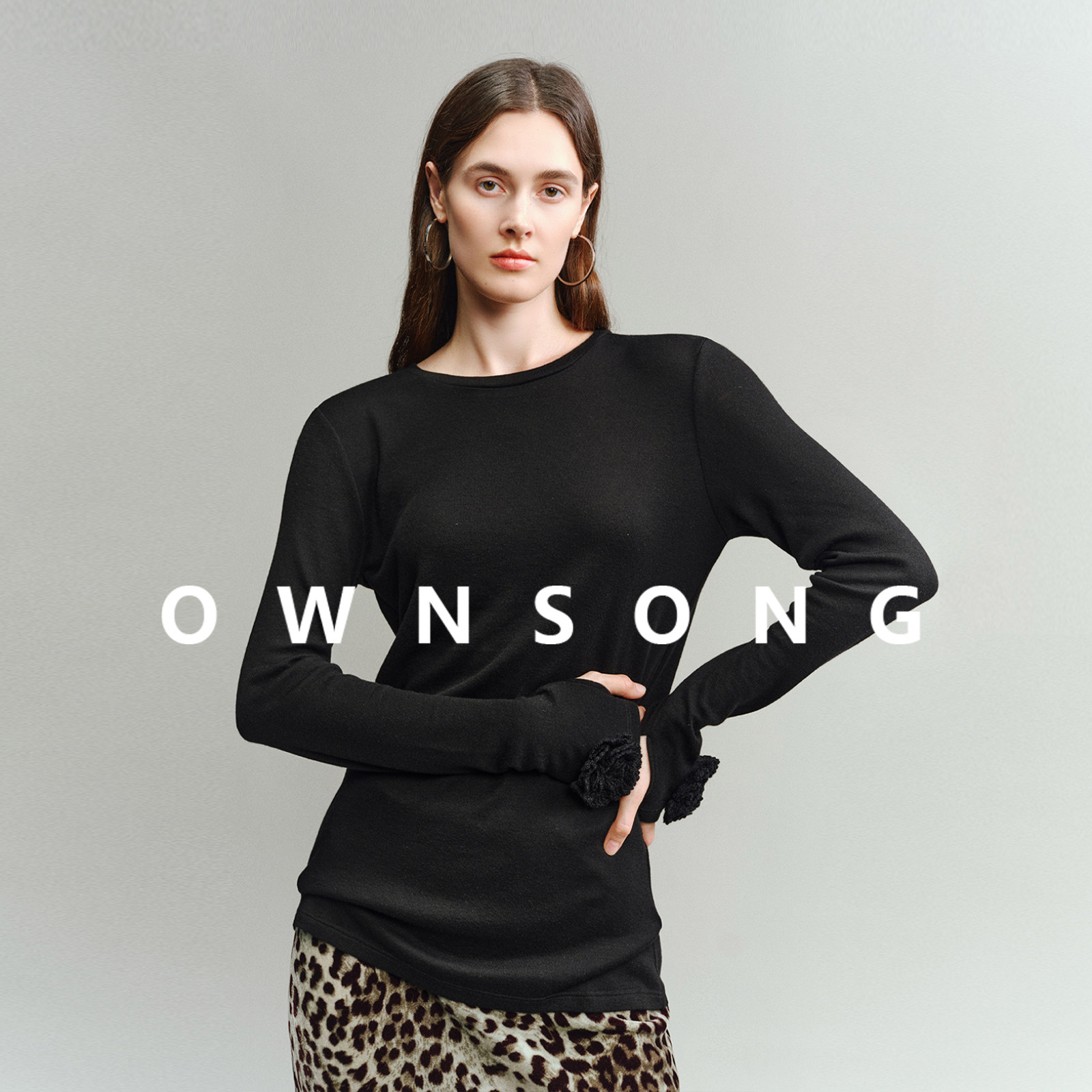 女25春显瘦百搭简约T 打底衫 OWNSONG云感天丝羊绒衫 手工钩花长袖