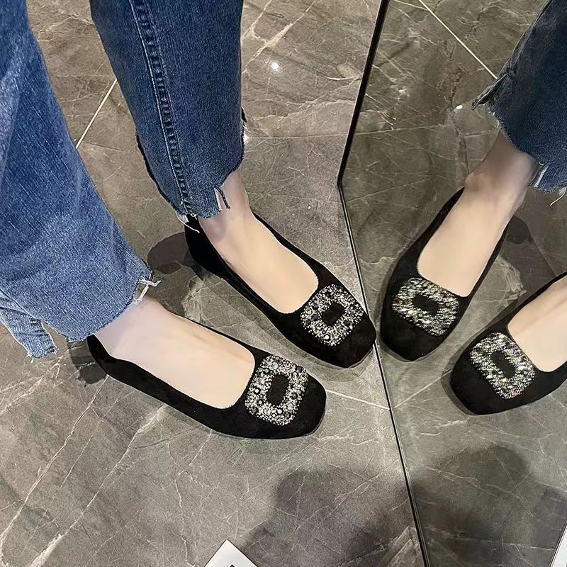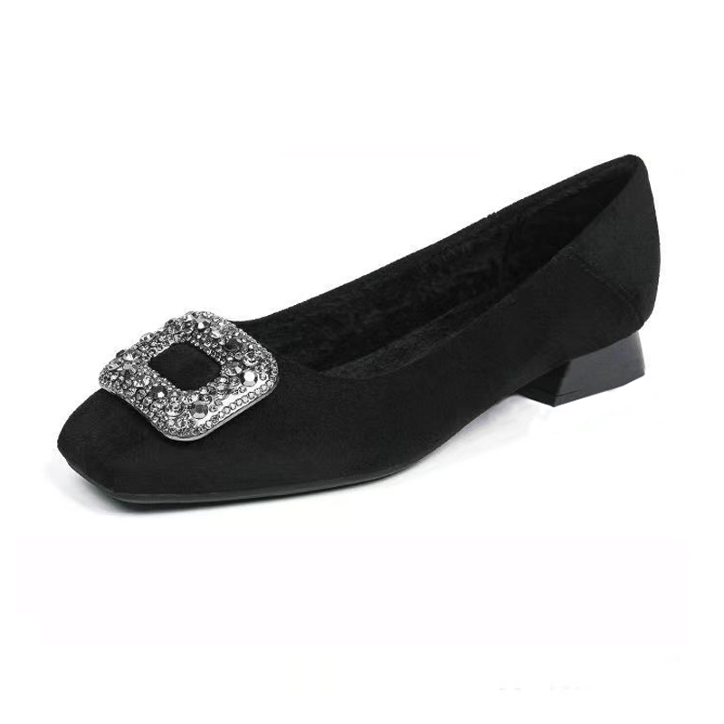 黑色低跟职业工作鞋 单鞋 一脚蹬绒面水钻法式 春秋浅口百搭布鞋 女鞋