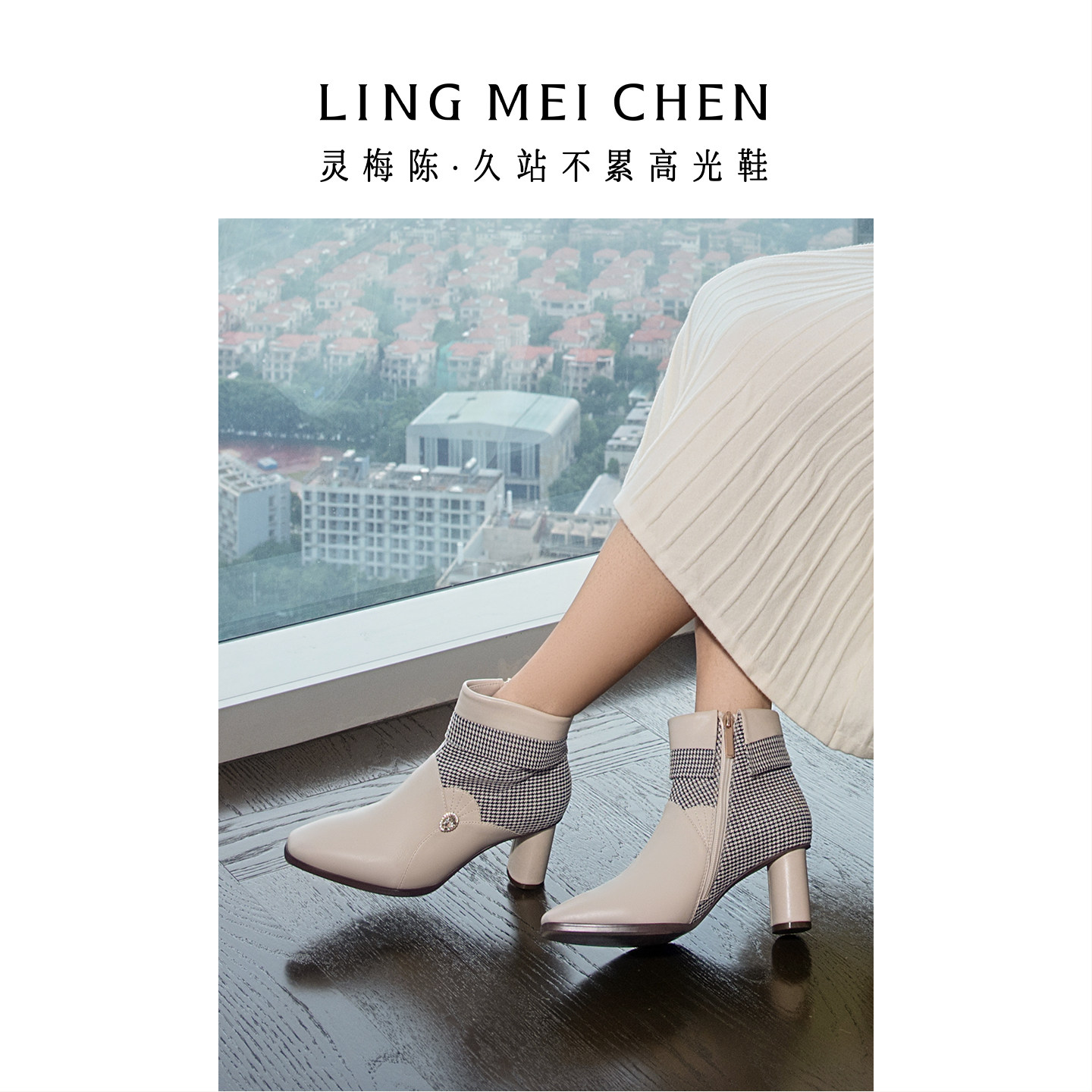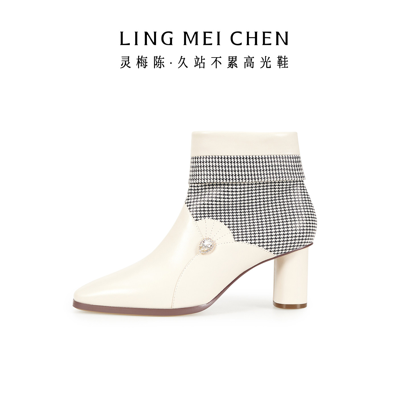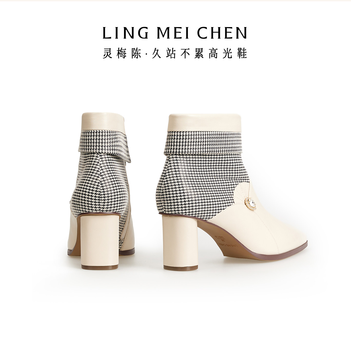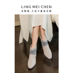 LINGMEICHEN千鸟格白色靴子2025新款 小短靴英伦风皮靴女高跟靴子