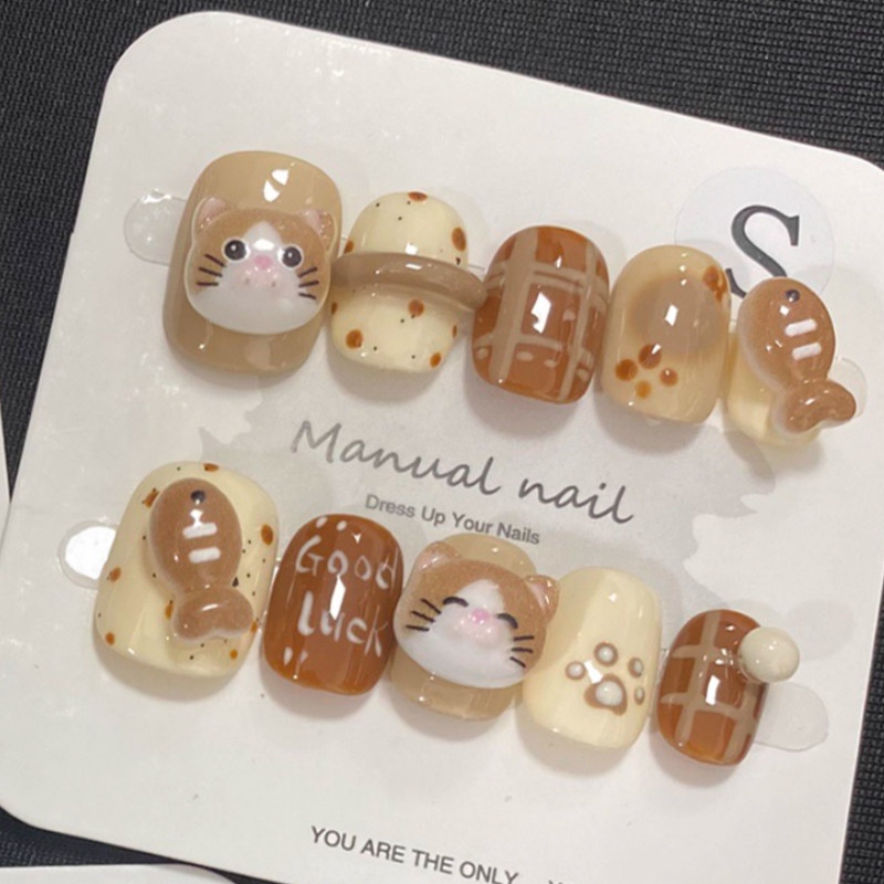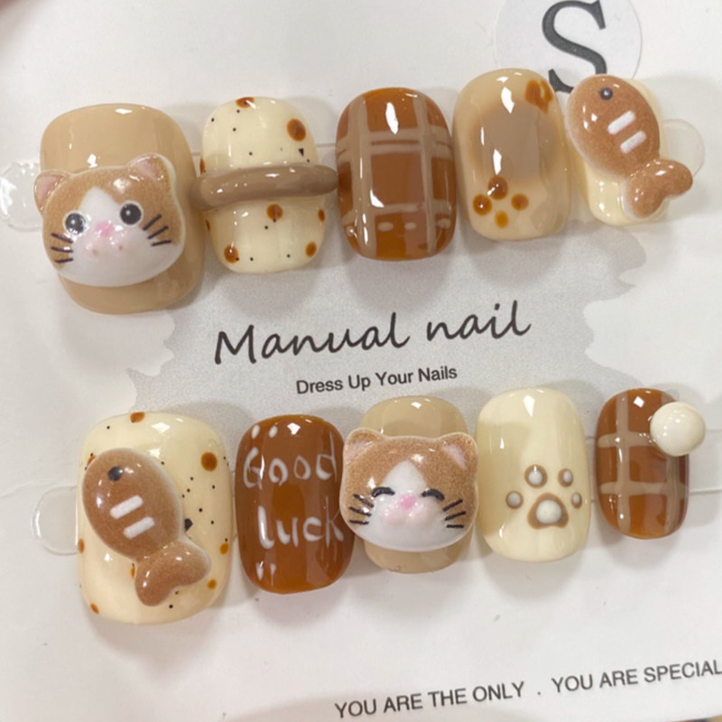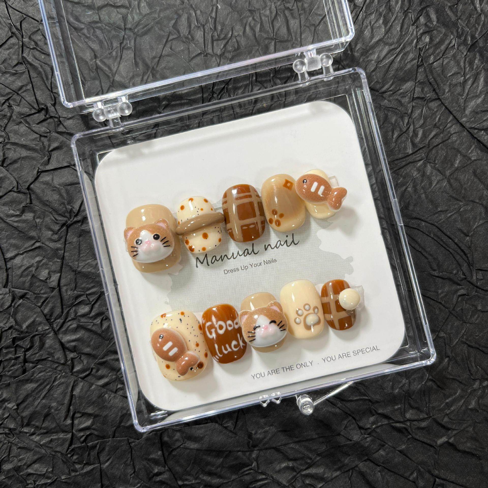 儿童纯手工制作穿戴甲卡通少女短圆猫咪鱼学生美甲贴片可拆卸