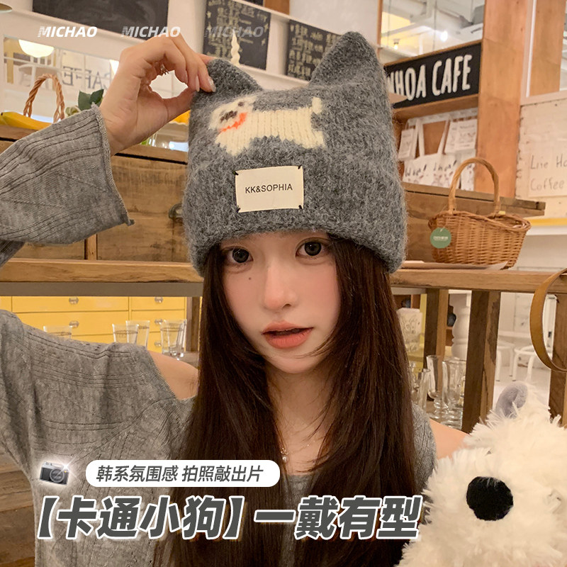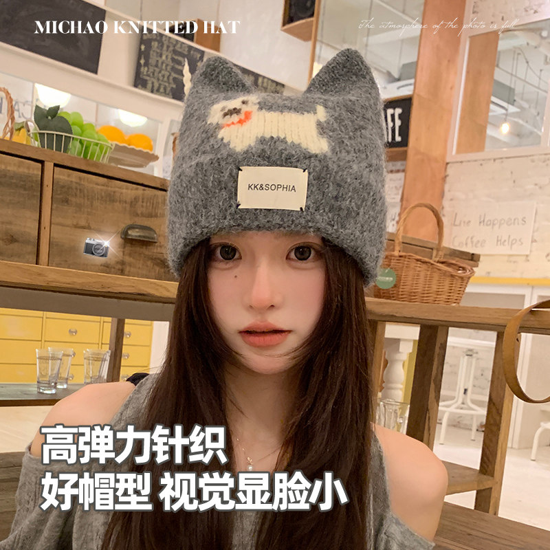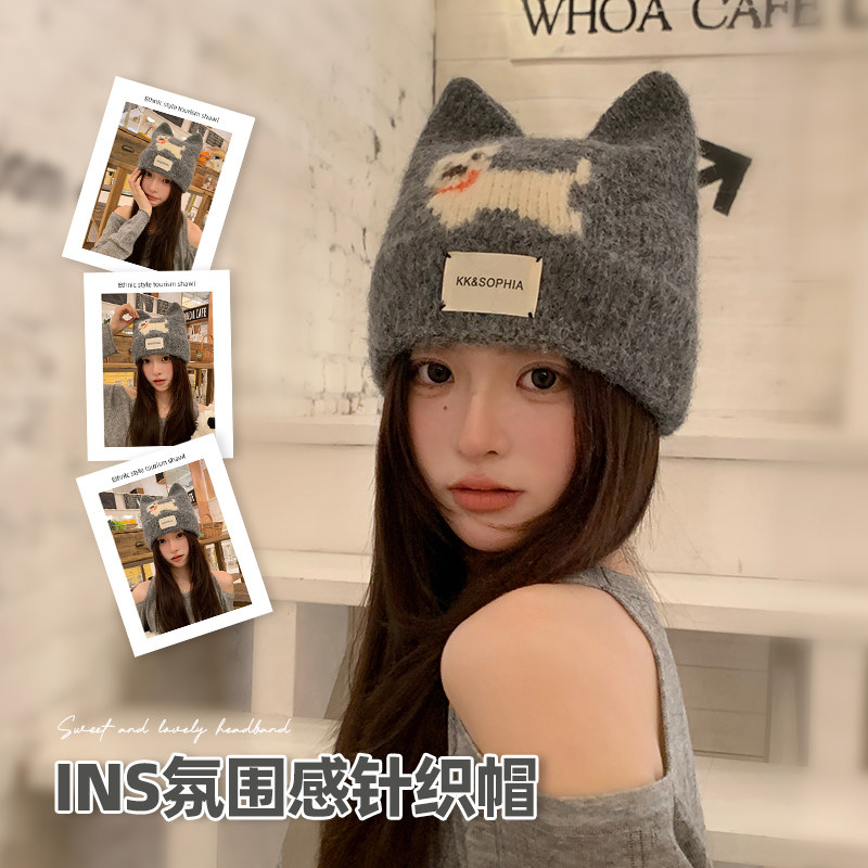 可爱猫耳帽子女秋冬保暖大头围毛线帽2025新款 显脸小护耳针织冷帽