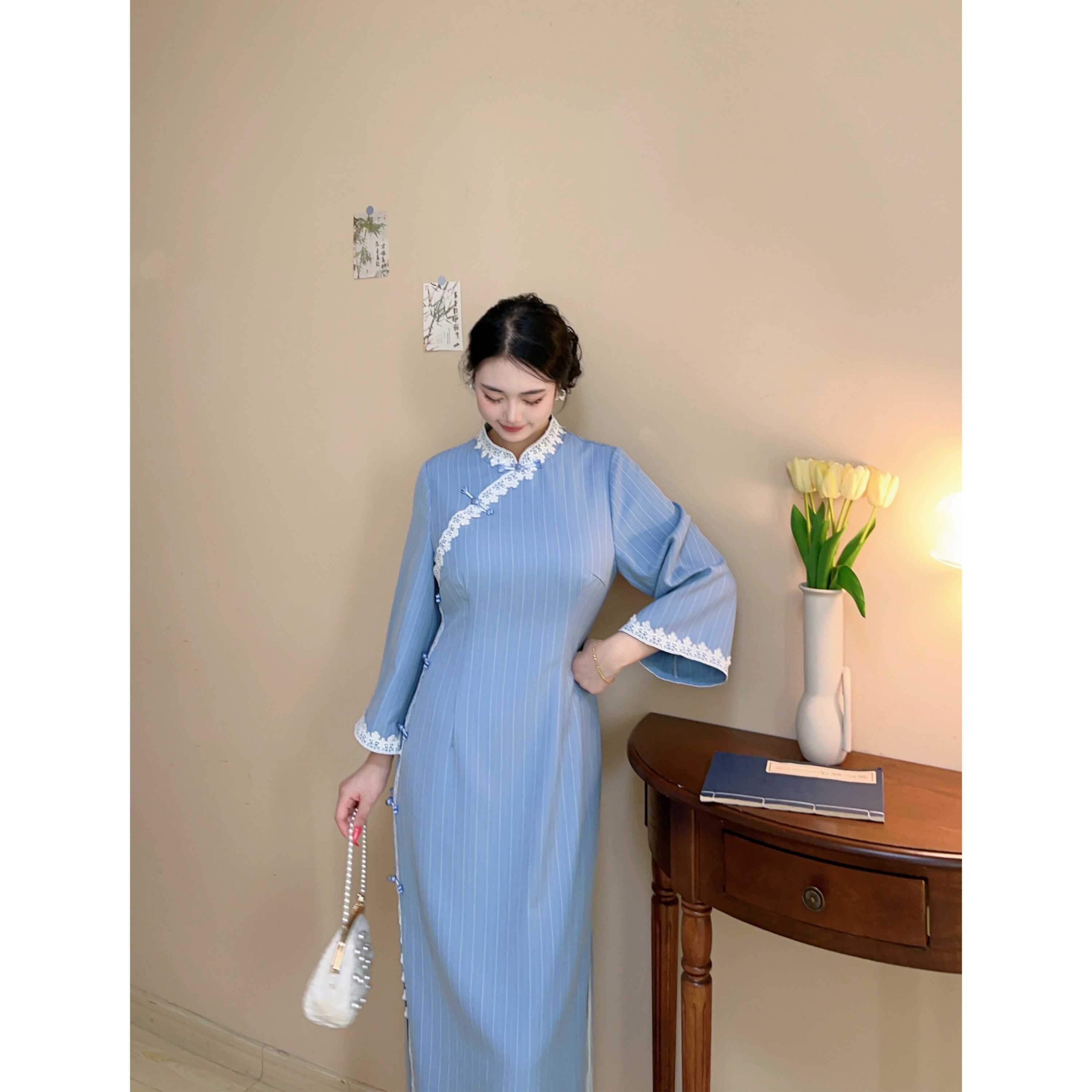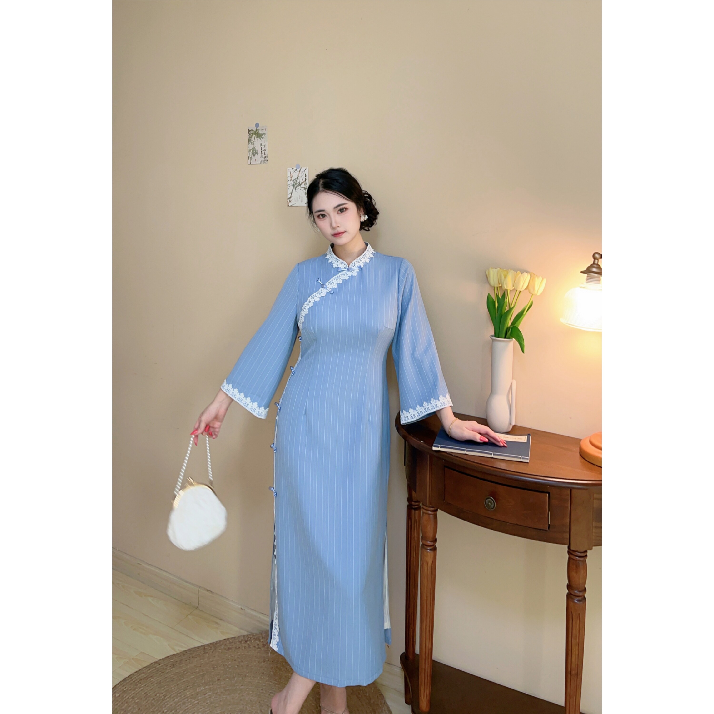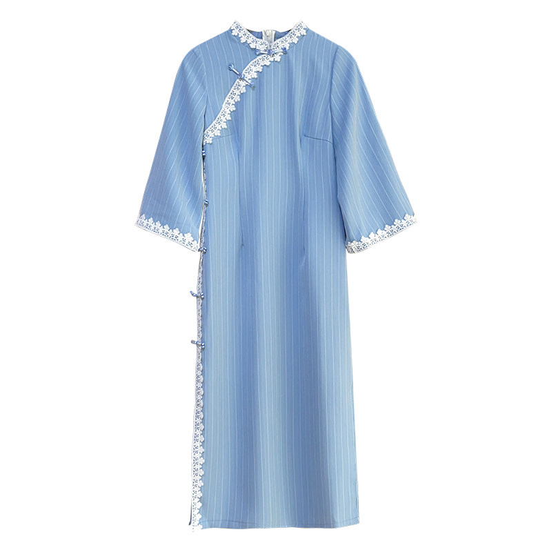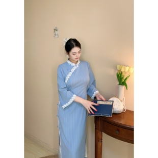 胖mm新中式 林徽因 文艺大码 蓝色条纹日常款 旗袍连衣裙 自制款