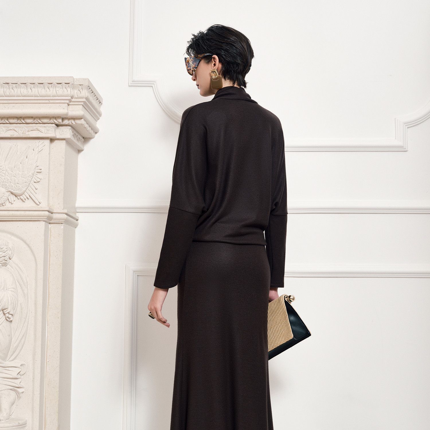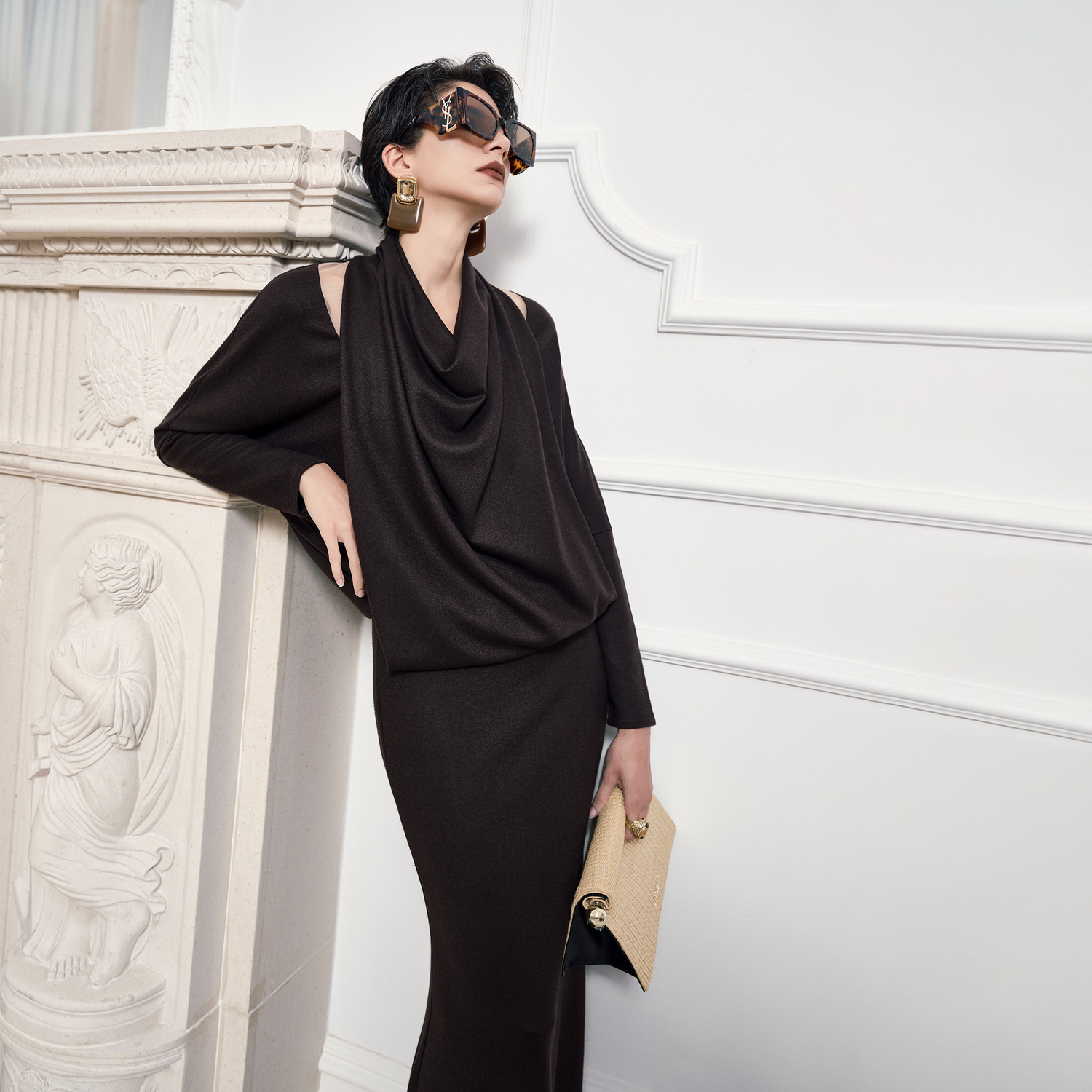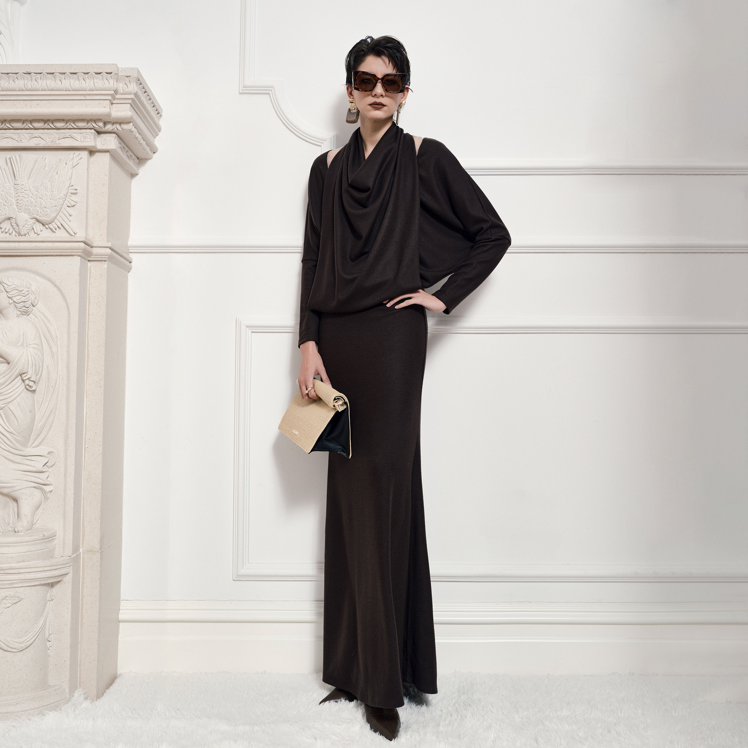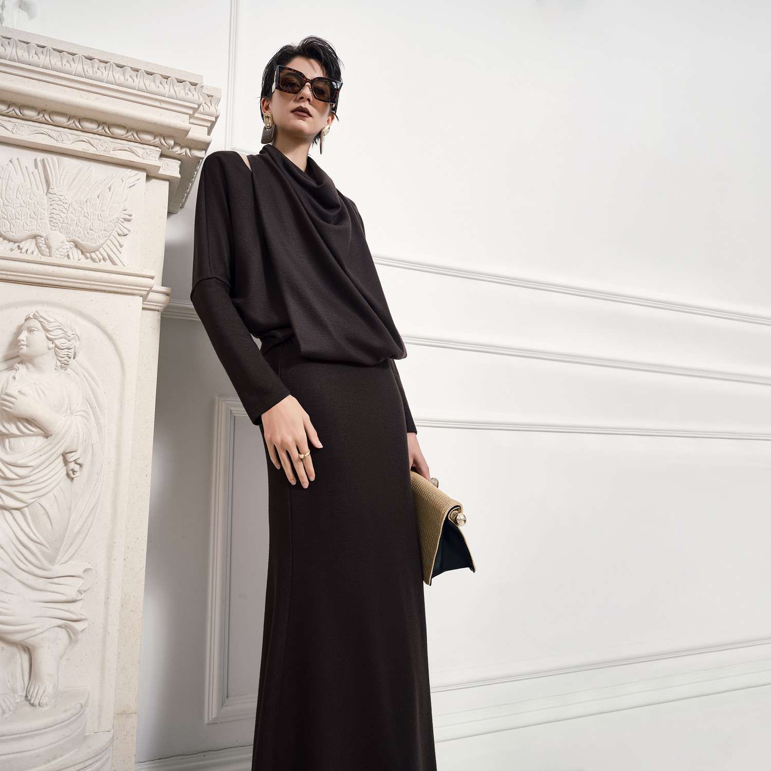 新款 针织羊毛荡领收腰连衣裙2025冬季 收腰长裙子 伊南娜光 TU女装