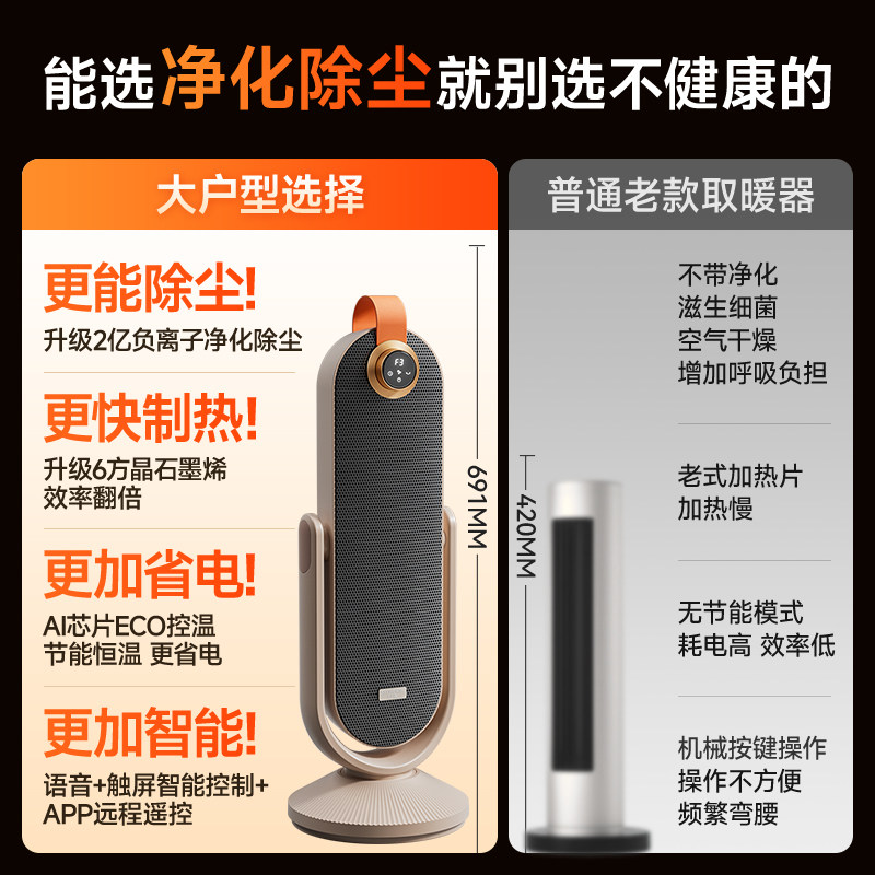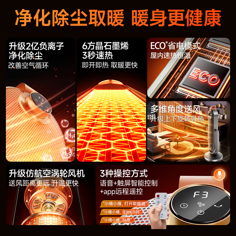 美 火焰塔大面积语音石墨烯电暖气神器 暖风机取暖器家用2025新款