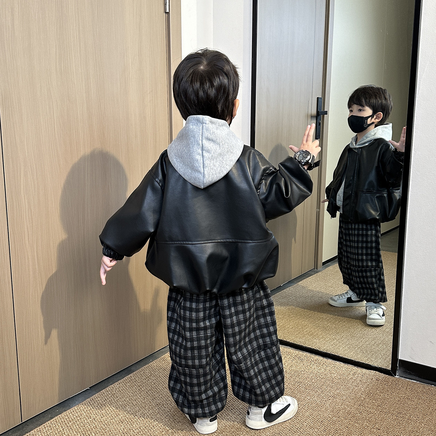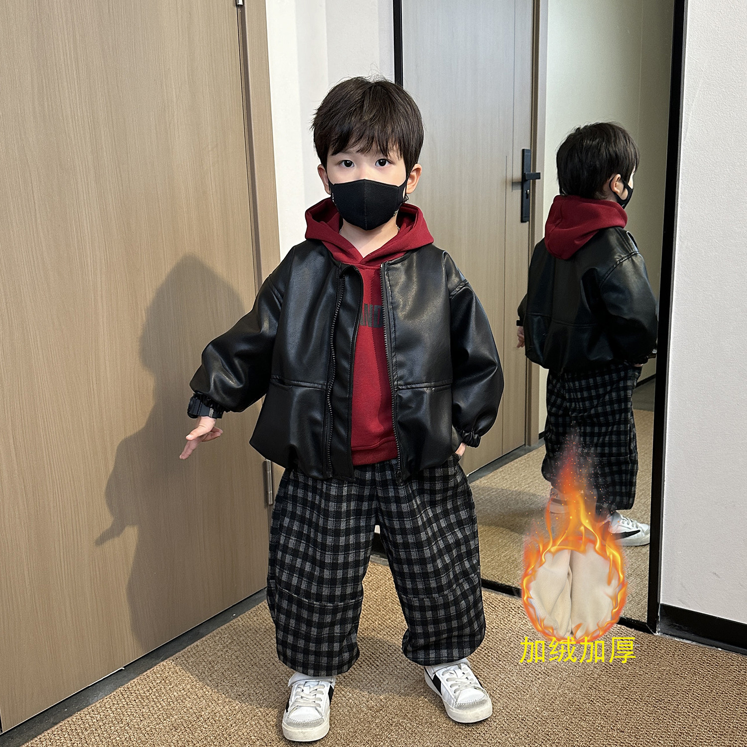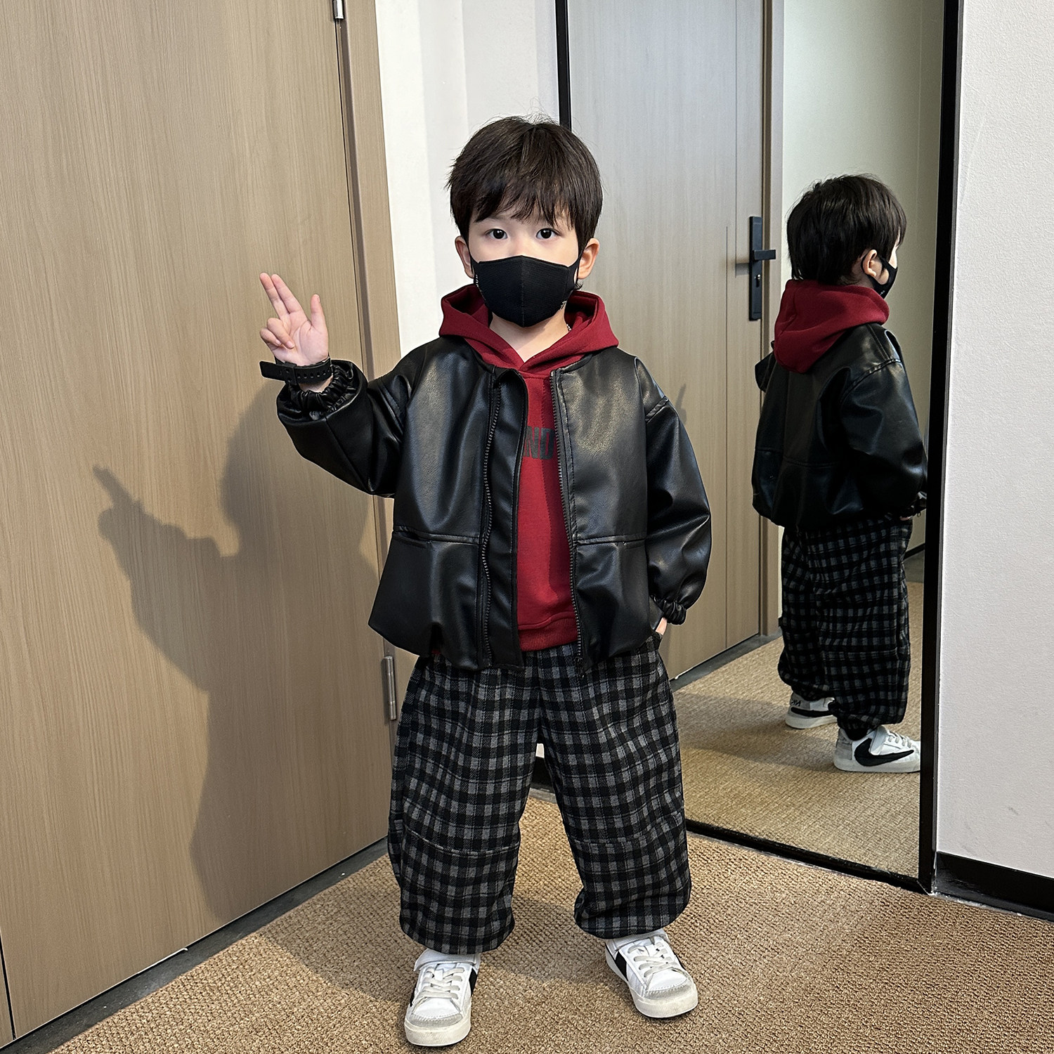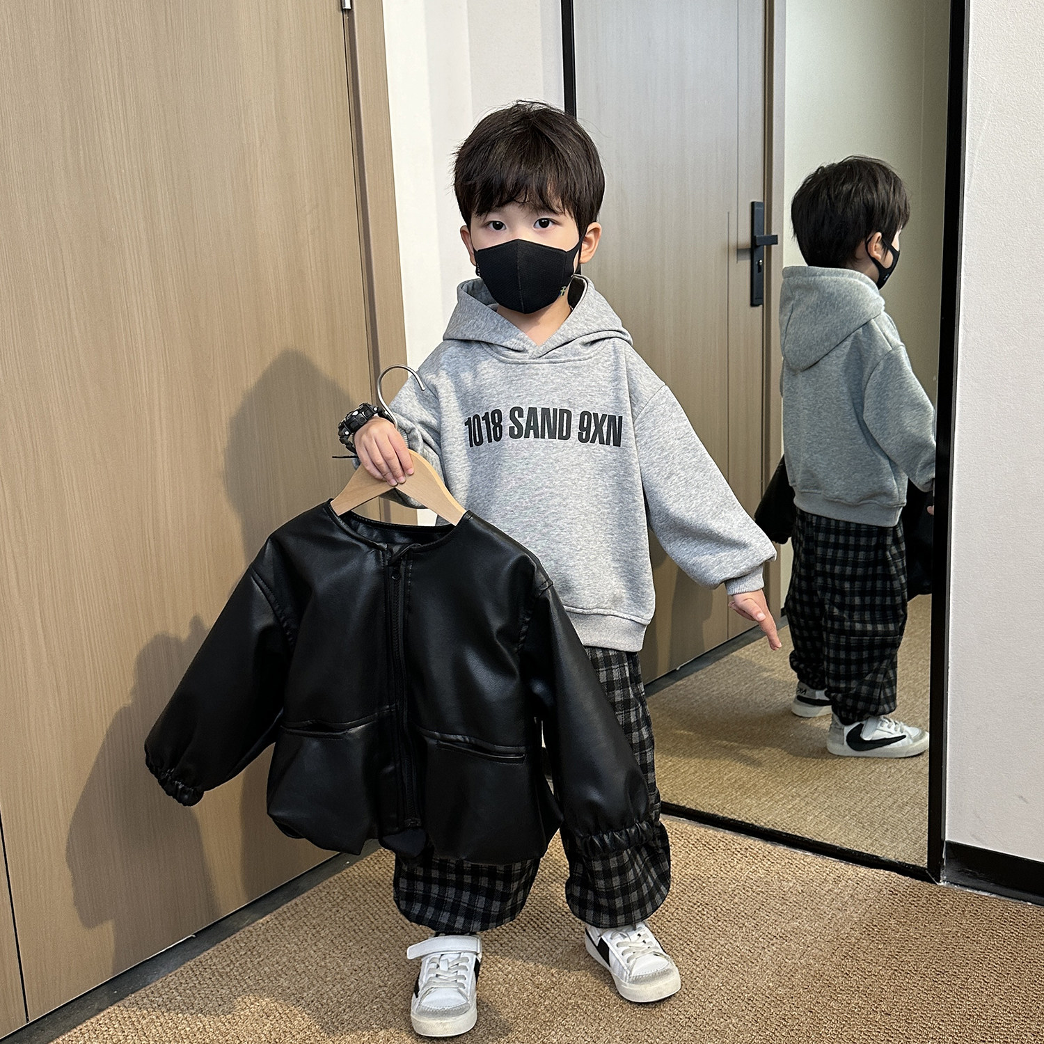 帅气儿童男孩宝宝加厚皮衣三件套 2025新款 男童加绒卫衣秋冬装 套装