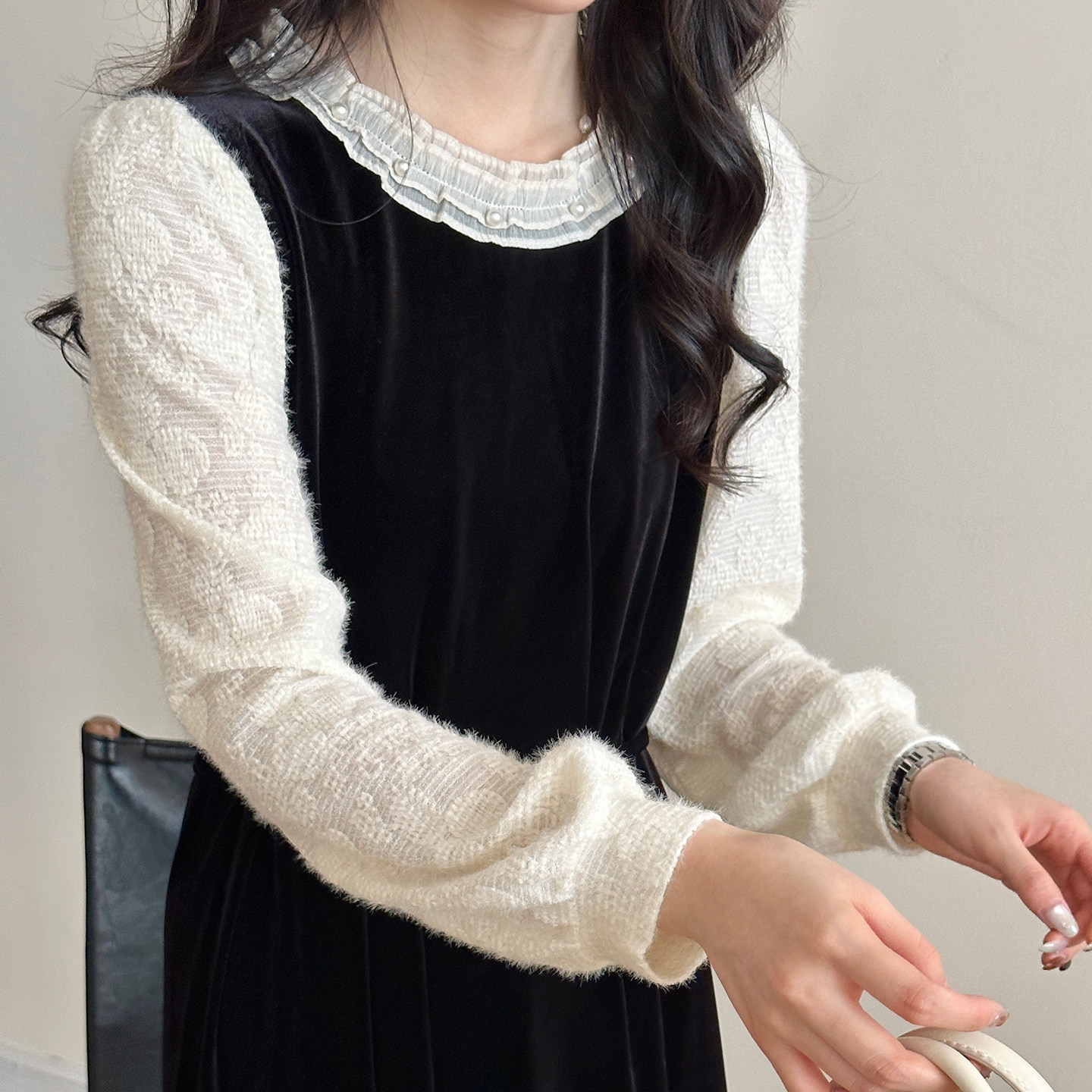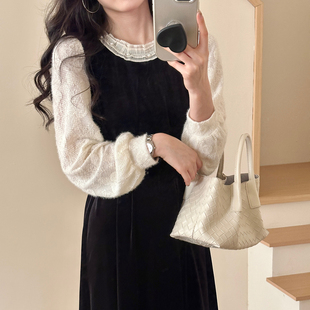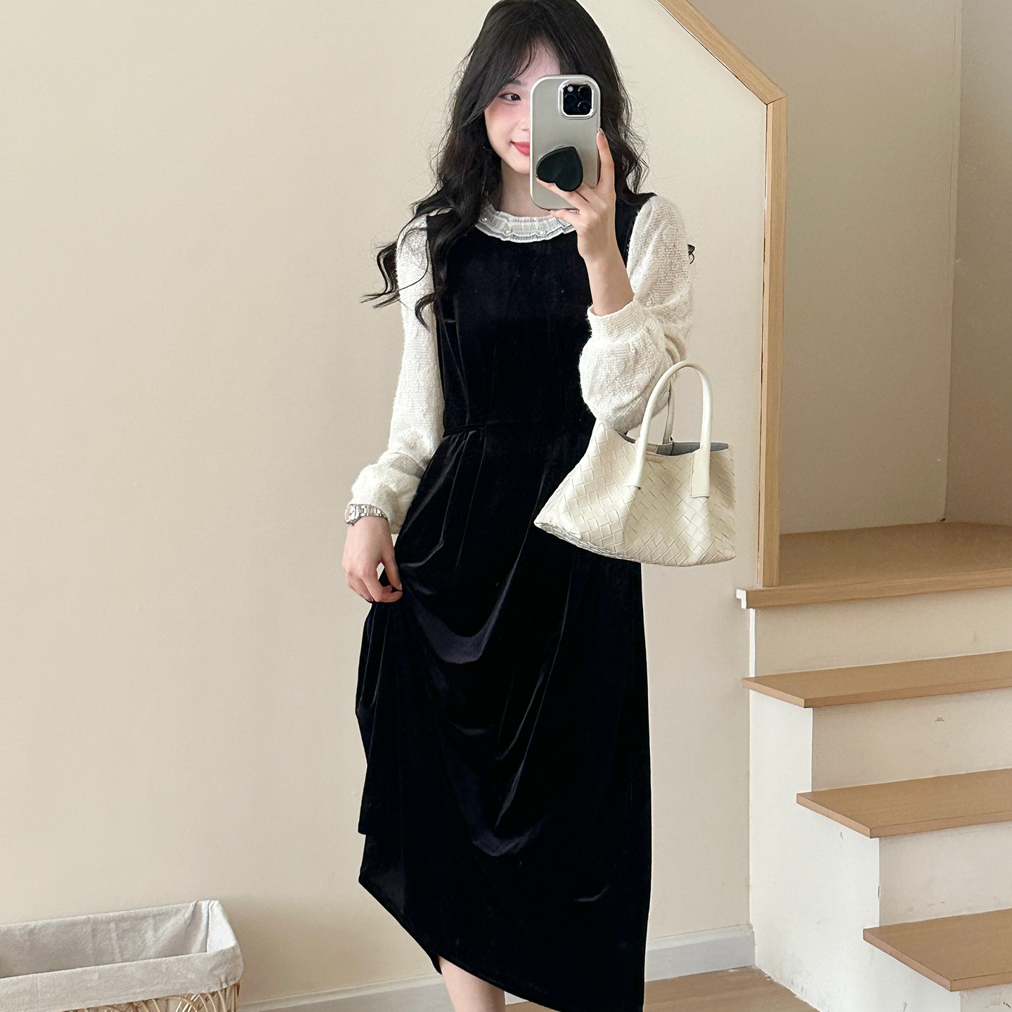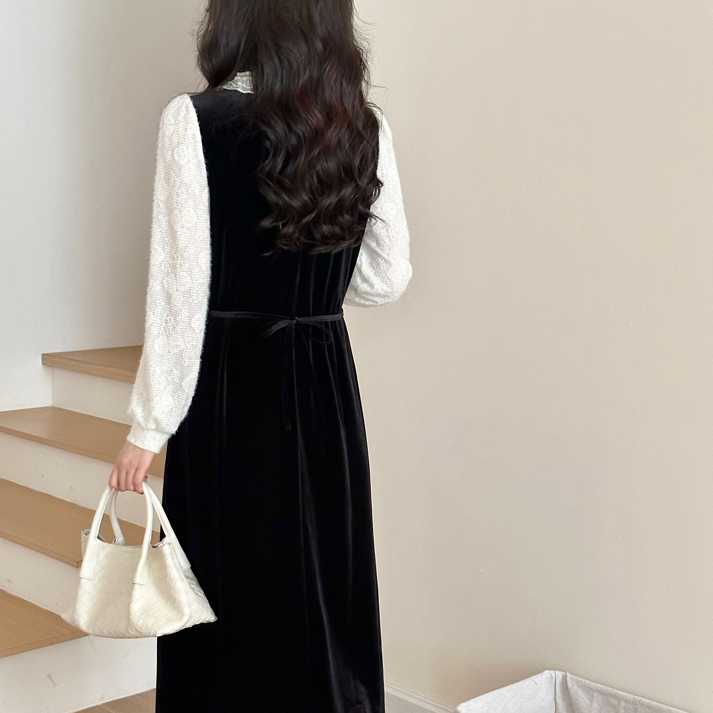 糖安妮 2025秋冬黑色拼接磨毛丝绒连衣裙女宽松显瘦 精致丝绒裙